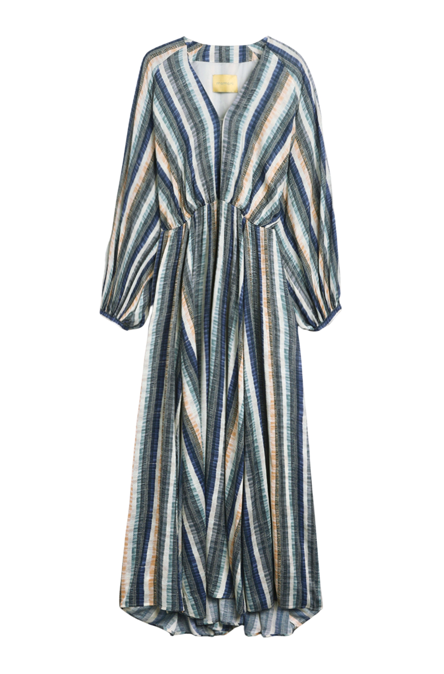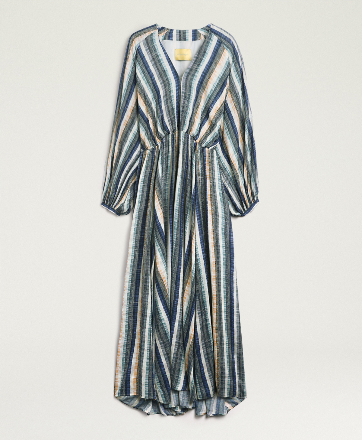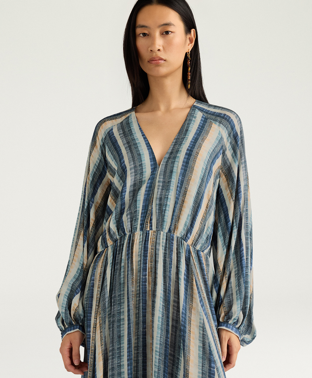 La costruzione di Francisco prevede un corpino arricciato e una ampia gonna anchessa arricciata, che creano un volume morbido e arioso senza rinunciare a una linea slanciata. La manica raglan, ricca e leggermente a sbuffo, è raccolta al fondo da un polso basso ad anello che aggiunge un dettaglio sartoriale e romantico.