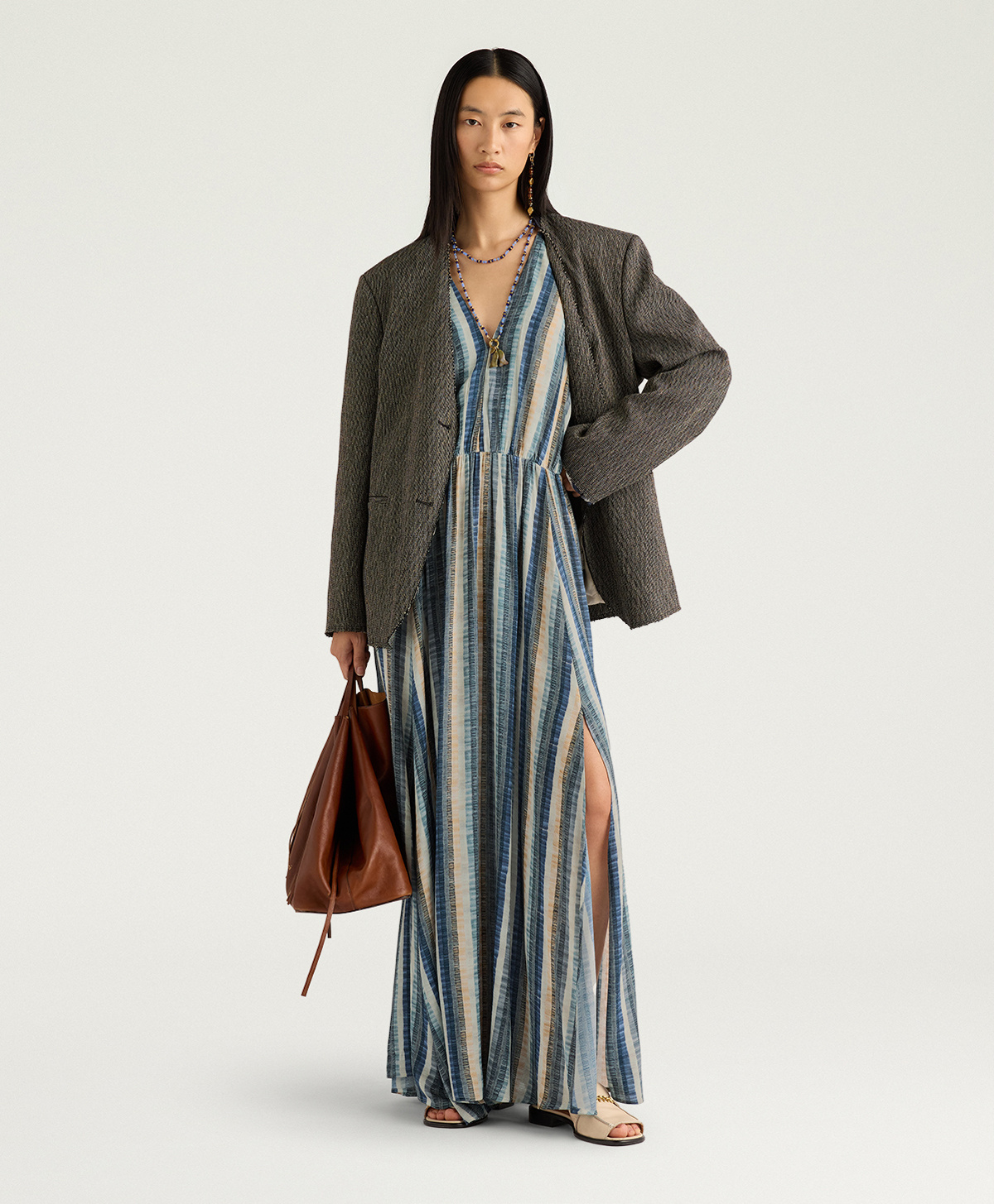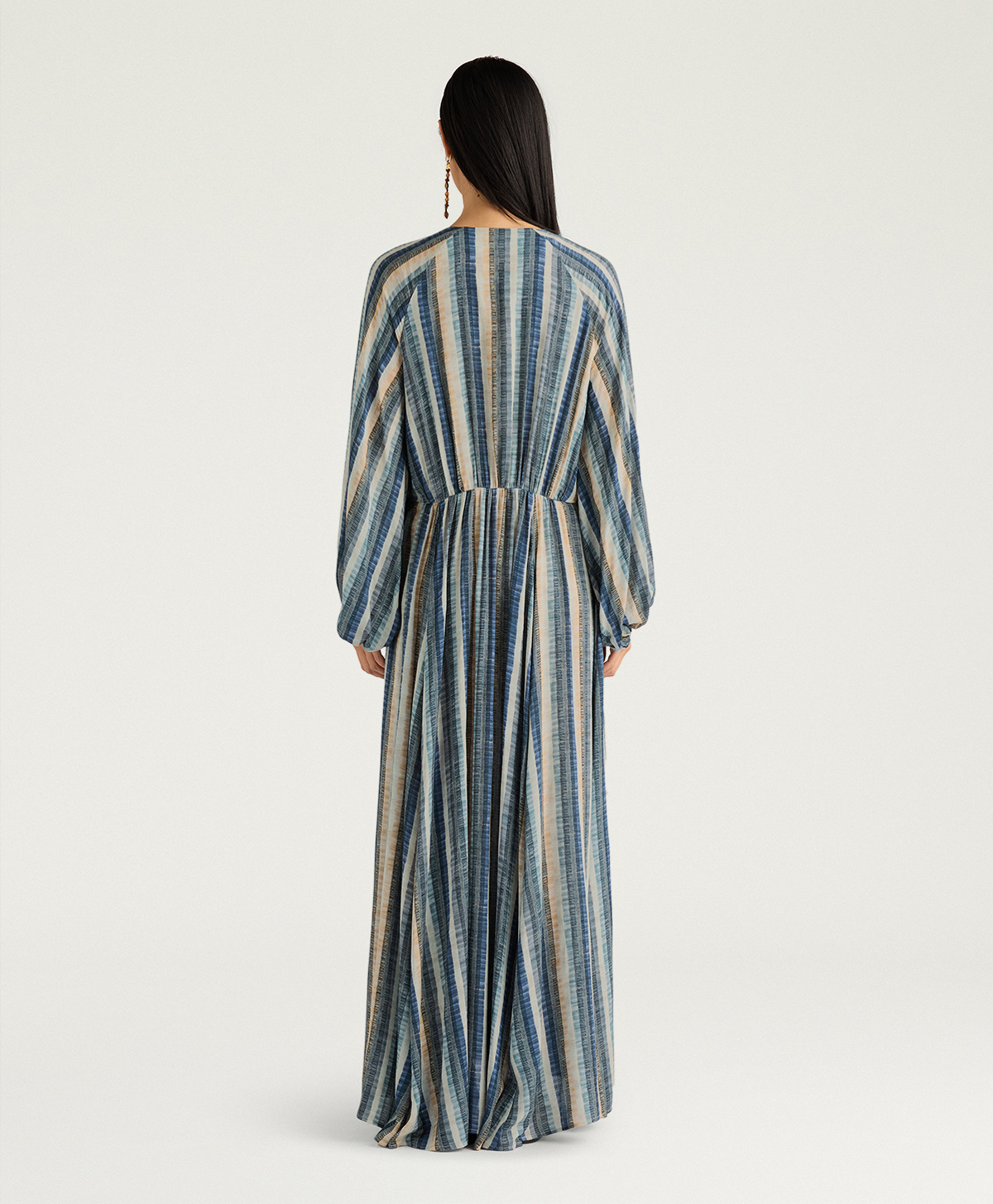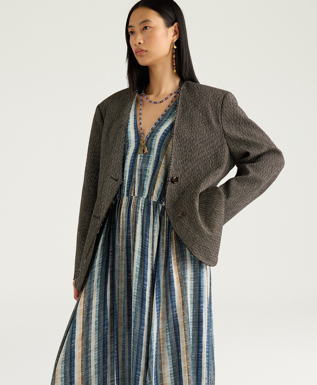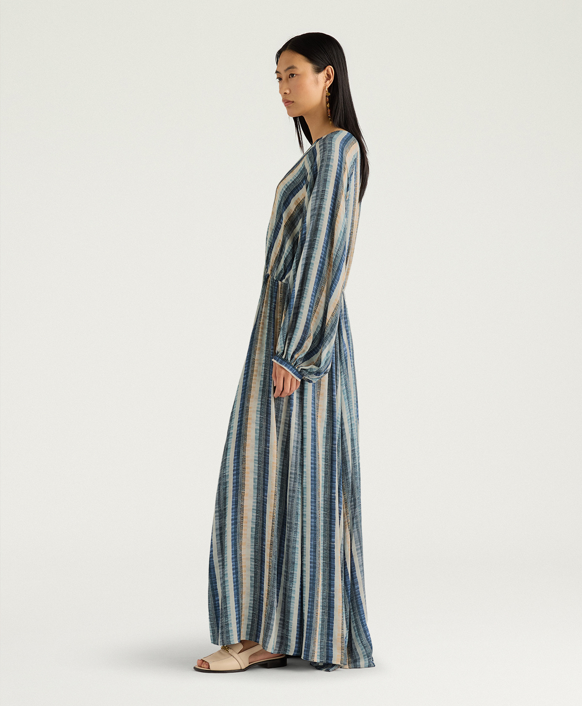 La costruzione di Francisco prevede un corpino arricciato e una ampia gonna anchessa arricciata, che creano un volume morbido e arioso senza rinunciare a una linea slanciata. La manica raglan, ricca e leggermente a sbuffo, è raccolta al fondo da un polso basso ad anello che aggiunge un dettaglio sartoriale e romantico.