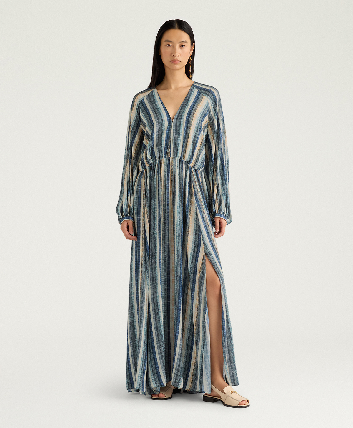 Momonì vestito Francisco lungo in viscosa stampata multicolor polveroso con doppi spacchi