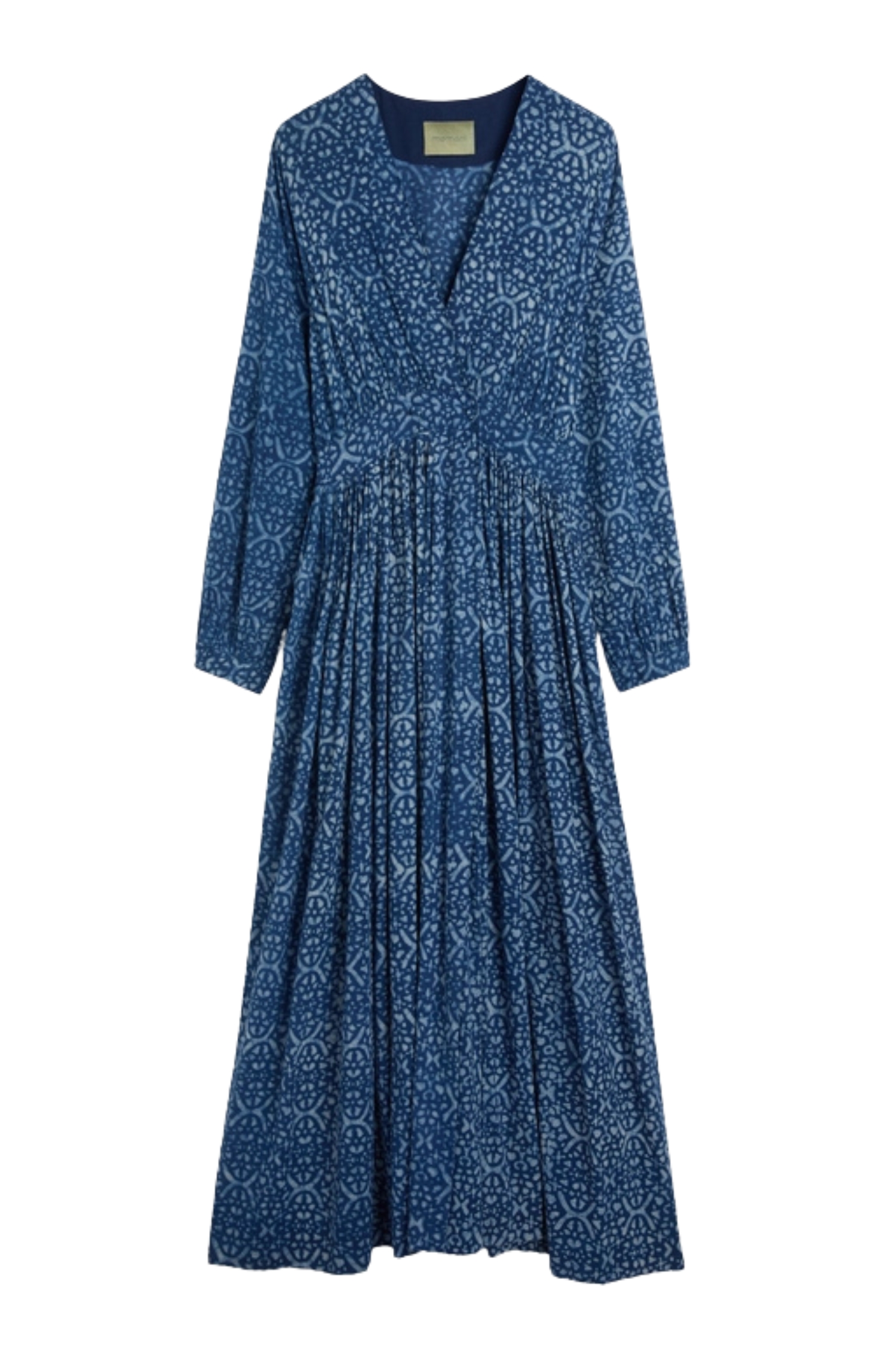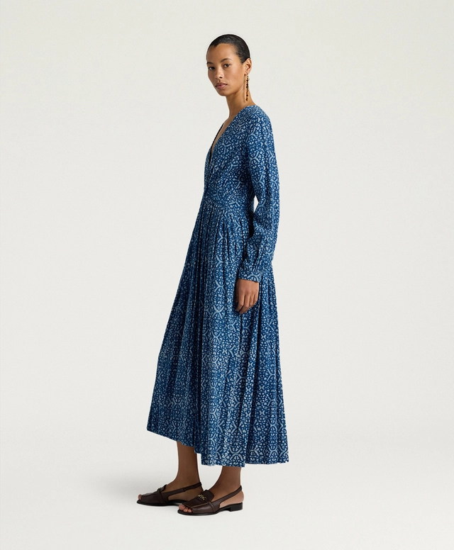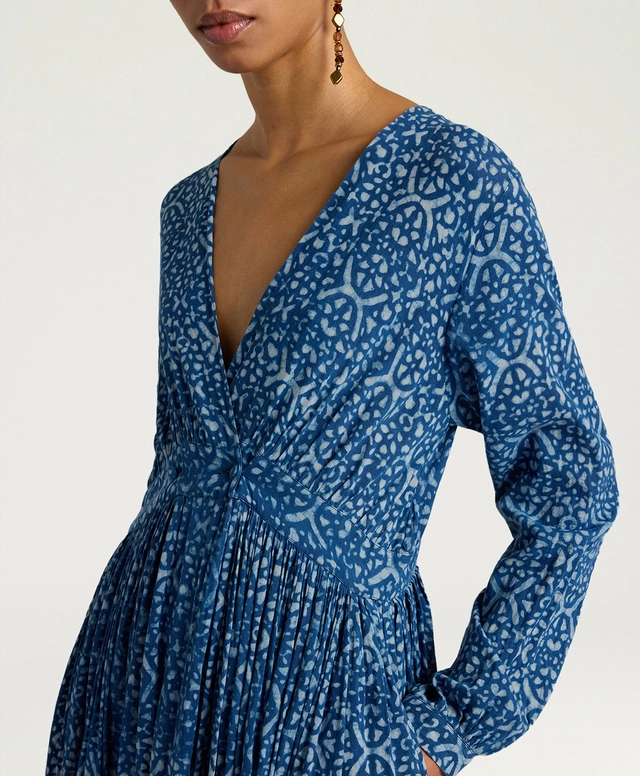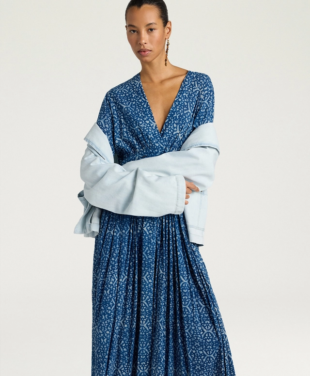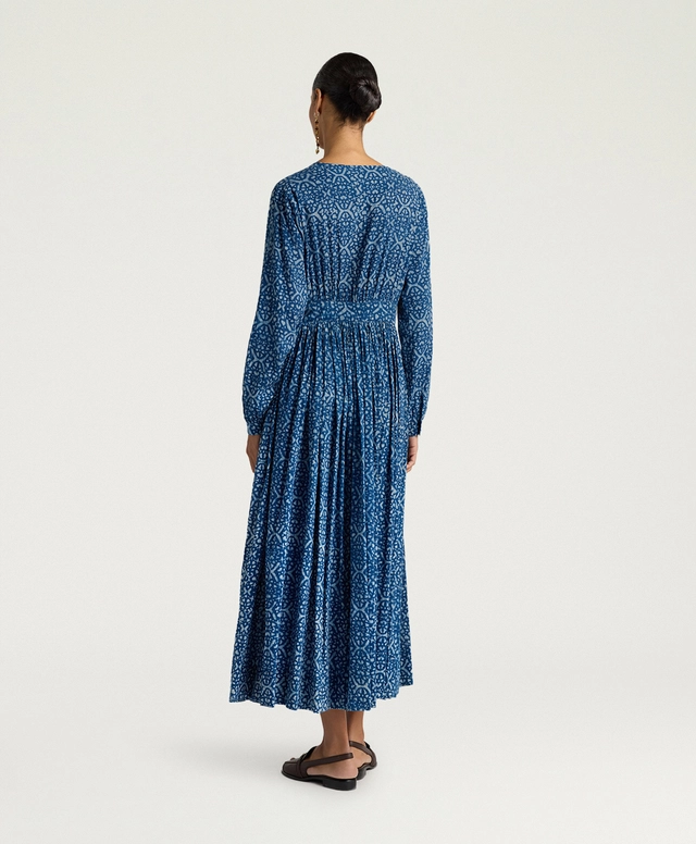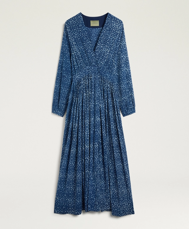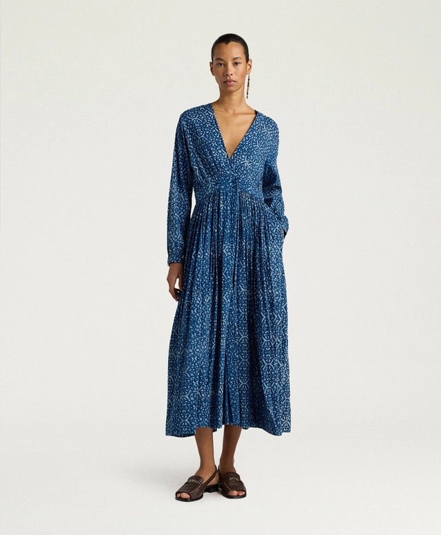 Le maniche a tubo, ampie e ricche, sono rifinite da arricci e polsino a camicia, per un effetto ricercato ma quotidiano allo stesso tempo. Con vestibilità regolare e fodera in cotone, Jurema è perfetto con sandali flat o tacchi per eventi estivi, interpretando la tintura naturale indaco in chiave elegante e contemporanea.