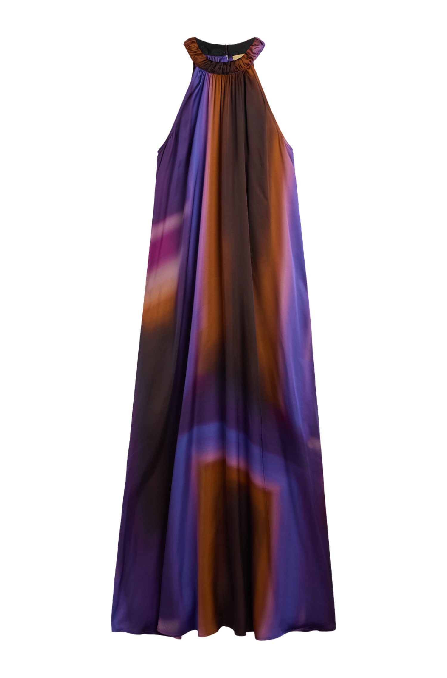 La costruzione semplice e scivolata permette di indossarlo da solo oppure con una cintura in vita per enfatizzare la silhouette, mentre la fodera in cupro assicura una piacevole sensazione sulla pelle e una perfetta vestibilità. Un abito chiave per chi ama i vestiti lunghi stampati Momonì, facili da indossare ma ad alto impatto visivo.