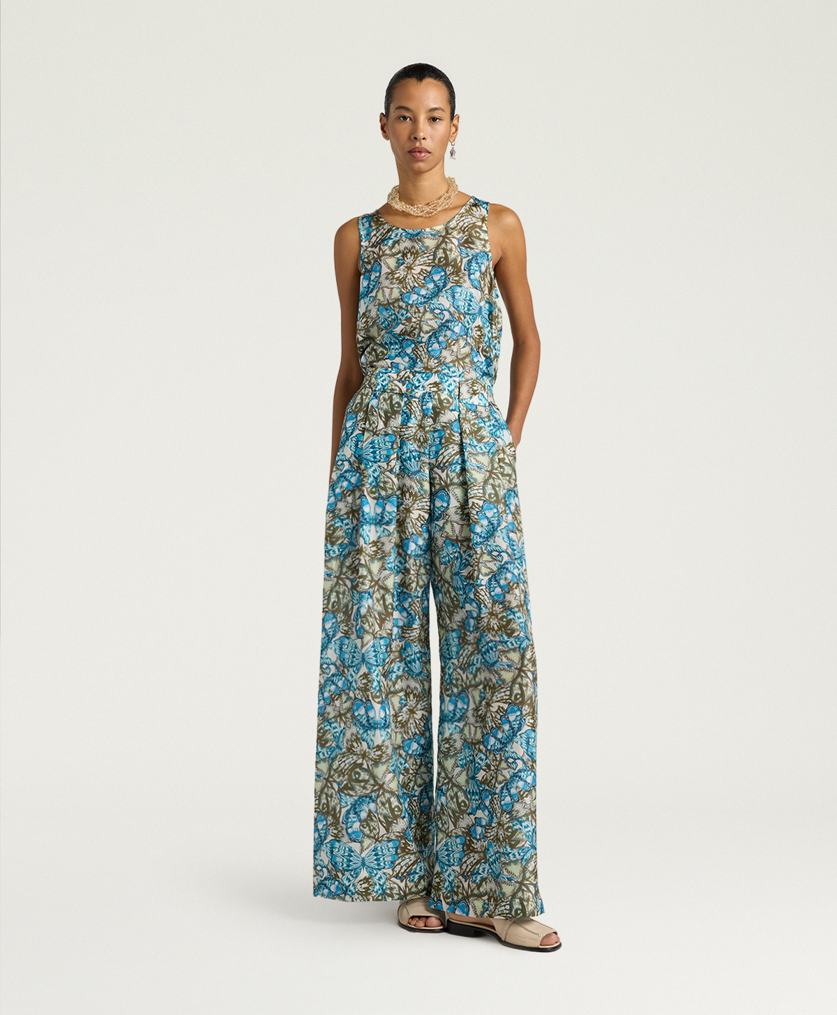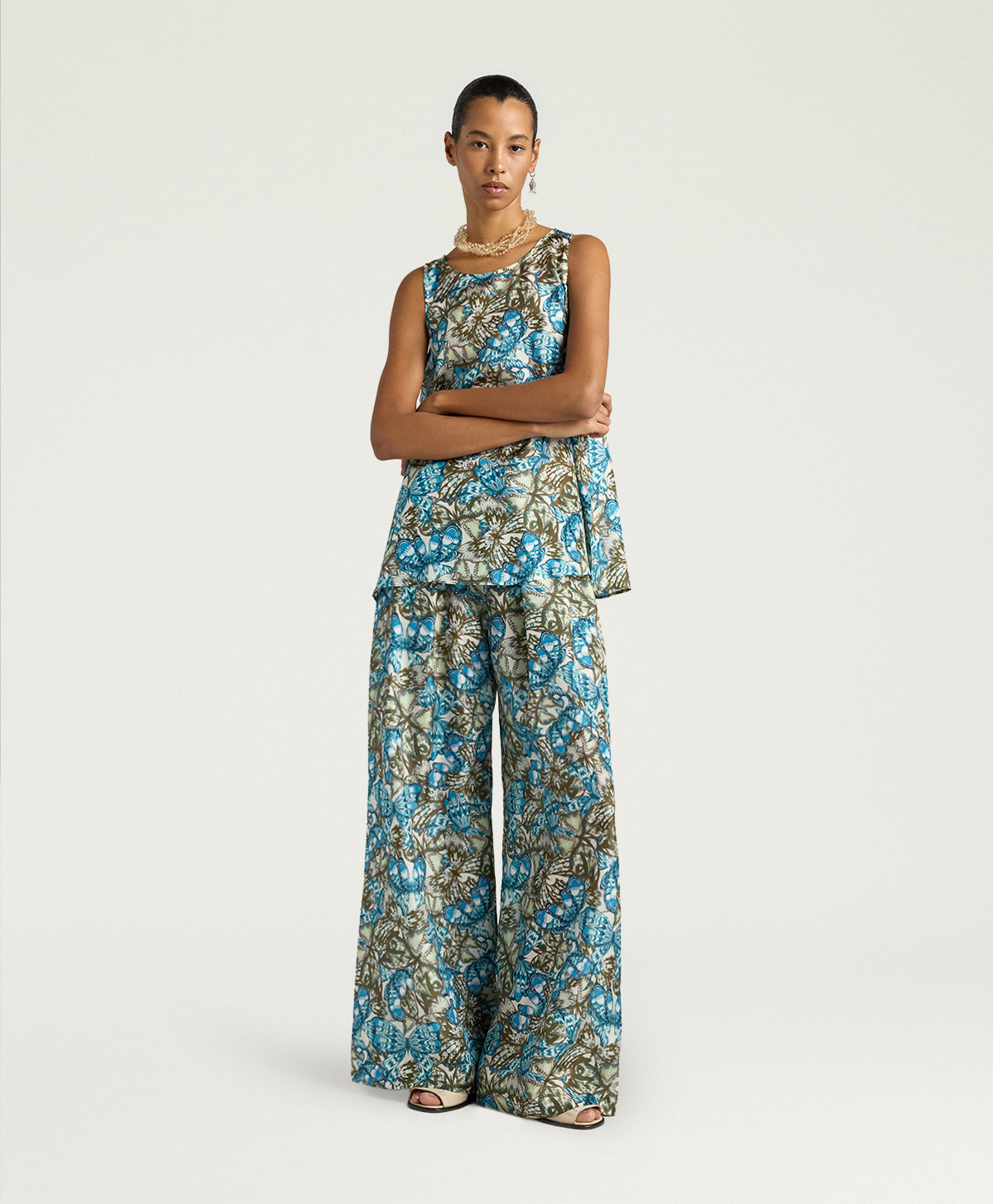 Aspen è il pantalone a palazzo iconico Momonì, qui realizzato in habutai di pura seta stampata in Italia nei toni blu avio/salvia, per un effetto fluido e sofisticato. La gamba ampia e ariosa e la lunghezza maxi disegnano una silhouette slanciata, che accompagna i movimenti con leggerezza.