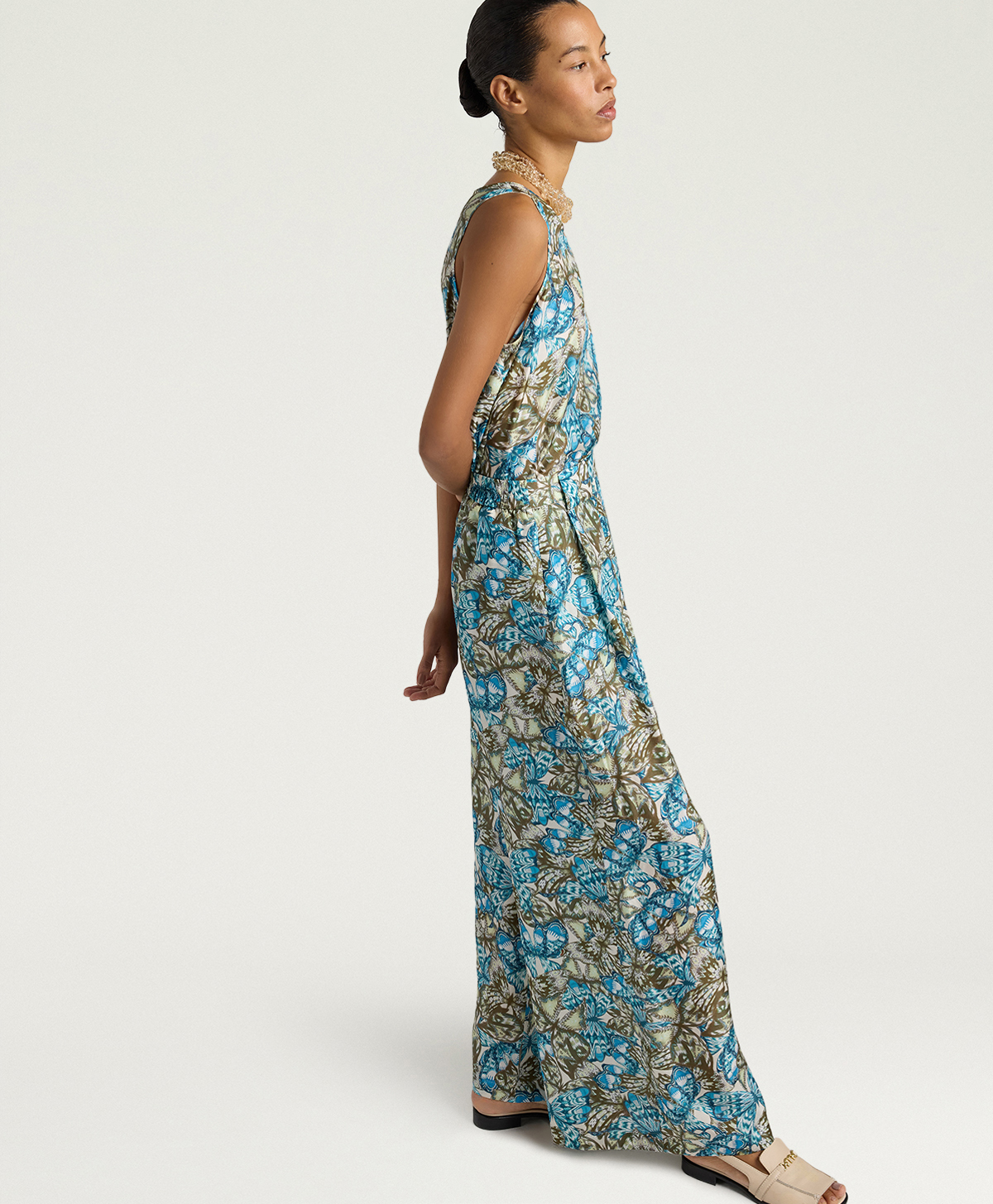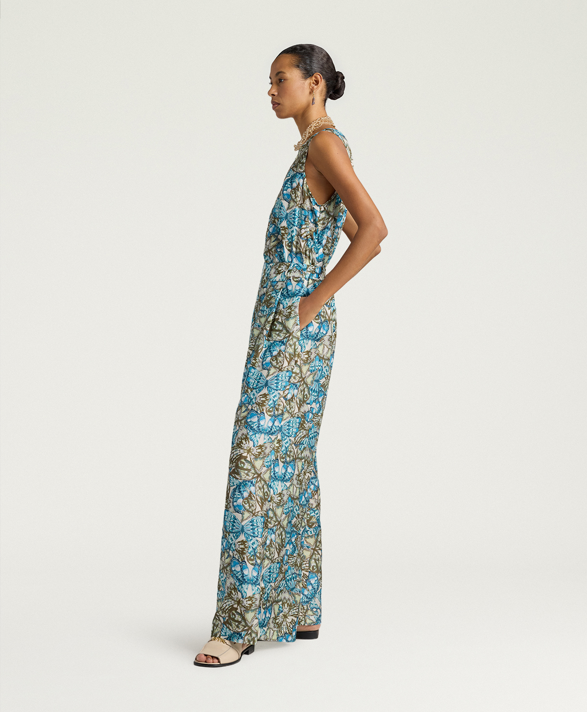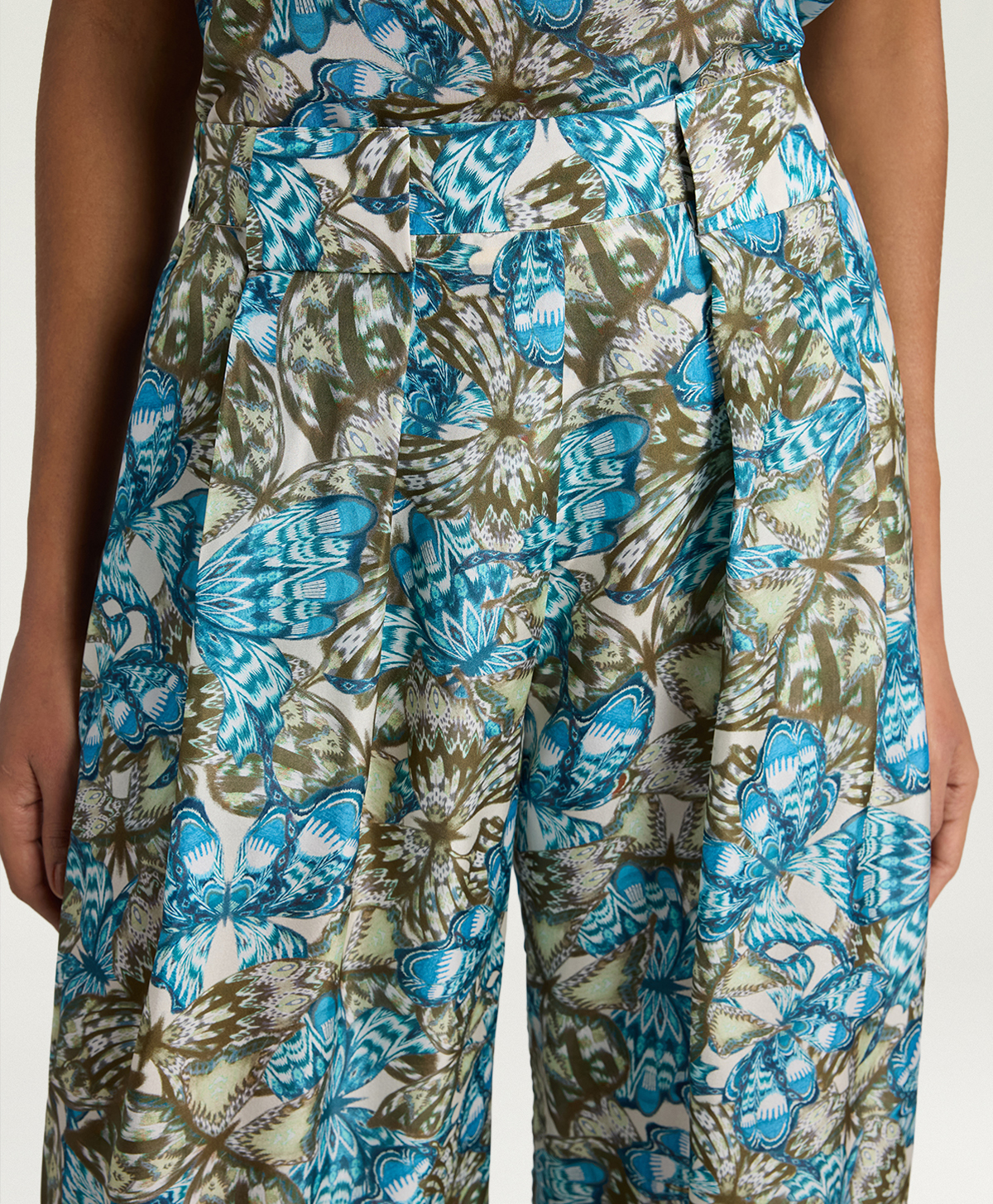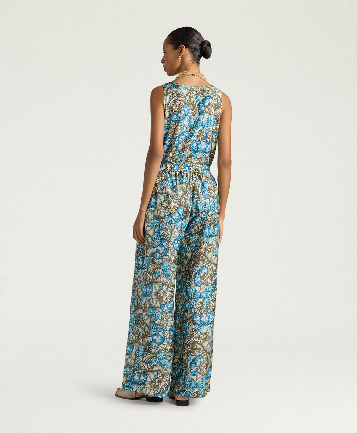 Lhabutai di seta, leggero e morbido al tatto, cade in modo naturale senza segnare, regalando al capo una lucentezza delicata che enfatizza la stampa blu avio/salvia. Questa palette, insieme alla grafica esclusiva Momonì, rende i pantaloni Aspen protagonisti di look sia da giorno sia da sera.