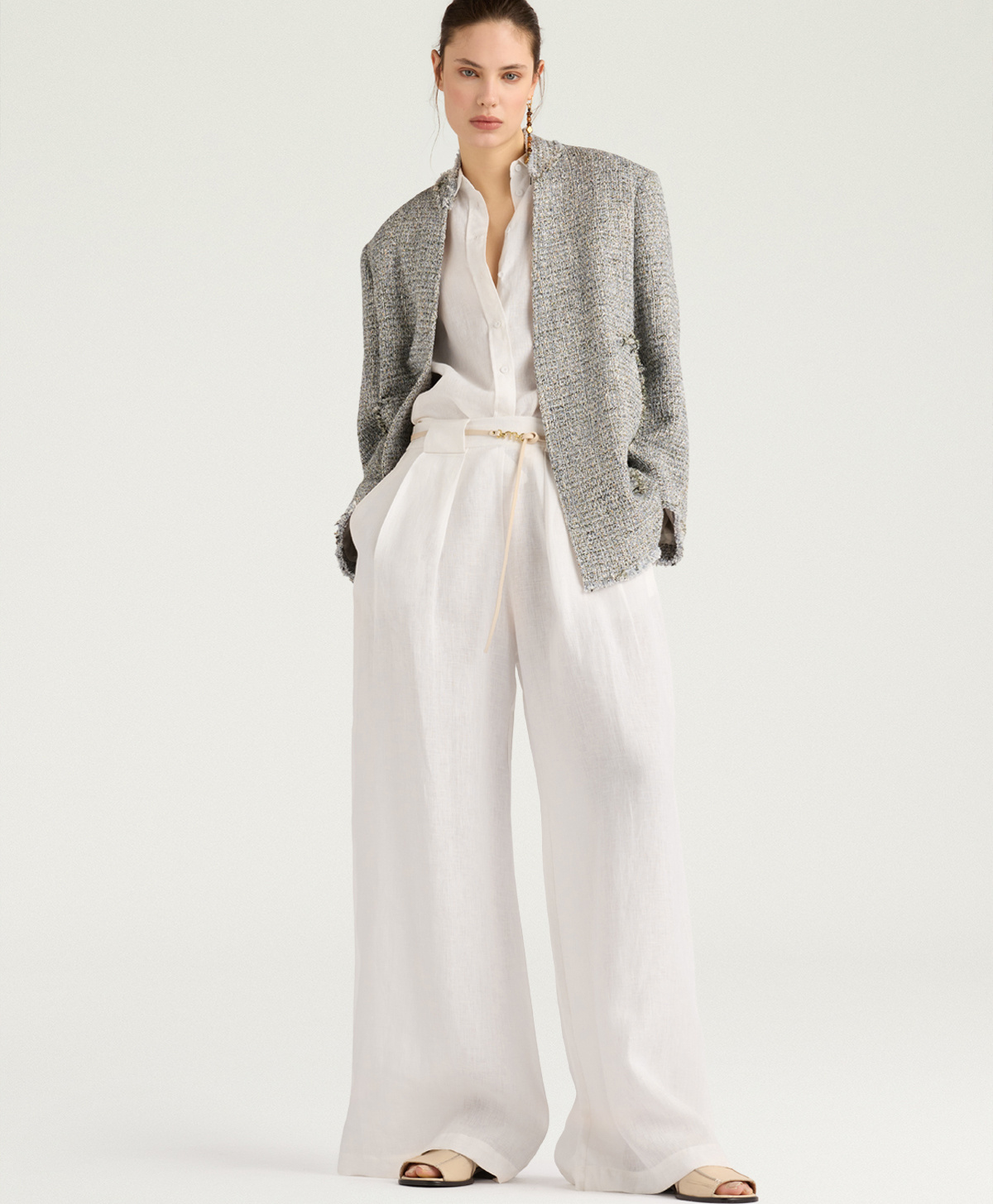 Aspen è il pantalone a palazzo iconico Momonì, qui proposto in puro lino tinta unita latte, perfetto per i look estivi più raffinati. La linea ampia e ariosa e la lunghezza maxi creano una silhouette fluida che slancia la figura mantenendo unallure rilassata.