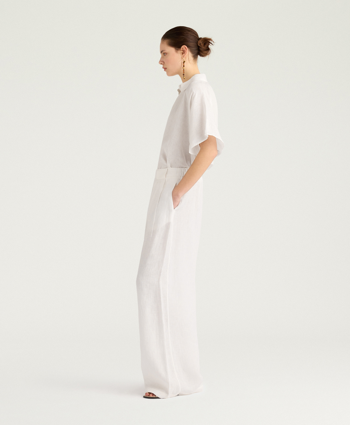 Il lino, naturale e traspirante, rende questi pantaloni ideali nelle giornate più calde, sia in città sia in vacanza, abbinati a camicie leggere, top in seta o maglieria estiva. Il colore latte esalta le tonalità neutre, sabbia e cuoio, ma si abbina anche a stampe vivaci e tinte accese per outfit più decisi.