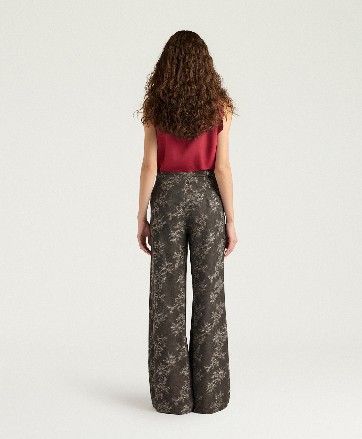 Il cinturino costruito con bottone è strutturato internamente per mantenere la forma e garantire una vestibilità ottimale, con chiusura formale a bottone che aggiunge un tocco sartoriale. Le tasche alla francese (tasche oblique inserite nelle cuciture laterali) sono discrete ed eleganti, donando un look sartoriale che eleva il pantalone palazzo oltre il semplice capo casual, rendendolo perfetto anche per occasioni formali.