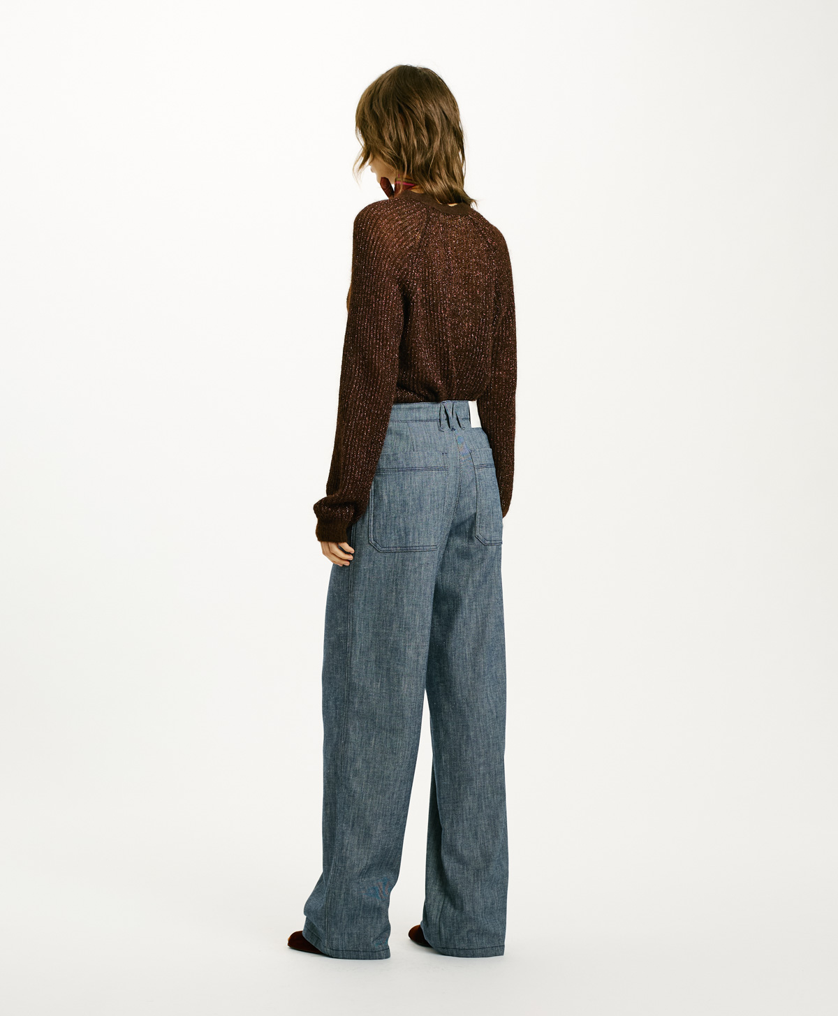 Il dietro è arricchito da un elegante carré e tasche a toppa applicate, mentre il cinturino con passante ad "M" rappresenta il dettaglio distintivo di Momonì. Perfetti per un look sofisticato ma rilassato, questi pantaloni sono un must-have per chi desidera un capo versatile che può essere facilmente abbinato sia a una camicia elegante che a un top casual. Disponibili in un intramontabile blu jeans, sono ideali per ogni occasione, dal lavoro al tempo libero.
