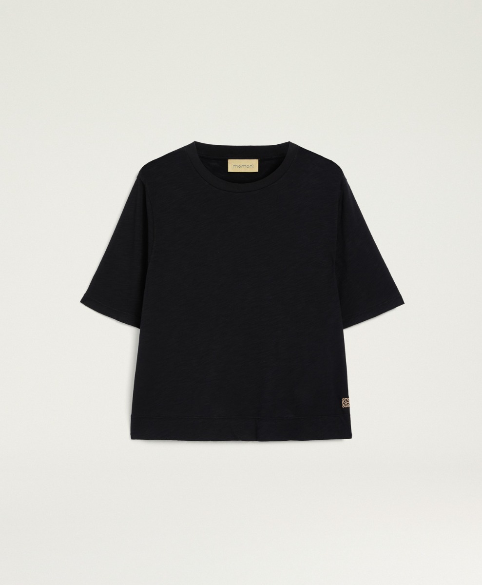 La costruzione over assicura comfort e movimento, permettendo di indossare la T-shirt sia lasciata morbida fuori dai pantaloni sia parzialmente infilata in vita per definire la silhouette. Il logo Momonì ricamato sul fondo capo firma il design con un tocco grafico minimale, mantenendo unestetica pulita.
