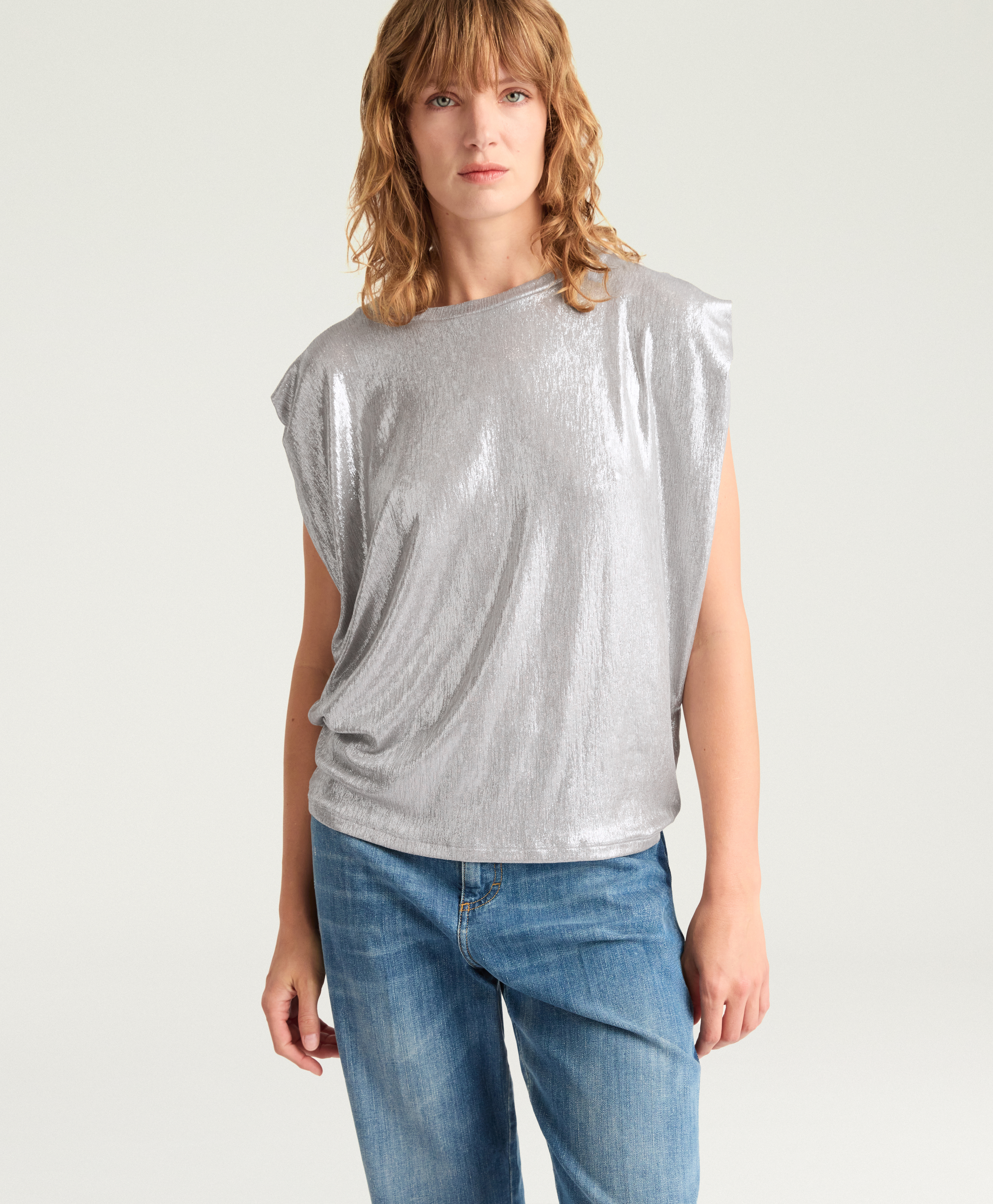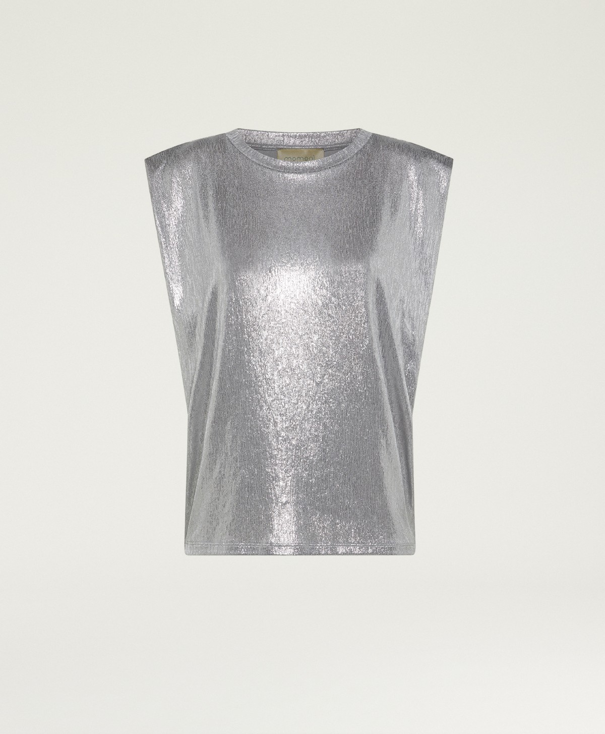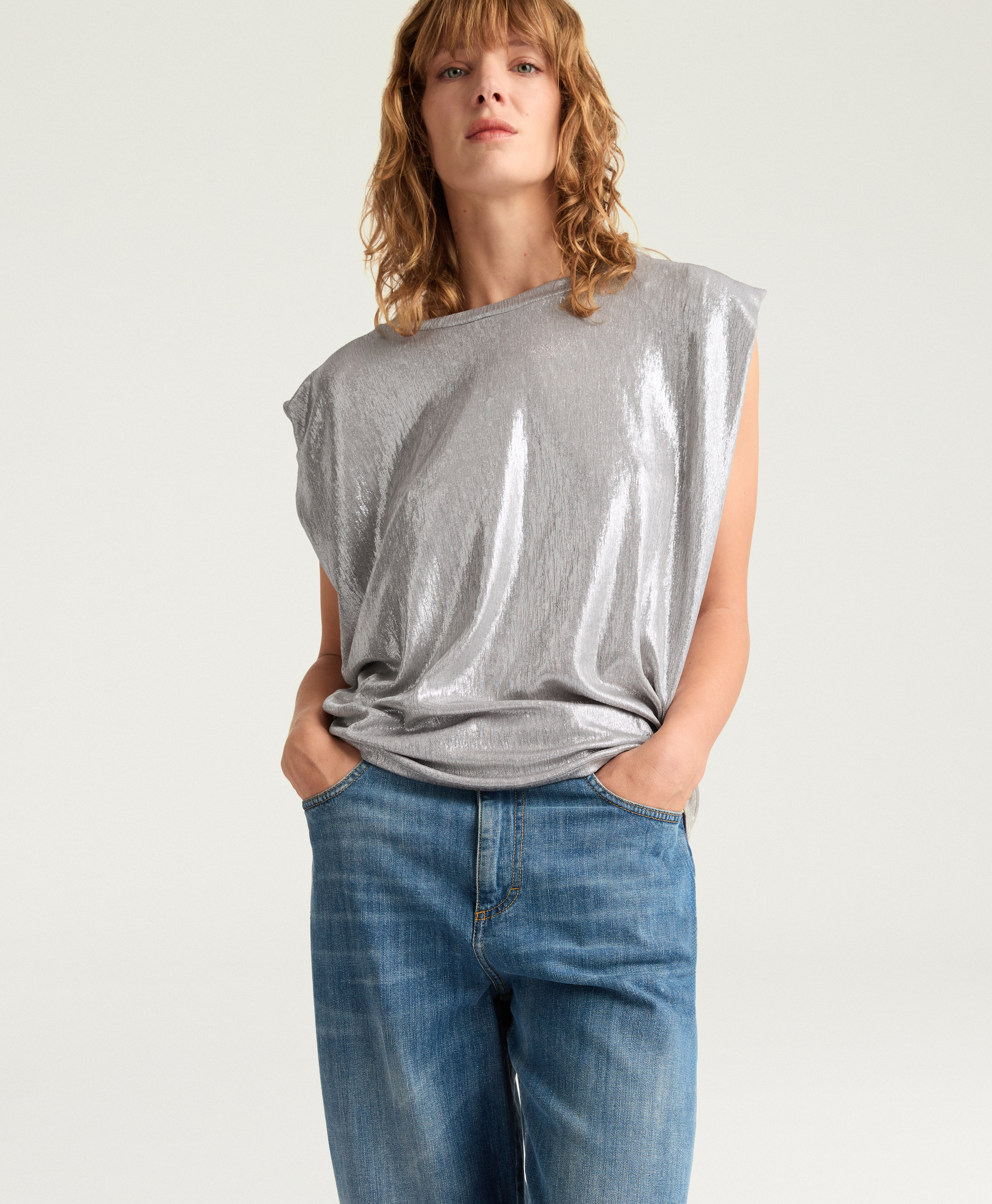 T-shirt carry-over girocollo in jersey stretch effetto laminato. Linea diritta ed essenziale con spalle pronunciate. Un basico rivisto in stile Eighties, con particolare grafica Momonì, dal sapore "street".