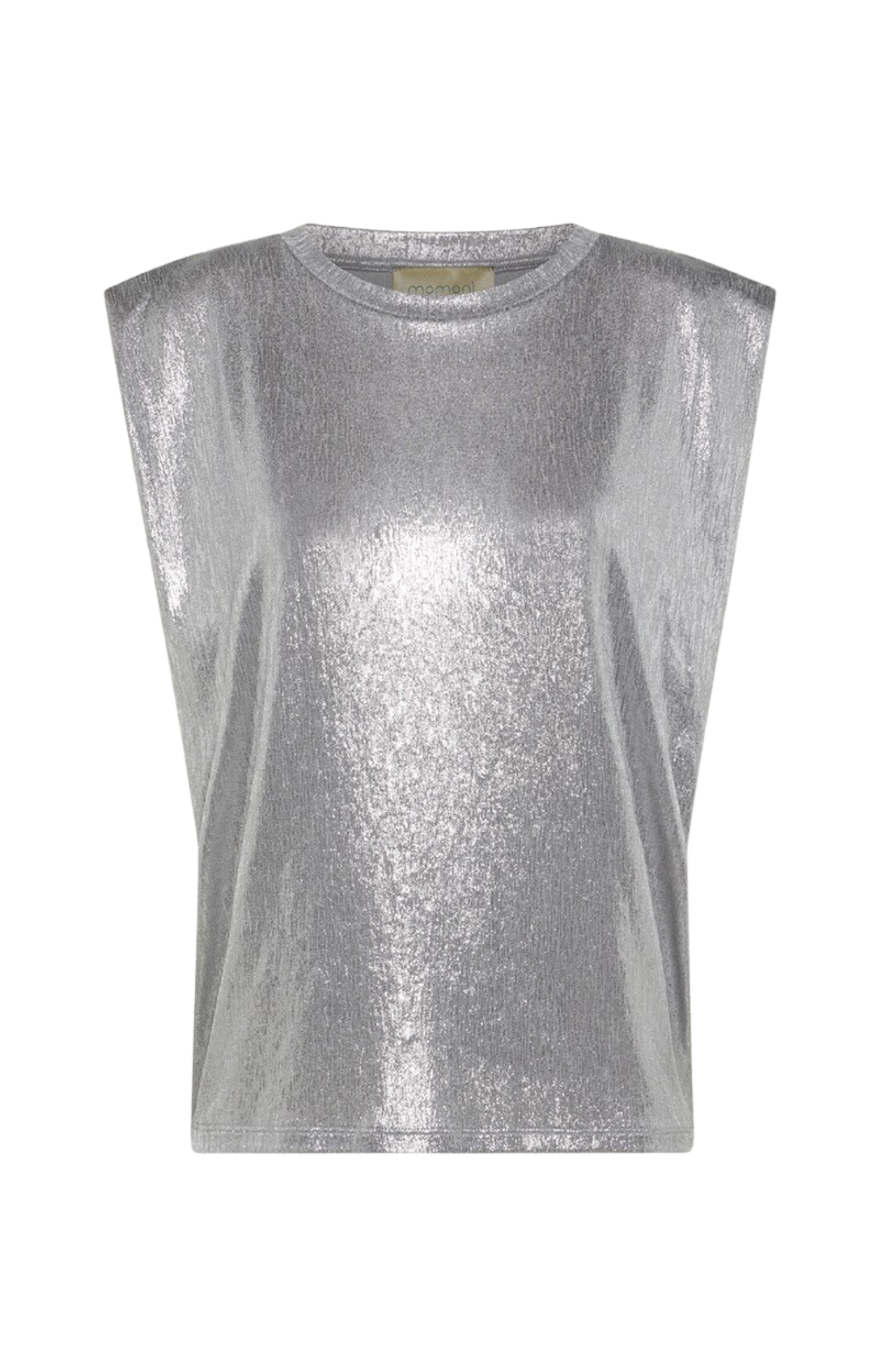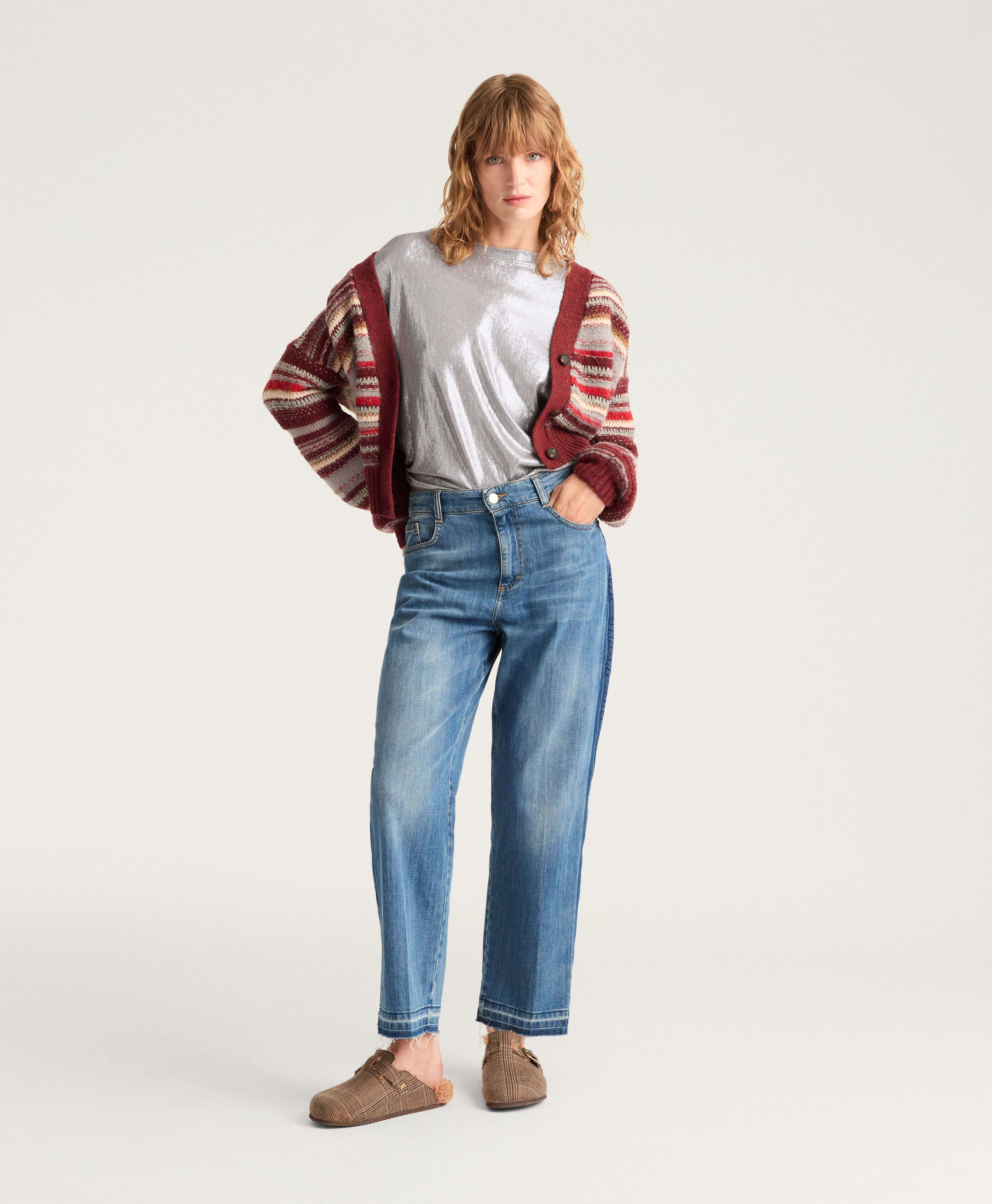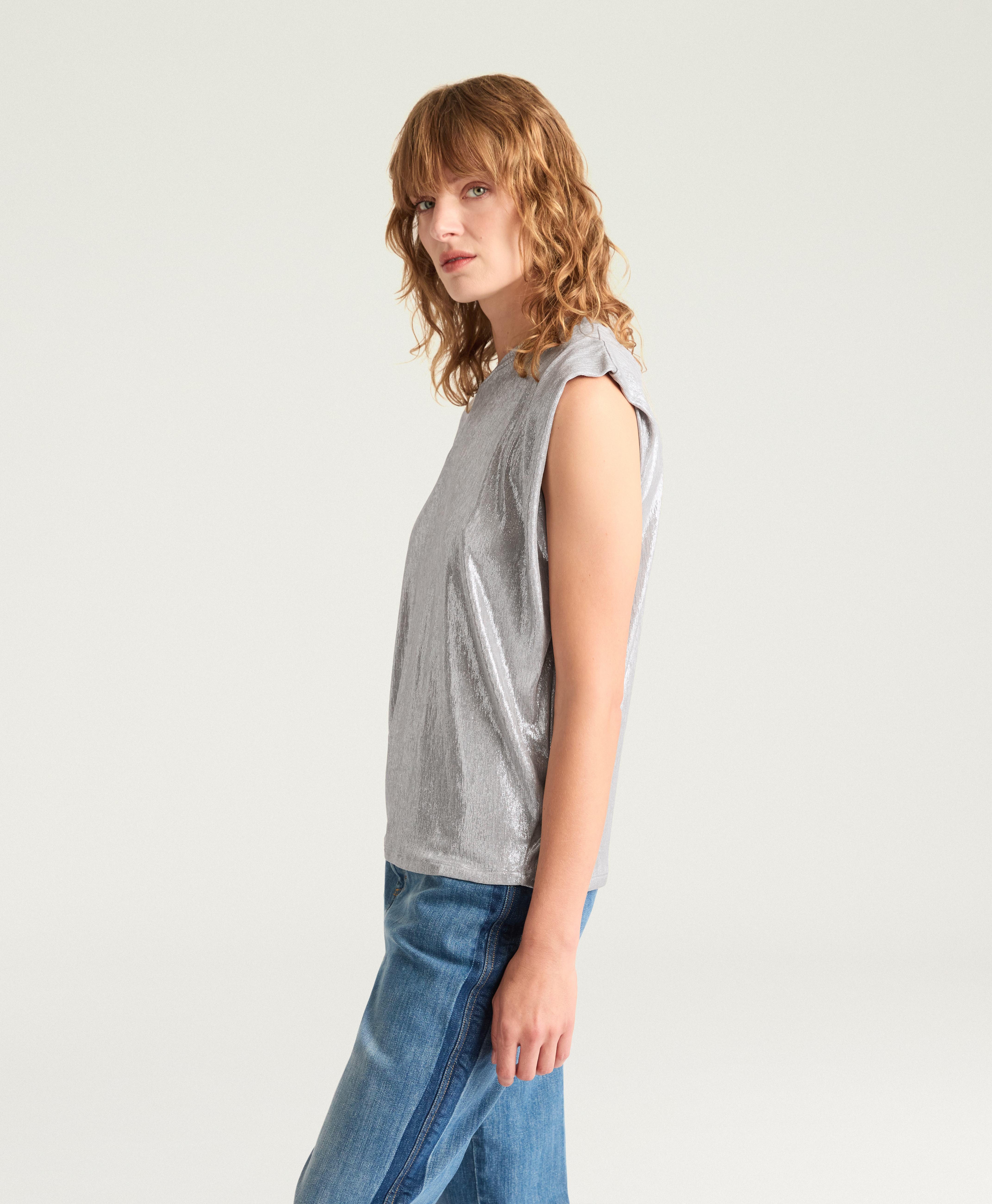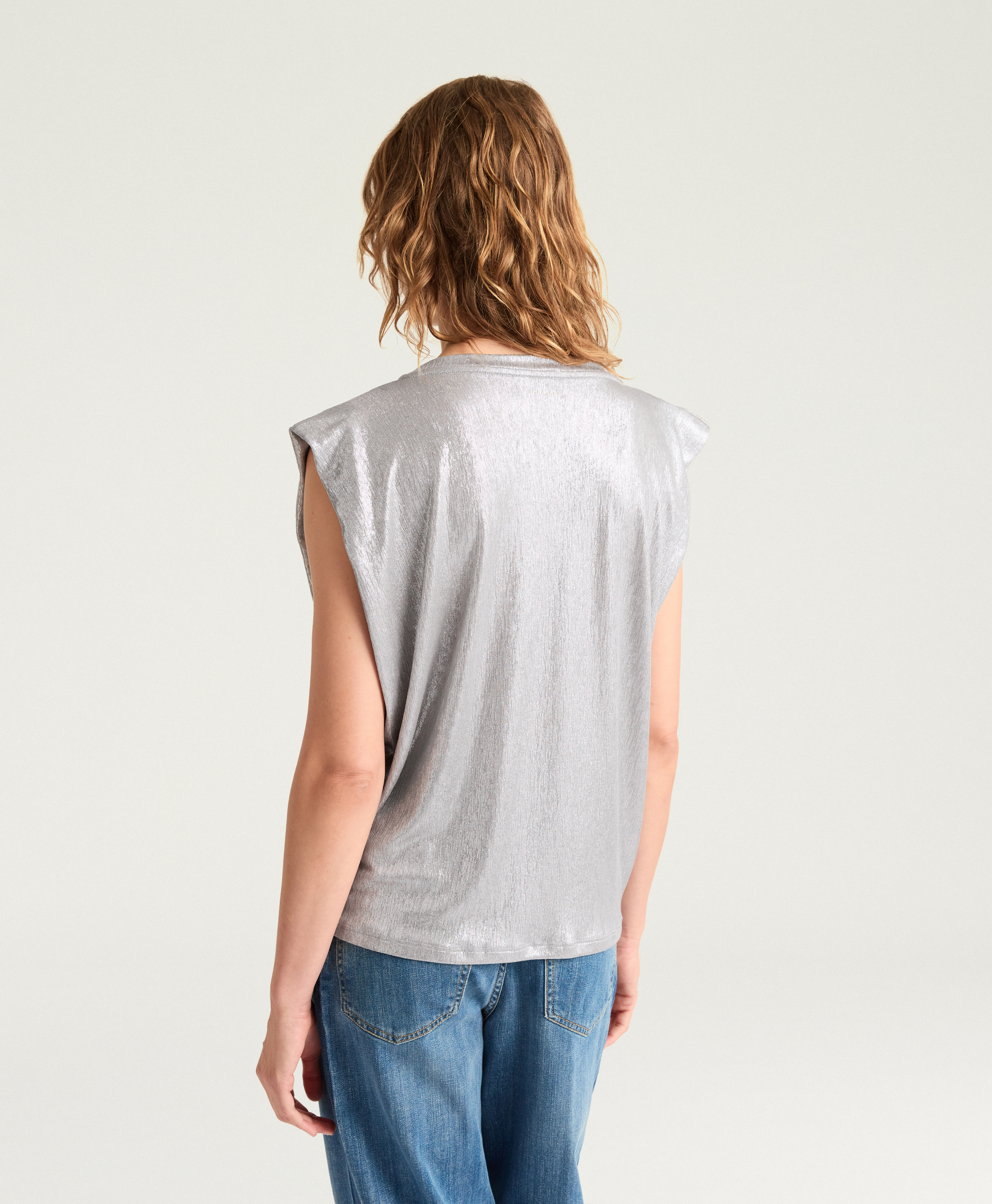 T-shirt carry-over girocollo in jersey stretch effetto laminato. Linea diritta ed essenziale con spalle pronunciate. Un basico rivisto in stile Eighties, con particolare grafica Momonì, dal sapore "street".