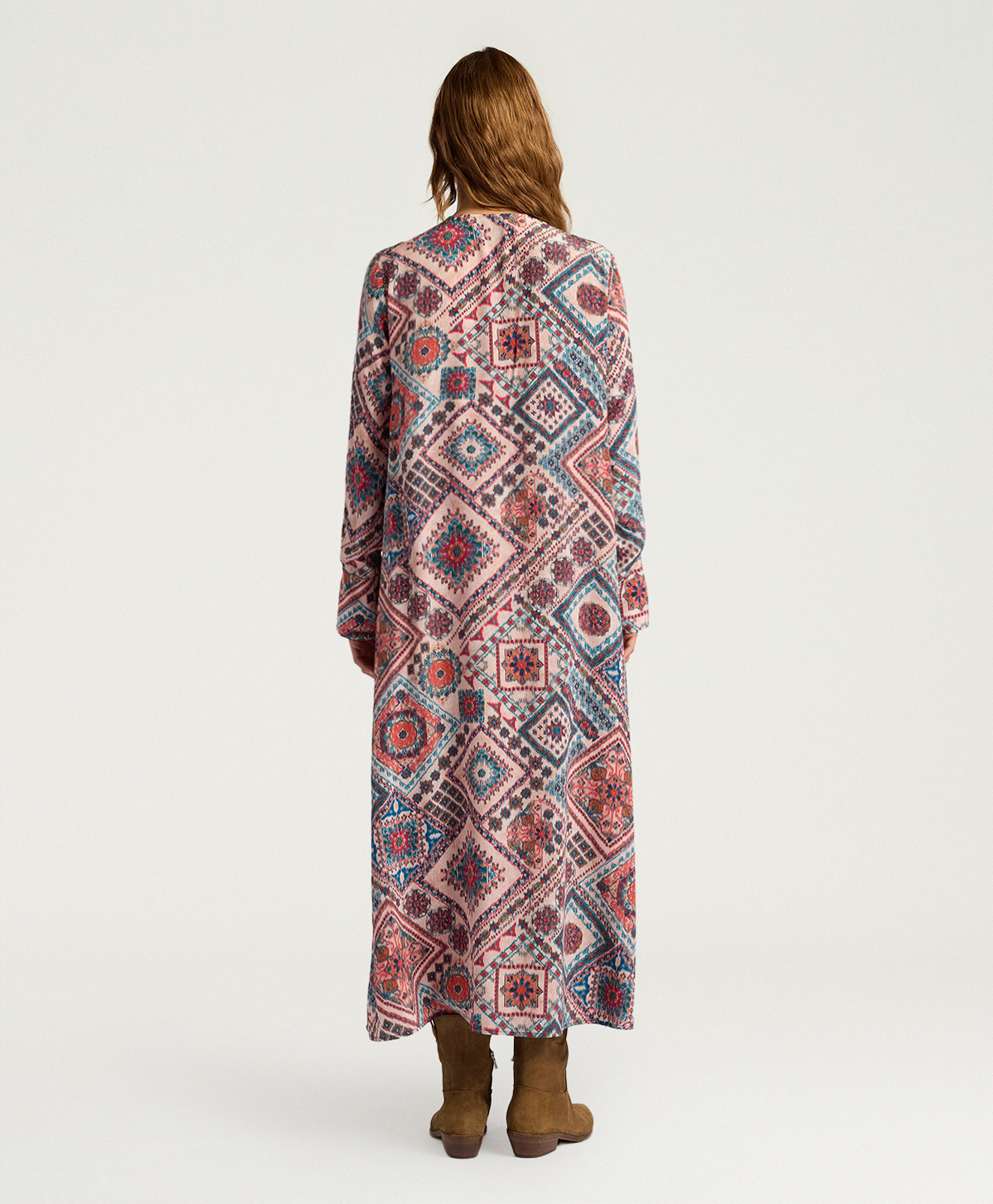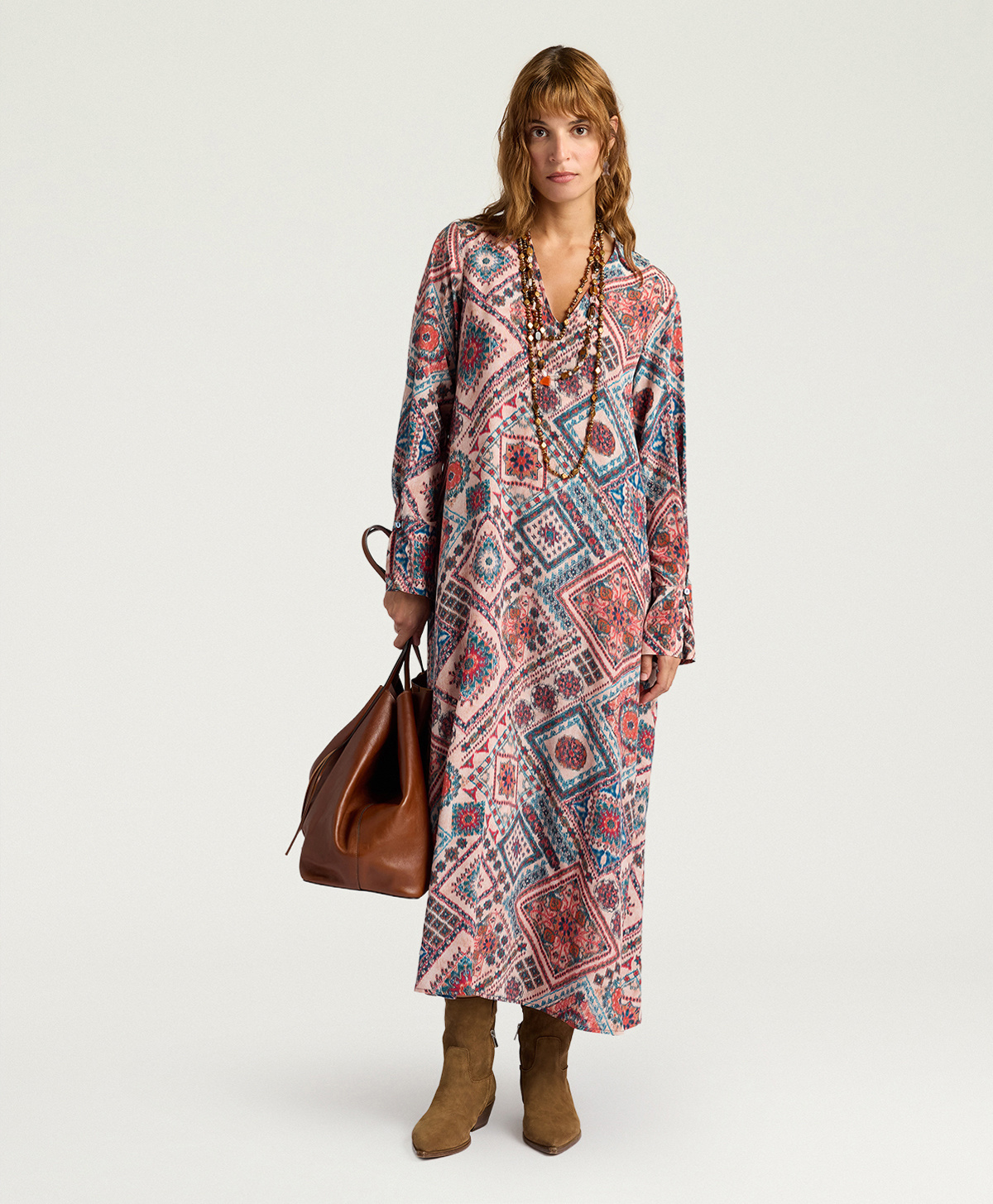 La linea svasata dona movimento e fluidità alla silhouette, mentre le maniche ampie con polsino aggiungono un tocco di raffinatezza contemporanea. Lo scollo a V allunga visivamente il collo, creando un equilibrio armonioso con i volumi morbidi del capo. Le tasche laterali combinano funzionalità e design, rendendo questo vestito perfetto sia per occasioni formali che per outfit quotidiani eleganti.