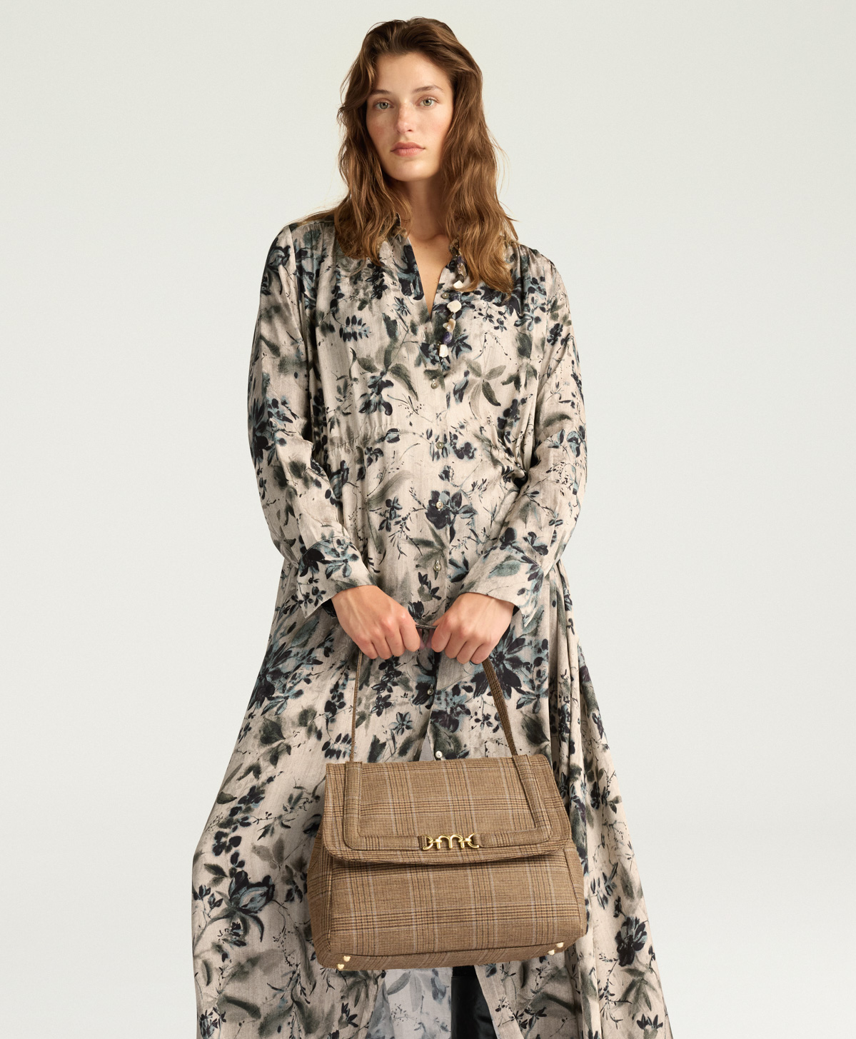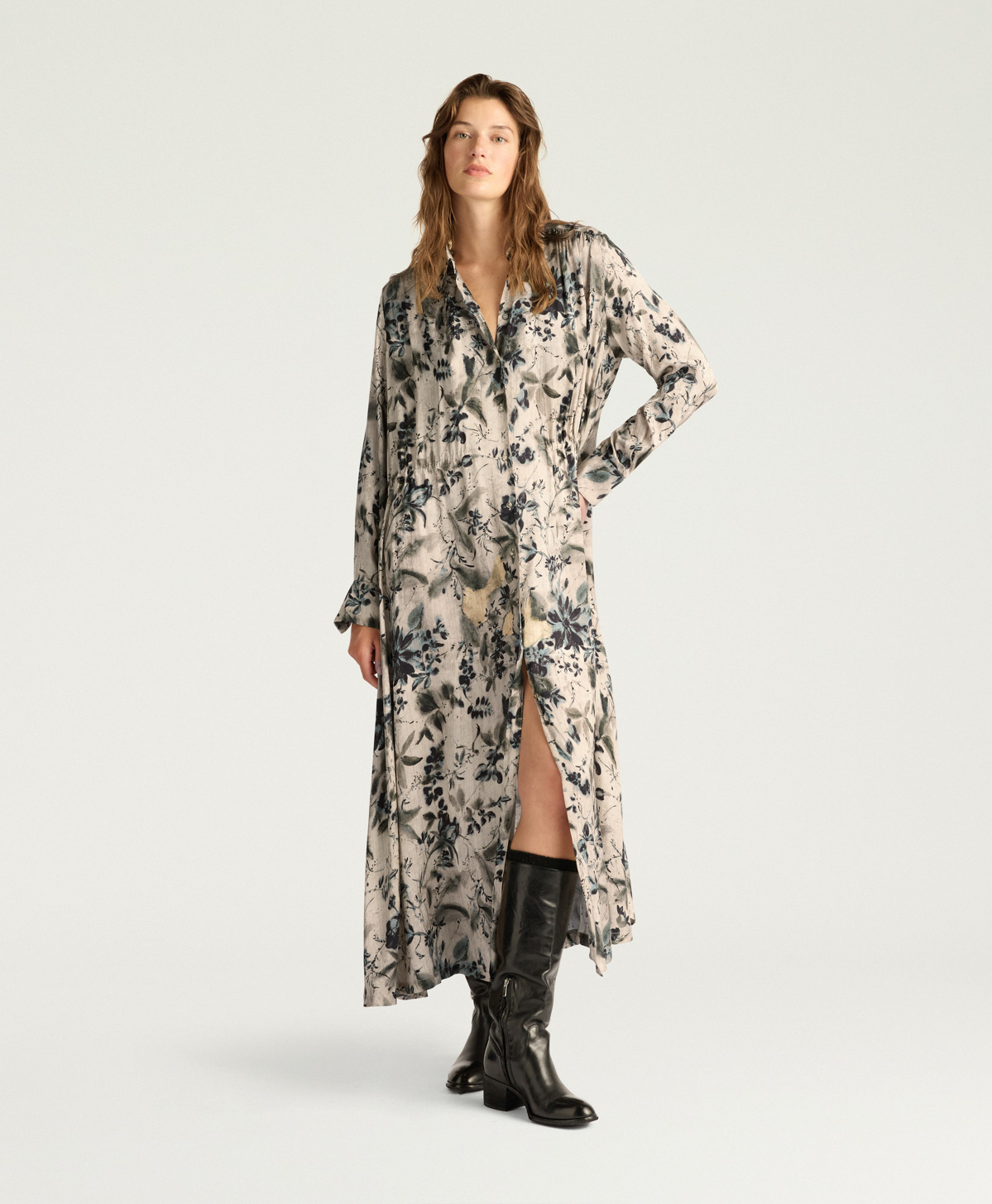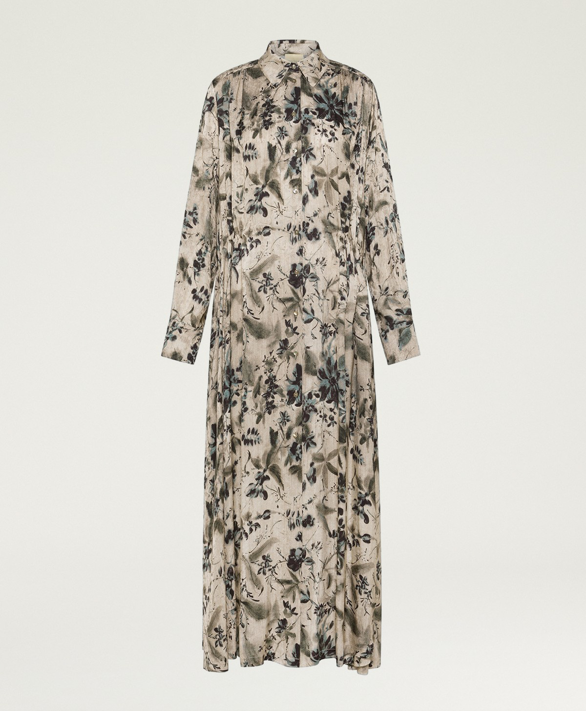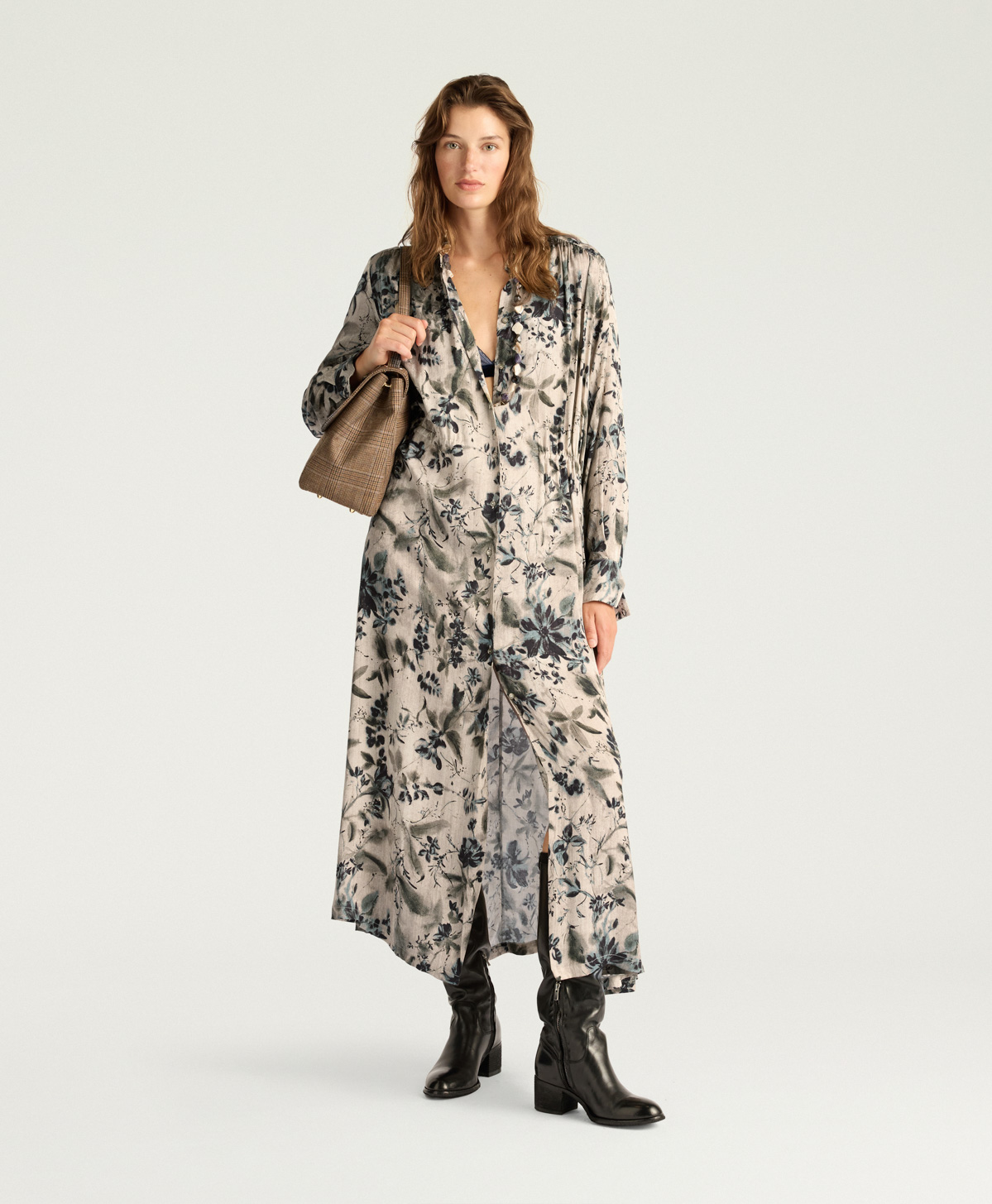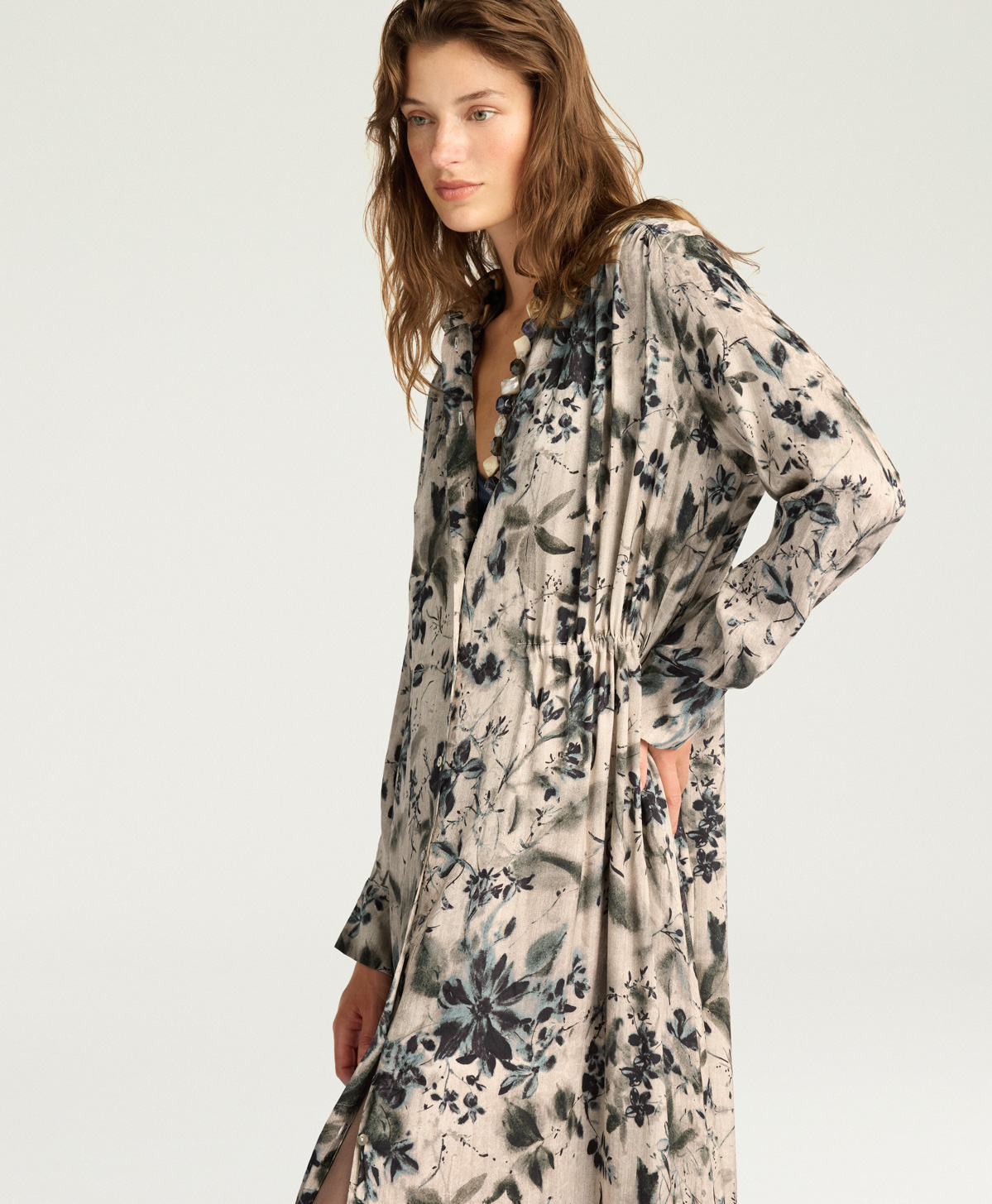 La stampa multicolor su base verde conferisce unallure raffinata e naturale, perfetta per chi desidera un abito fluido, versatile e dallo stile autentico.