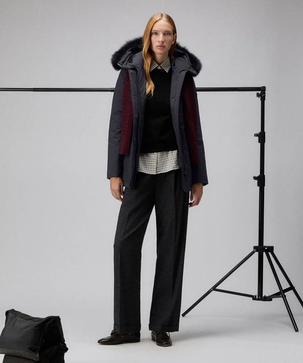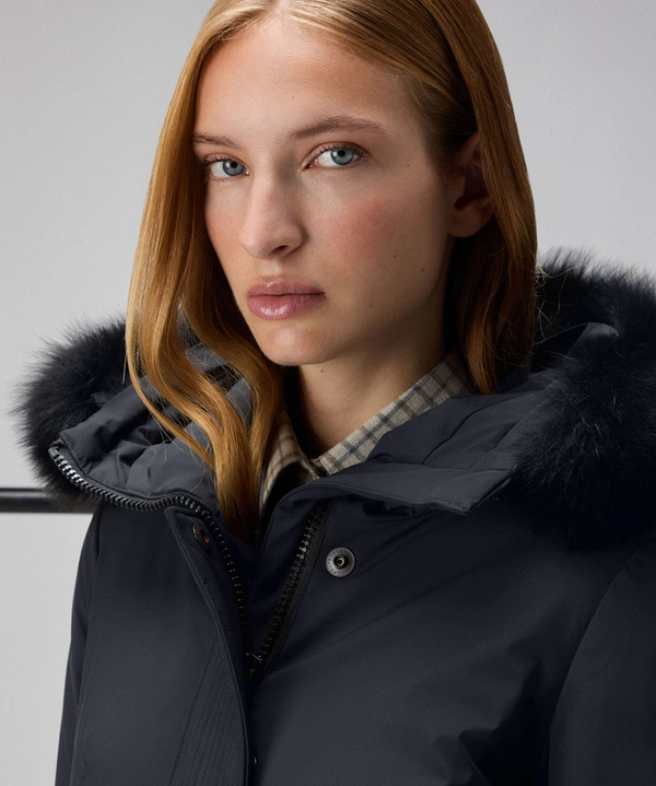 Limbottitura in piuma riciclata (60% piumino doca, 40% piuma, fill power 650) garantisce calore, leggerezza e isolamento ottimale, mentre il collo ampio in pelliccia di volpe staccabile aggiunge un tocco sofisticato e versatile.