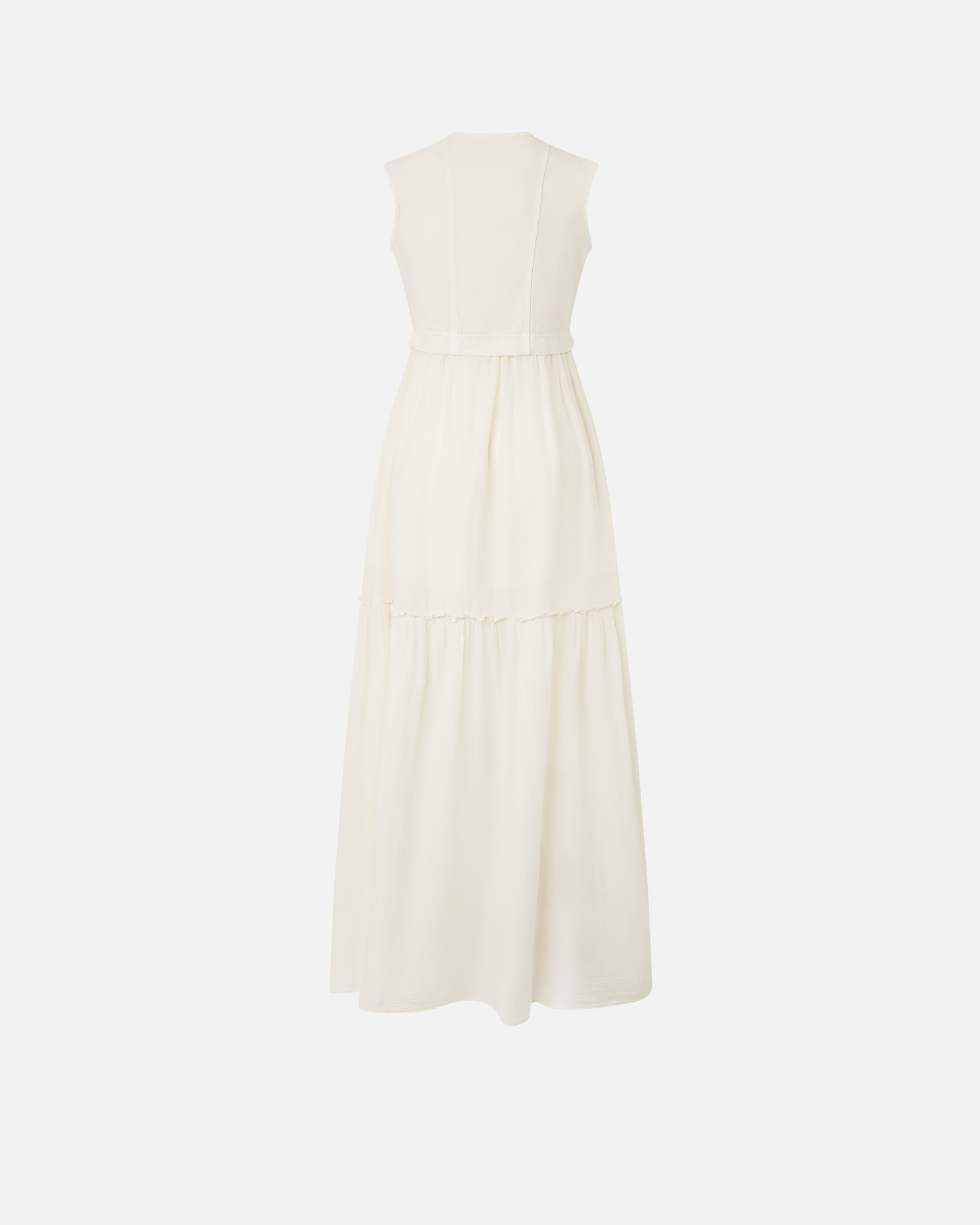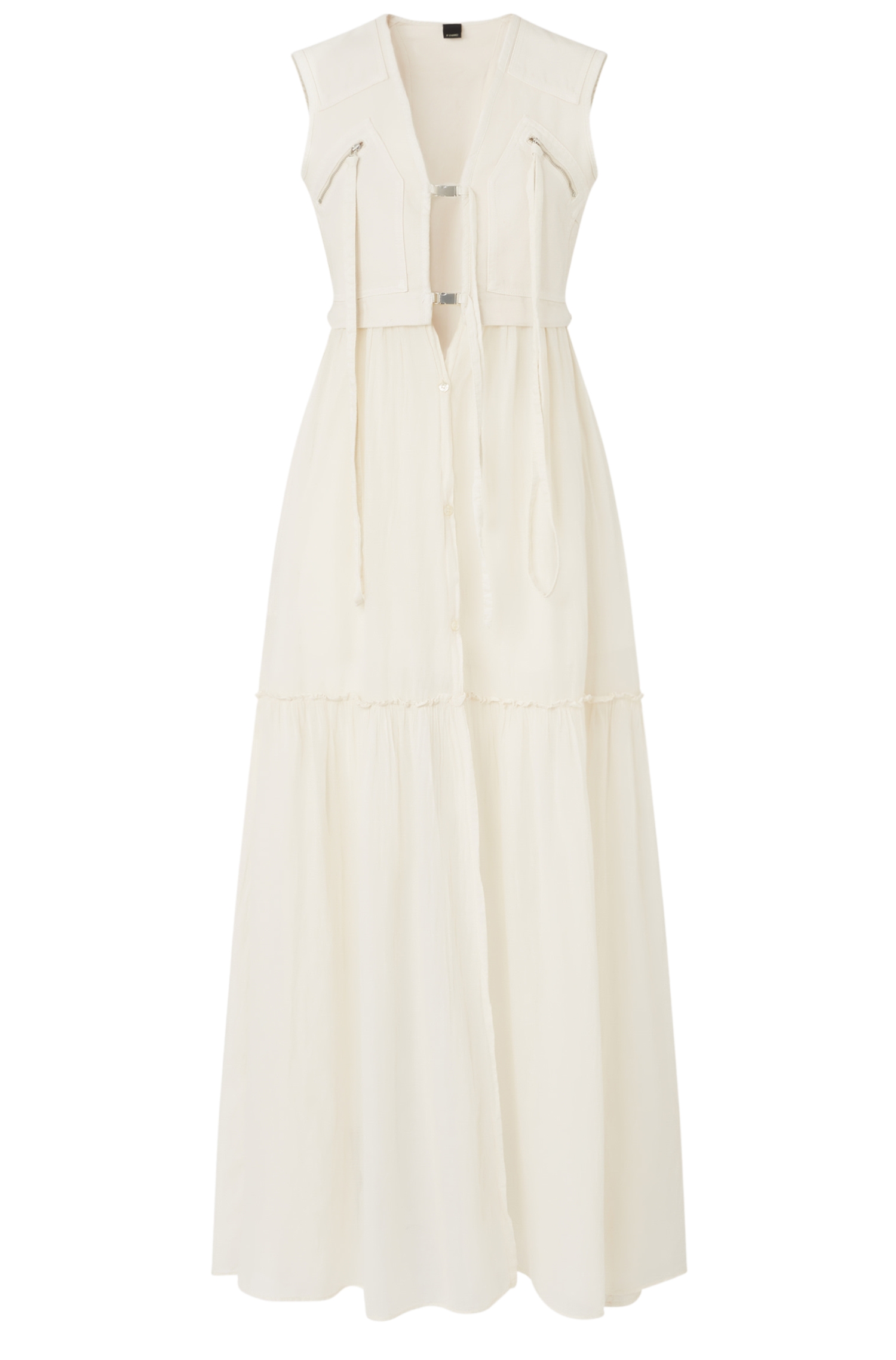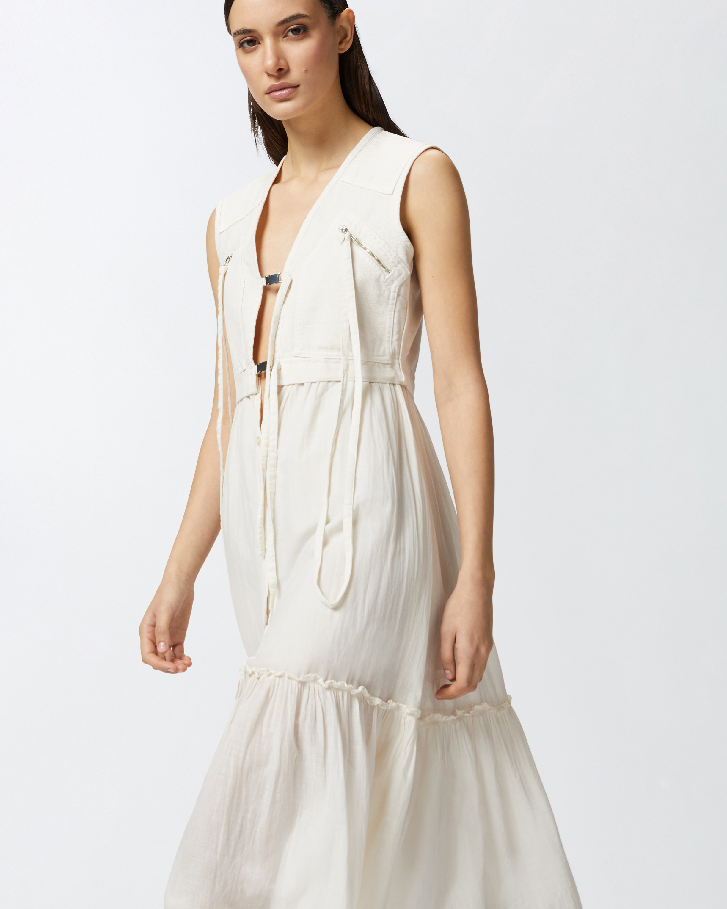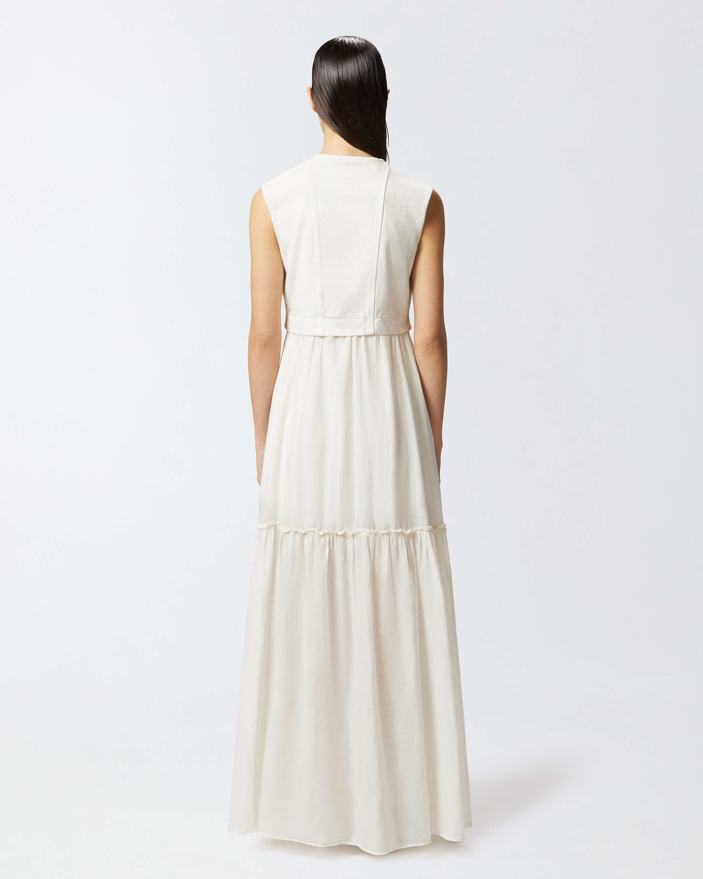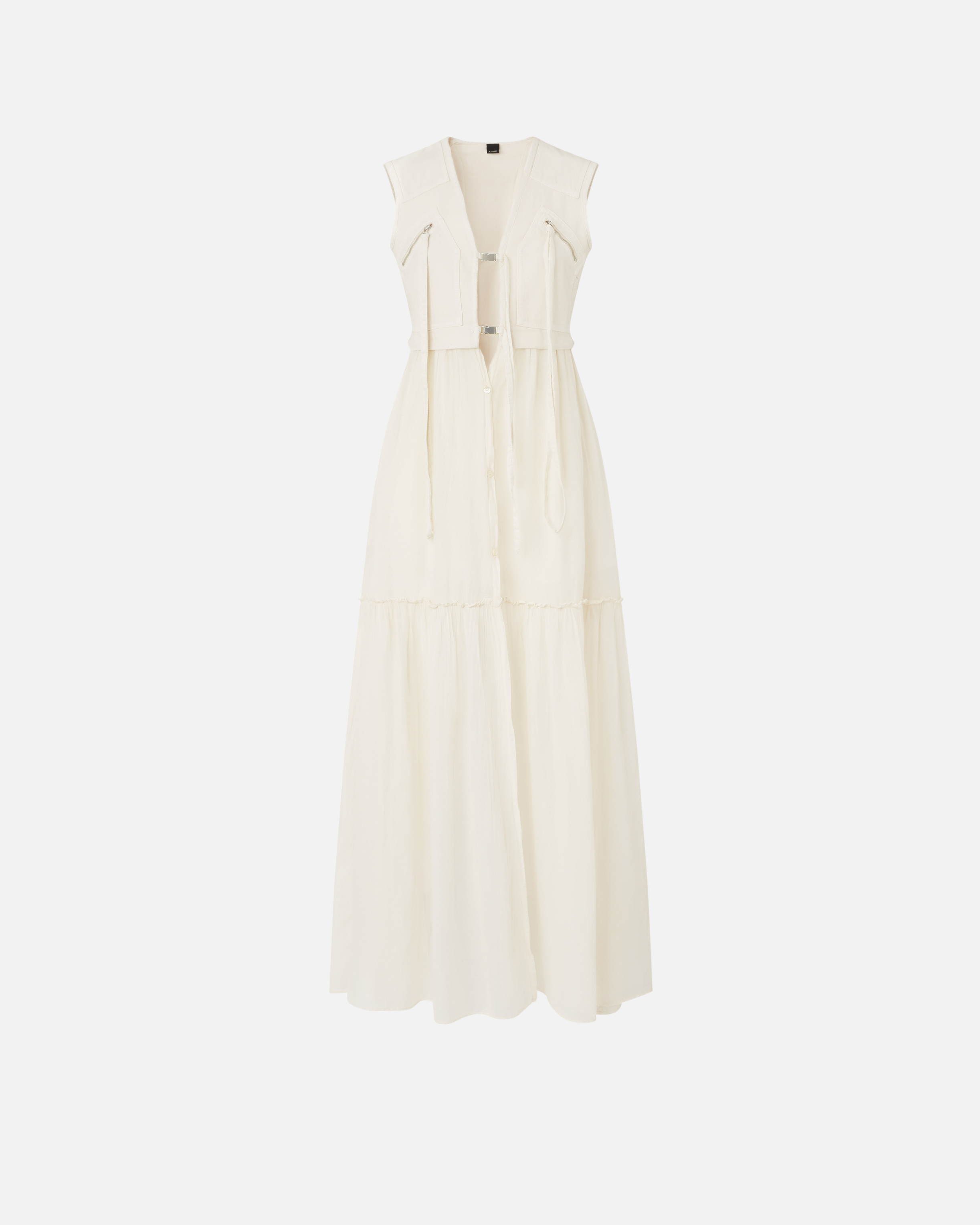 Vestito lungo senza maniche da donna realizzato in leggero voile di cotone, un tessuto estivo e fresco sulla pelle, con parte superiore disegnata come un gilet di ispirazione utility in canvas di cotone. La linea smanicata di quest'abito da giorno è completata da tasche applicate sul gilet davanti, chiuse con zip personalizzato con lungo tirazip. Il profondo scollo davanti è chiuso con gancetti a scatto, mentre la gonna lunga costruita a balze presenta un'abbottonatura davanti. Il maxi abito in voile di cotone realizza con facilità un look versatile e femminile, da sfoggiare con un paio di sabot mocassini, trend della stagione.