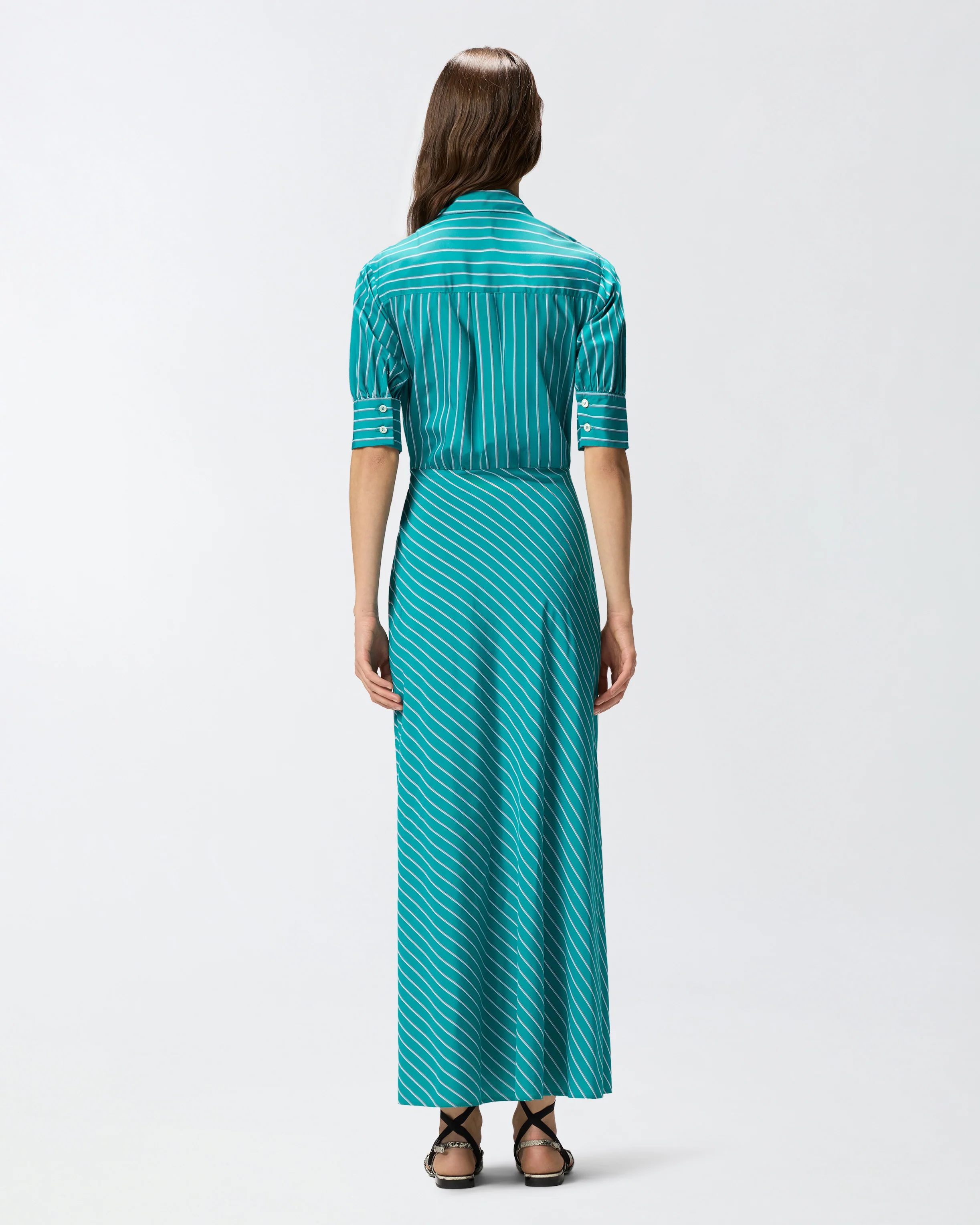 Realizzato in popeline fluido 87% viscosa, 13% nylon con motivo a righe tinto in filo che crea un interessante effetto tridimensionale. Il blend garantisce drappeggio morbido, lucentezza setosa e praticità nella manutenzione. Le righe diagonali aggiungono movimento e modernità alla silhouette.