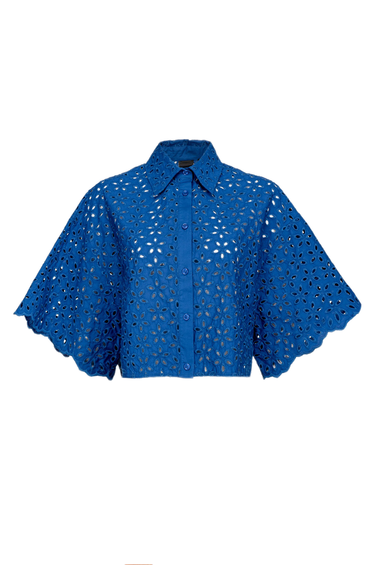 Camicia dal taglio crop in cotone con ricamo sangallo all-over. Colletto a punta e mezze maniche dal volume ampio. Chiusura con bottoni in tono colore. - La modella è alta 175cm e indossa una taglia 40.