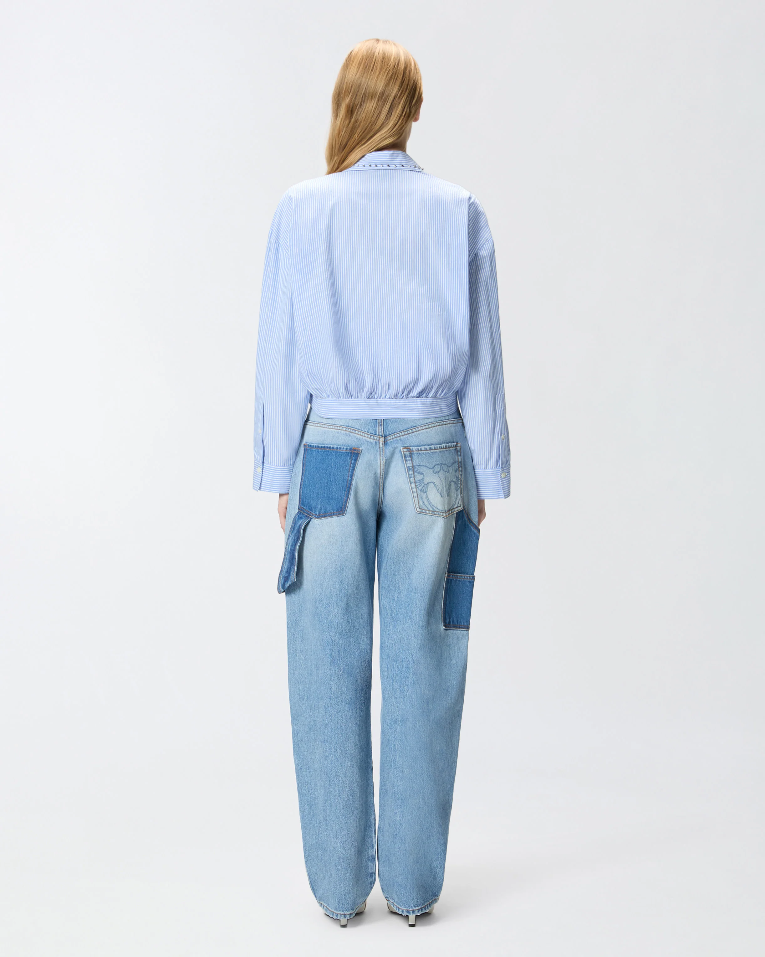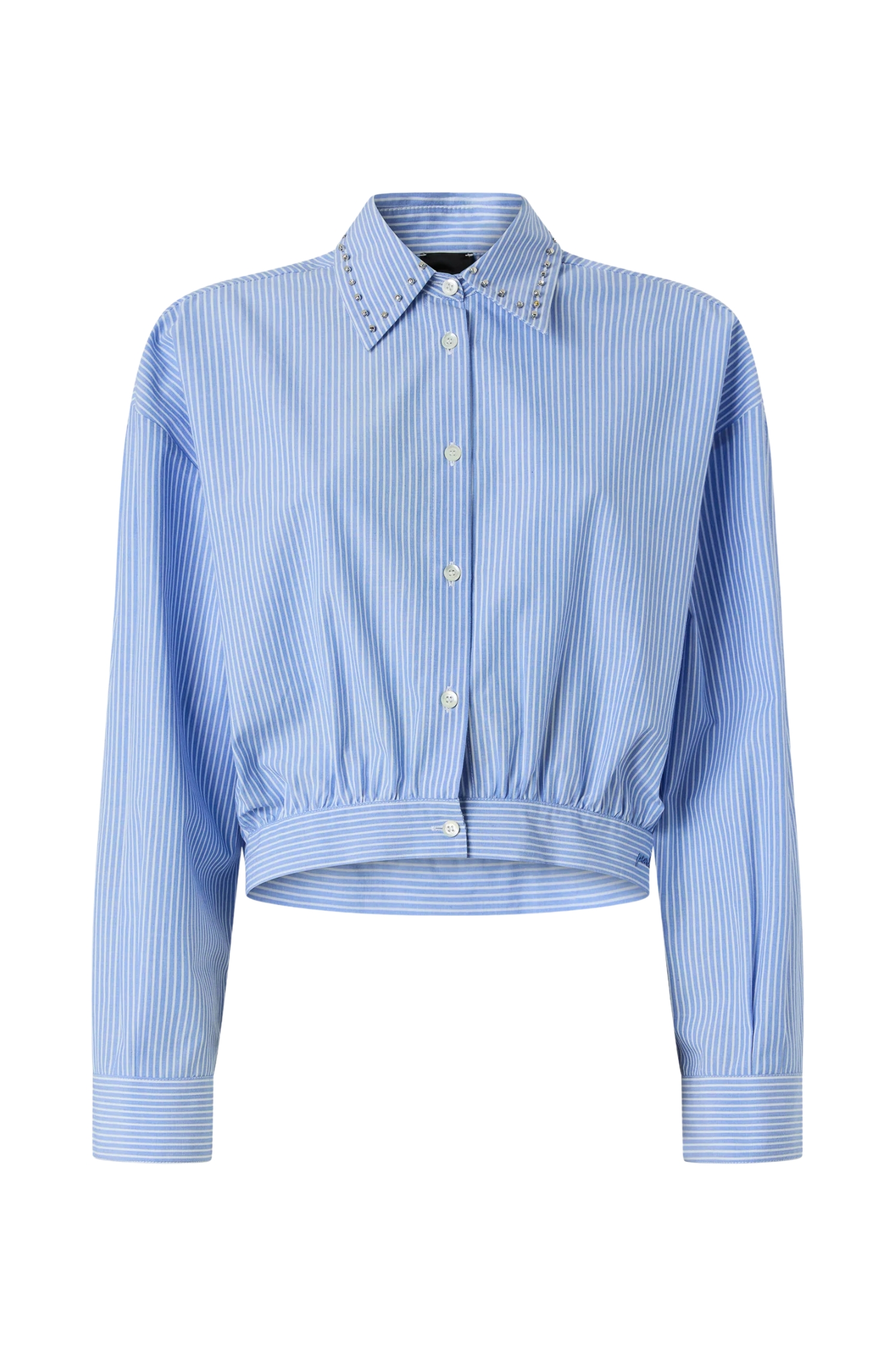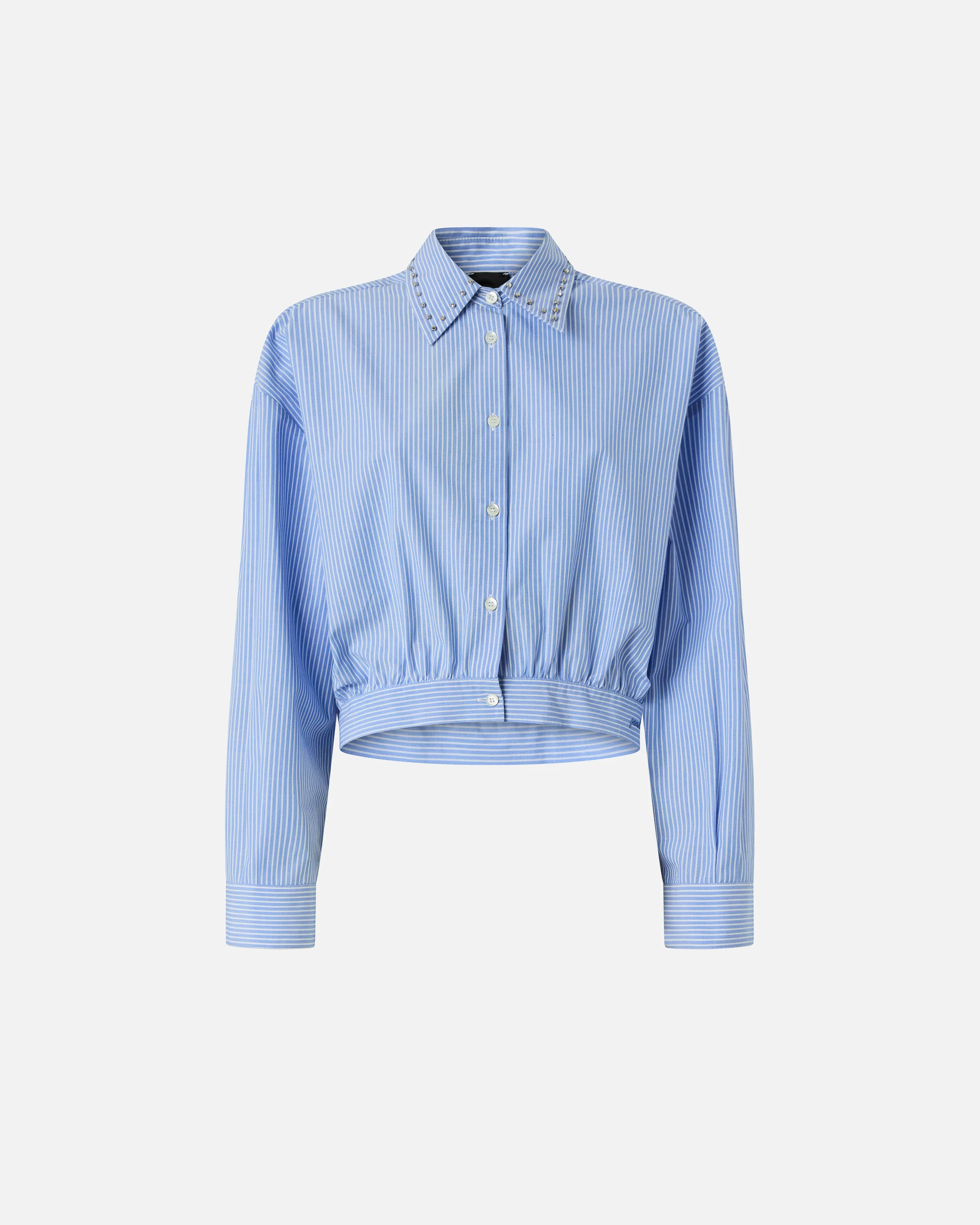 Il colletto è interamente decorato lungo il bordo da unalternanza di piccoli elementi metallici a forma di cubetto e cristalli incastonati ricamati a mano, che creano una preziosa bordura gioiello capace di elevare anche i look più semplici. Grazie al mix tra fantasia rigata versatile e ricamo gioiello, questo capo diventa un asso nella manica per comporre outfit sempre diversi, dal denim quotidiano ai pantaloni sartoriali per la sera.