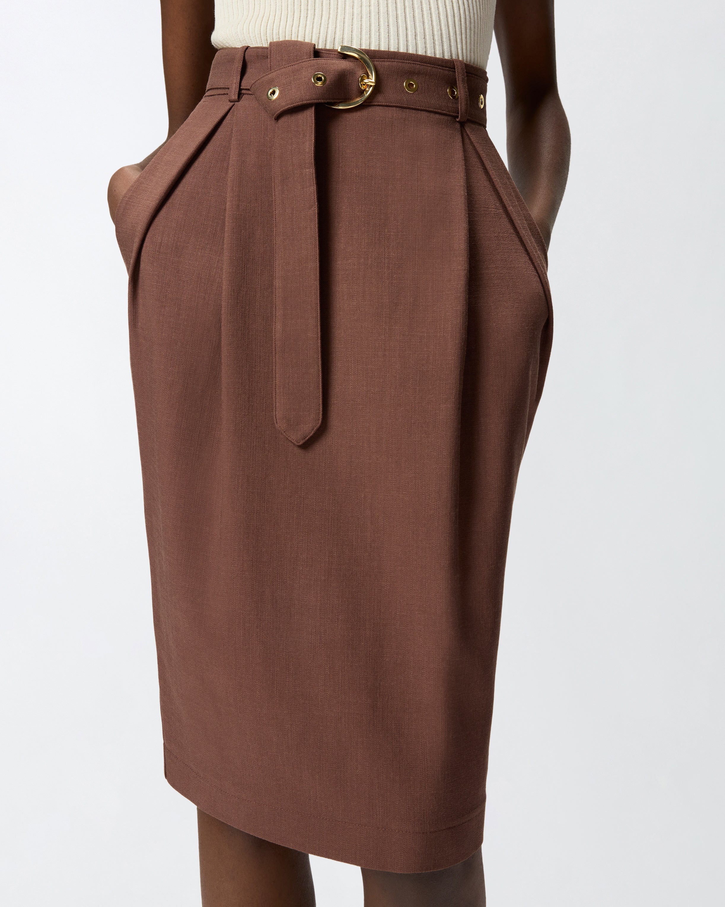 La gonna longuette aderente con cintura Edwena è pensata per valorizzare la silhouette con uneleganza moderna e femminile, perfetta per look da giorno raffinati e per la sera. Il tessuto panama in viscosa, poliestere ed elastan riprende il carattere naturale del lino ma offre maggiore comfort, caduta fluida e minore tendenza alle pieghe, anche grazie al lavaggio finale con ammorbidente.