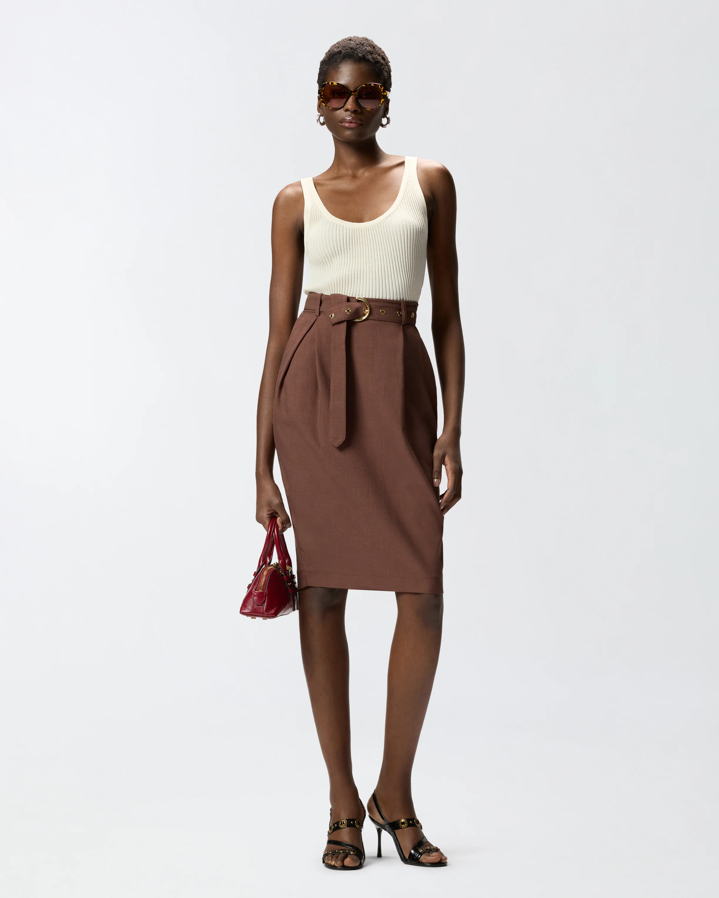 Elemento distintivo è la cintura rimovibile coordinata, impreziosita da fibbia e occhielli con finitura dorata che illuminano il punto vita e permettono di modulare la vestibilità. Abbinata alla giacca smanicata o agli altri capi in panama crea un sofisticato total look, ma funziona benissimo anche con top lingerie, camicie o T-shirt per outfit day-to-night.