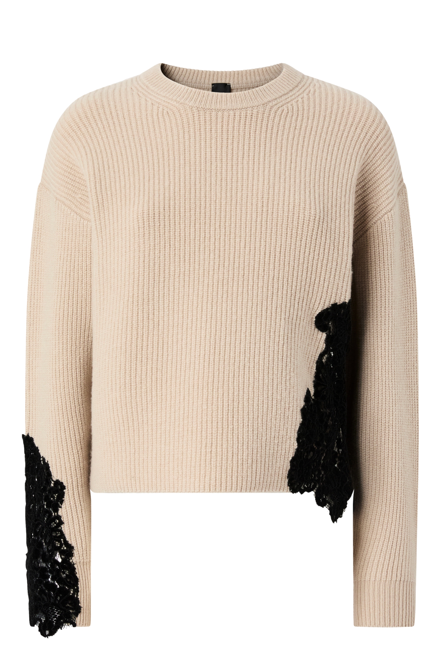 Maglione girocollo in filato di misto lana merino, caratterizzato da un inserto in pizzo macramé tono su tono applicato sul davanti che dona un tocco romantico e ricercato al capo. Il design è completato da maniche lunghe, bordi a coste su scollo, polsini e fondo e da una vestibilità regolare facile da abbinare a pantaloni o gonne per look day-to-night. Un alleato versatile per outfit invernali eleganti ma confortevoli.?