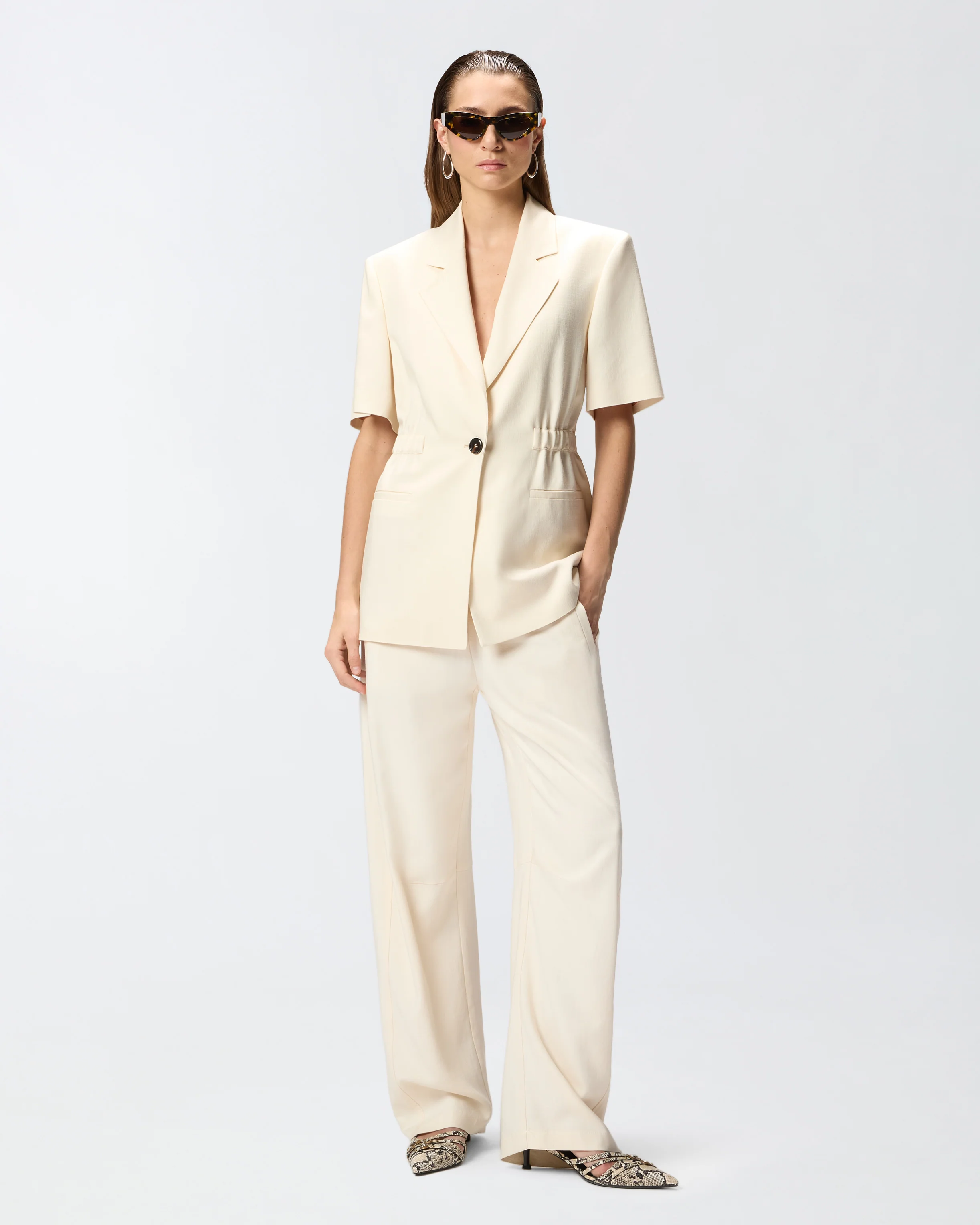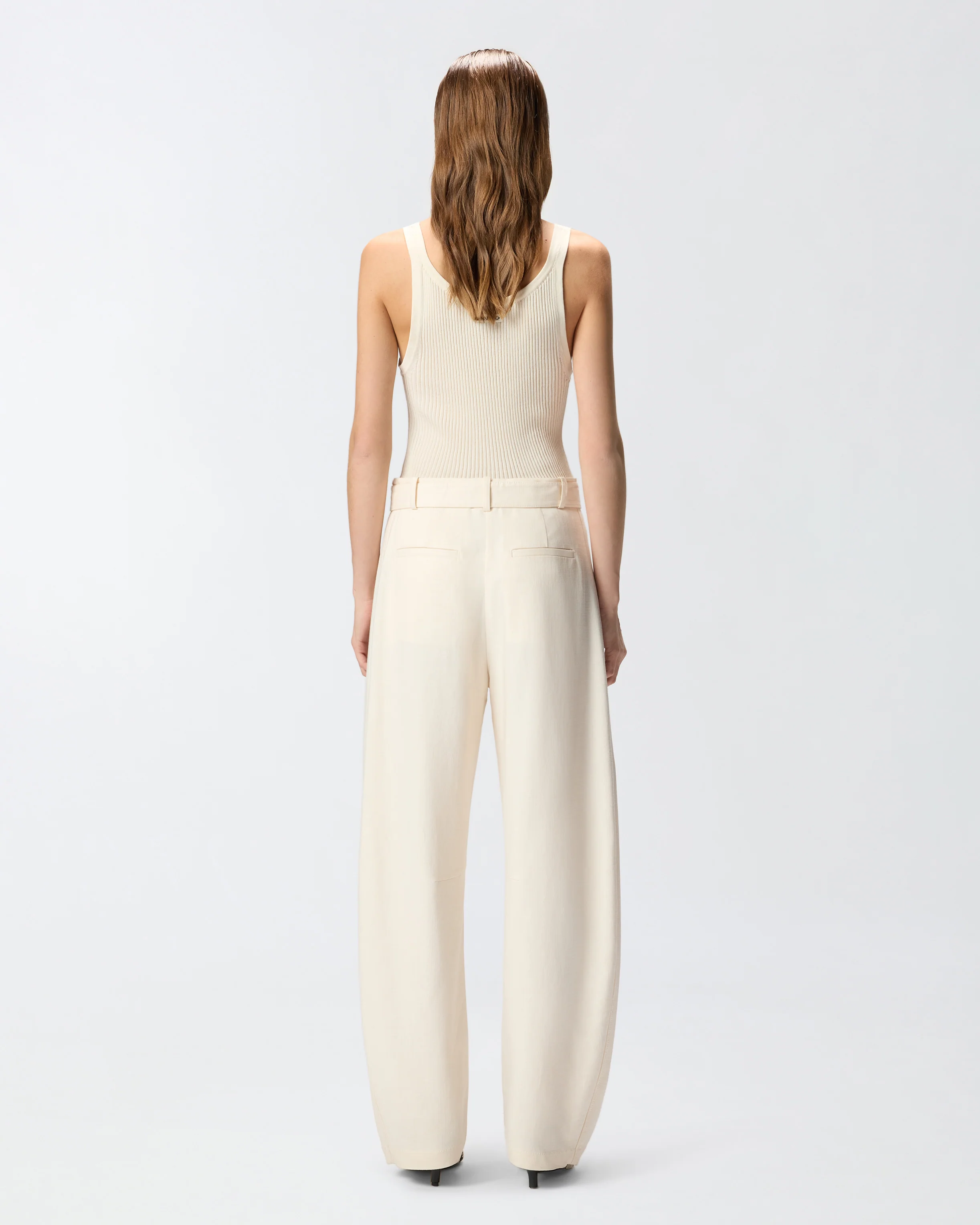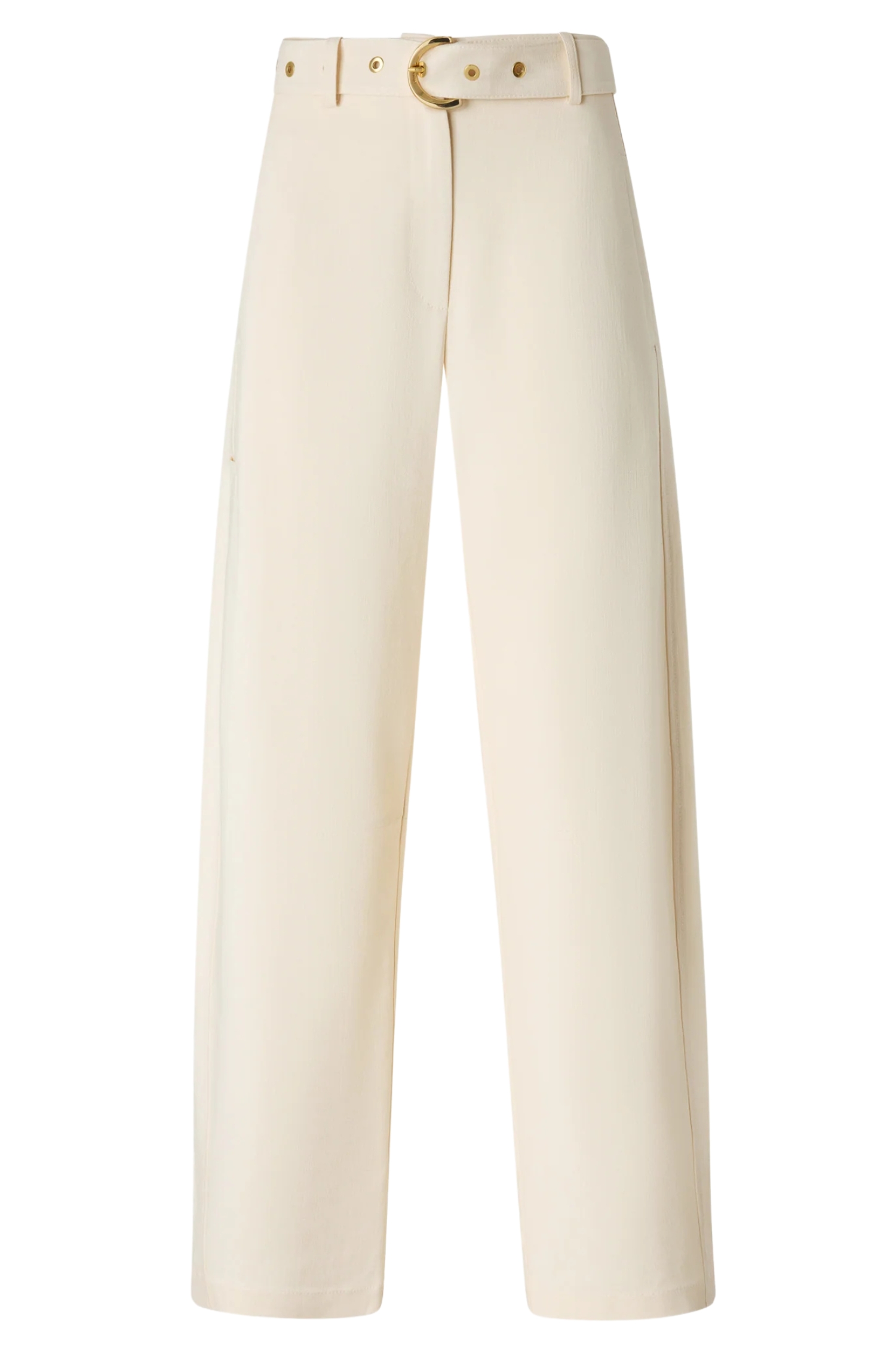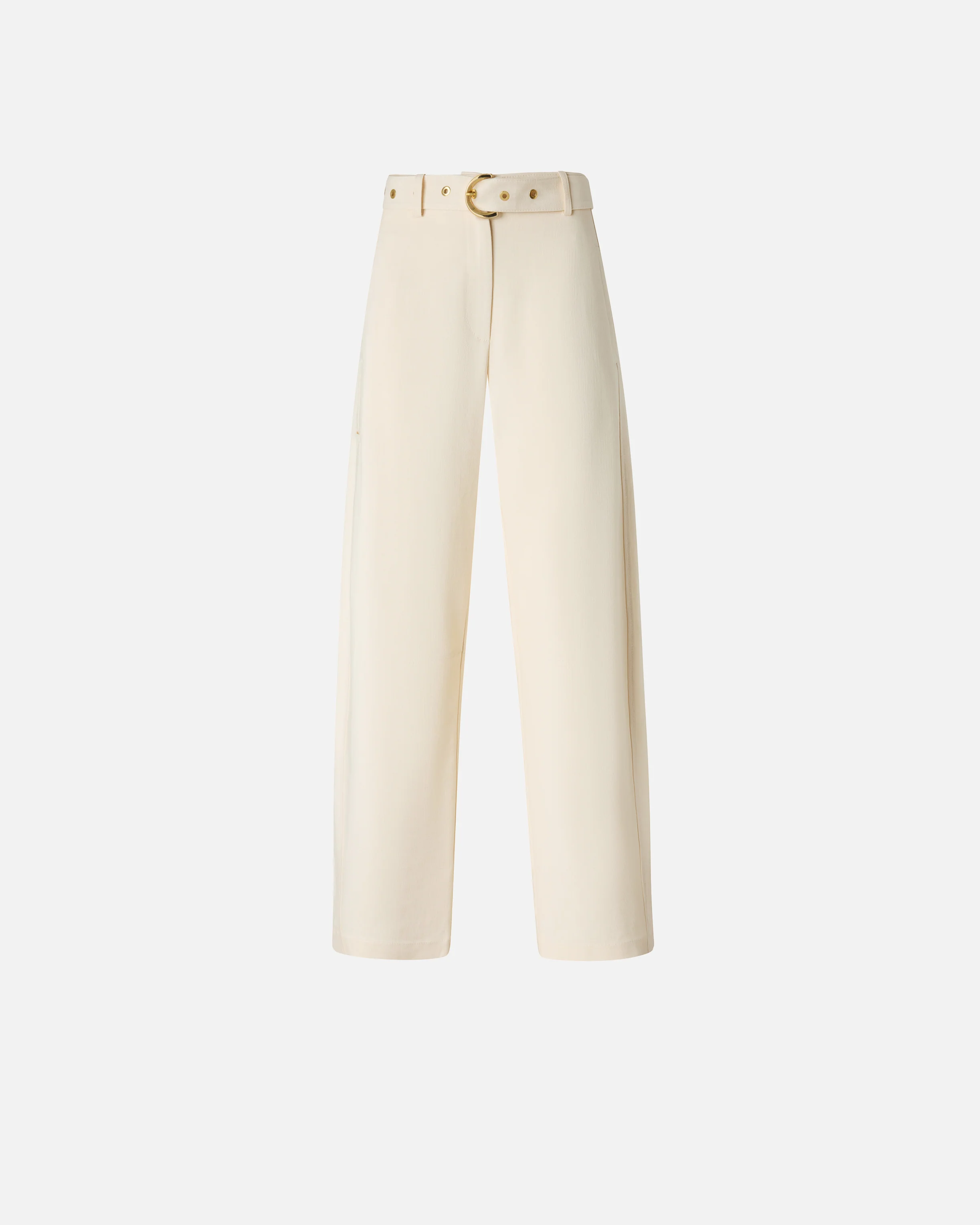 Elemento distintivo del modello è la cintura coordinata rimovibile in tessuto, completata da fibbia e occhielli con finitura dorata che valorizzano il punto vita e donano un tocco luminoso. Un pantalone essenziale e contemporaneo che si presta a look da ufficio, eventi e uscite serali, diventando un vero capo chiave della stagione.