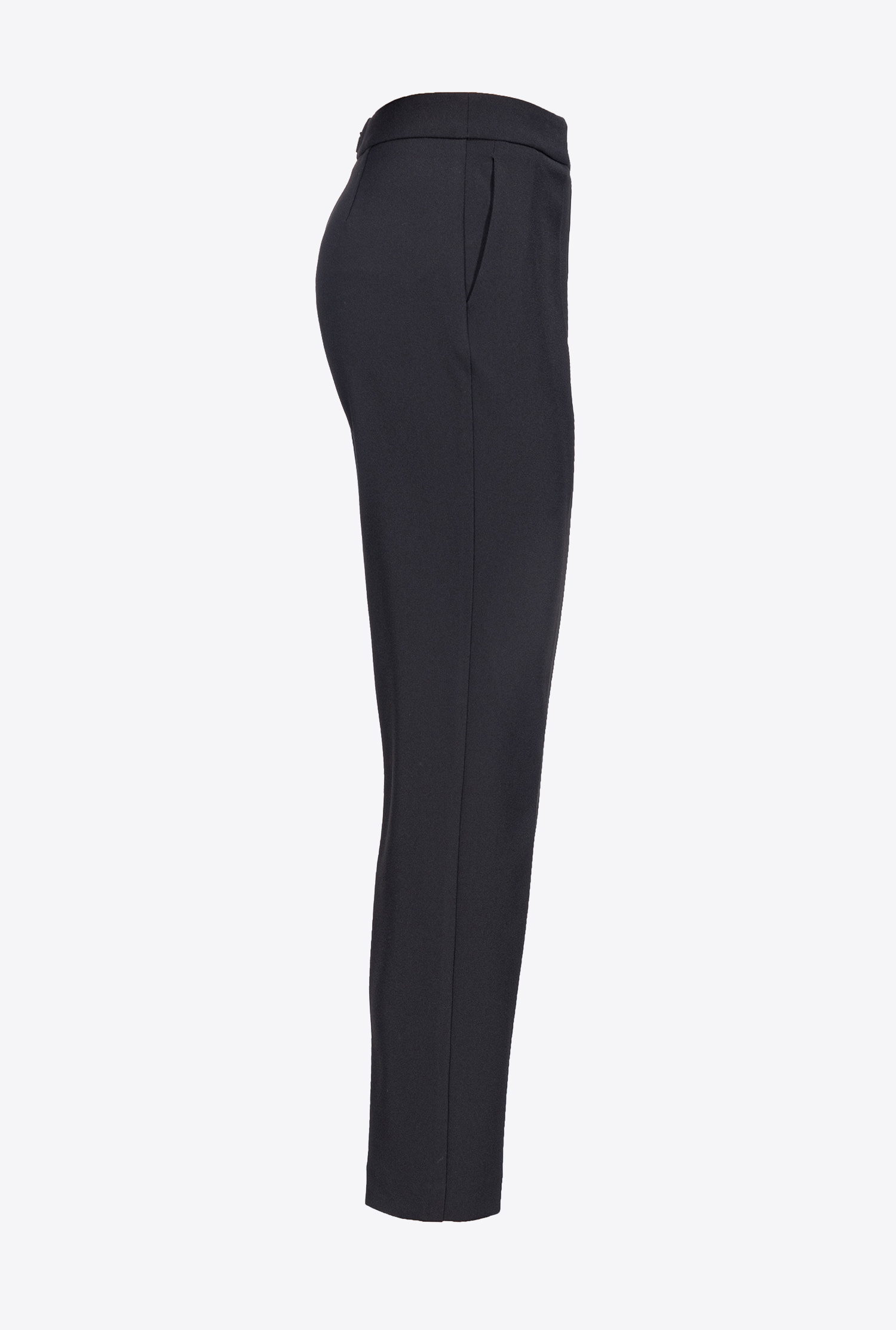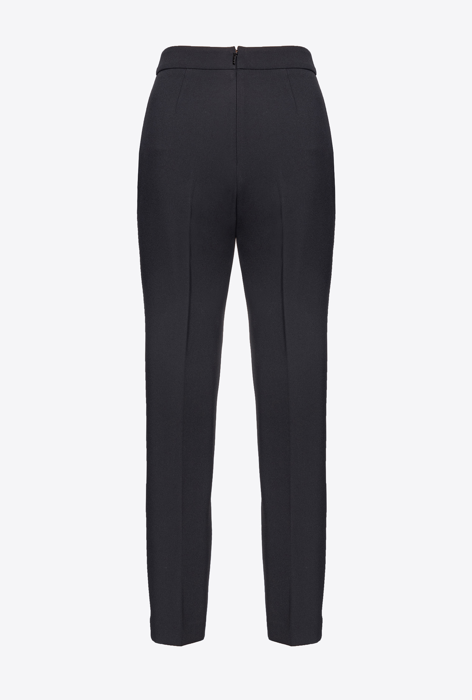 Pantaloni dalla linea affusolata in tessuto crêpe tecnico stretch. Vita alta, tasche alla francese sui fianchi e tasche a filetto sul retro. Gamba dalla linea slim con dettaglio di piega centrale. Chiusura con zip invisibile nel centro dietro.