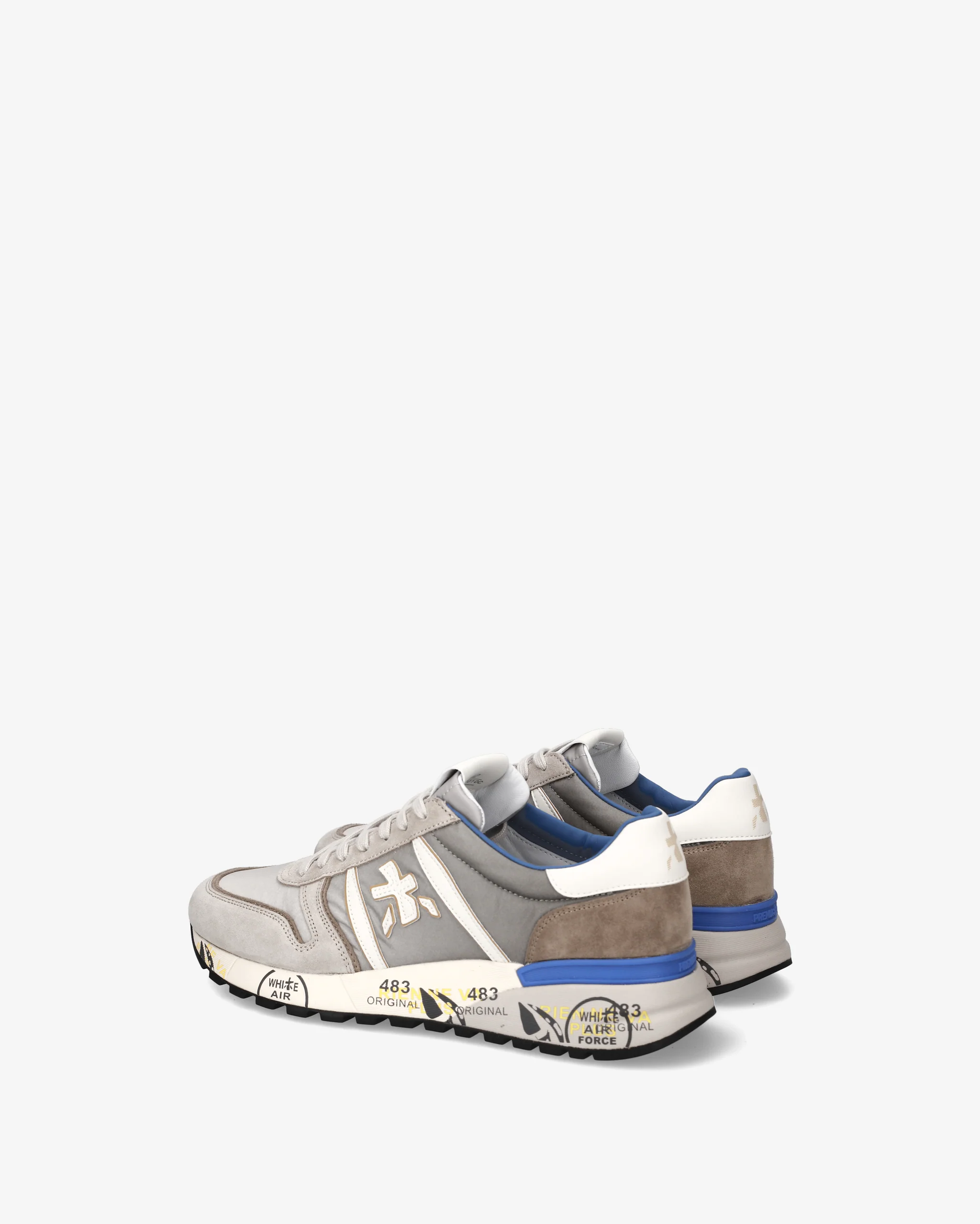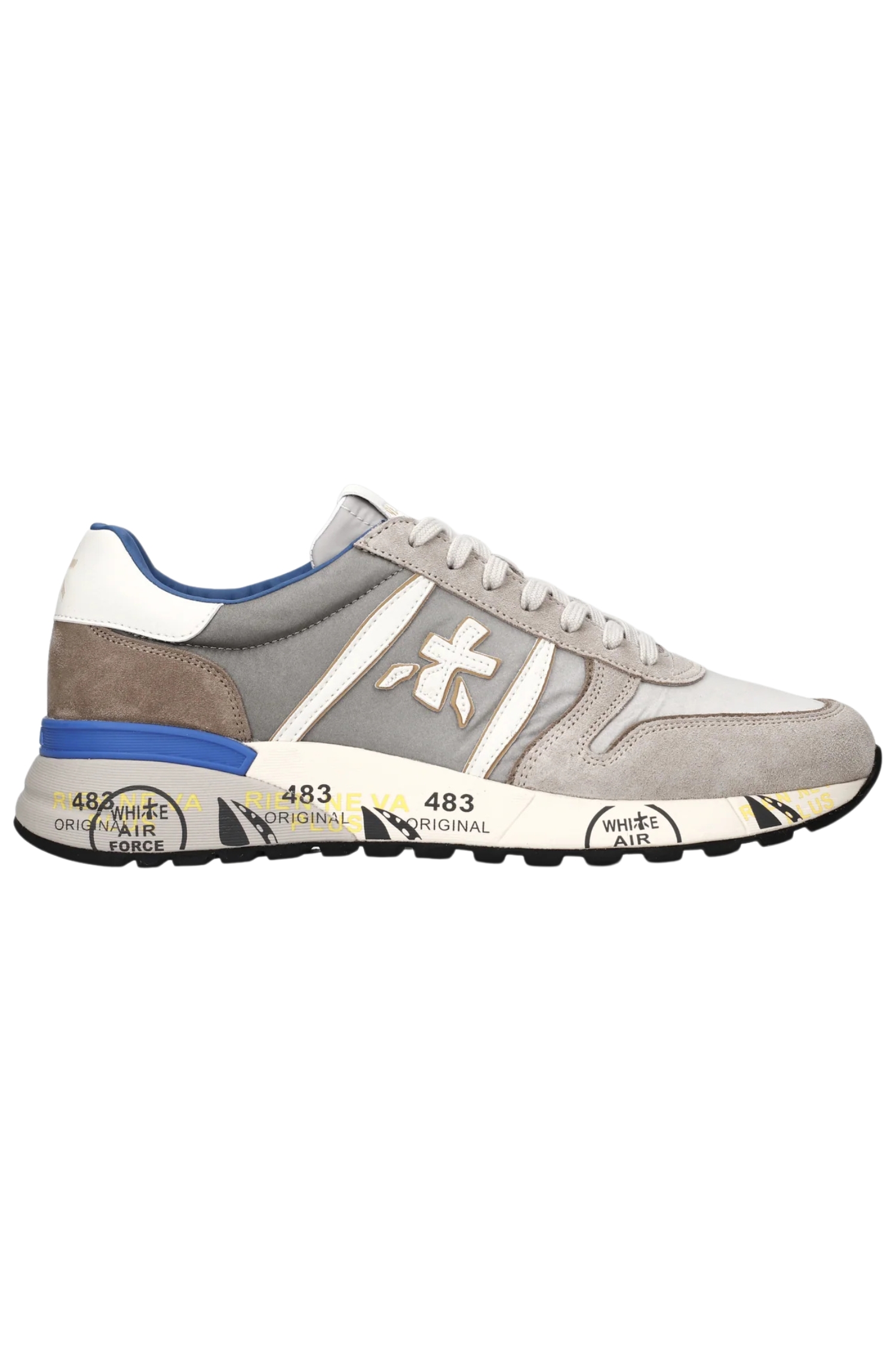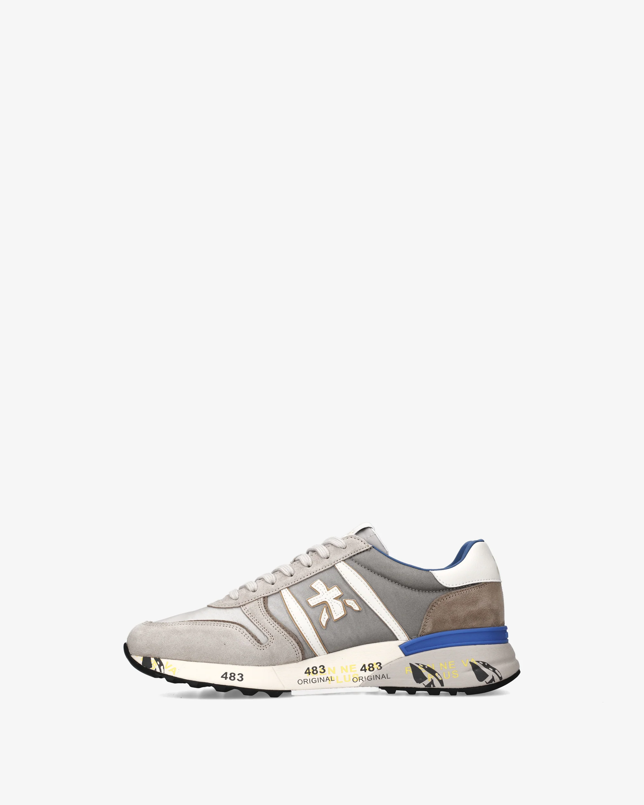 Le Lander 8010 di Premiata sono sneakers running-inspired realizzate in nylon grigio sfumato con inserti in morbida pelle scamosciata grigia e marrone, pensate per un look urbano e sofisticato. La tomaia mixa tessuto tecnico e vitello scamosciato, con il logo Premiata ben visibile che firma il design in modo iconico.