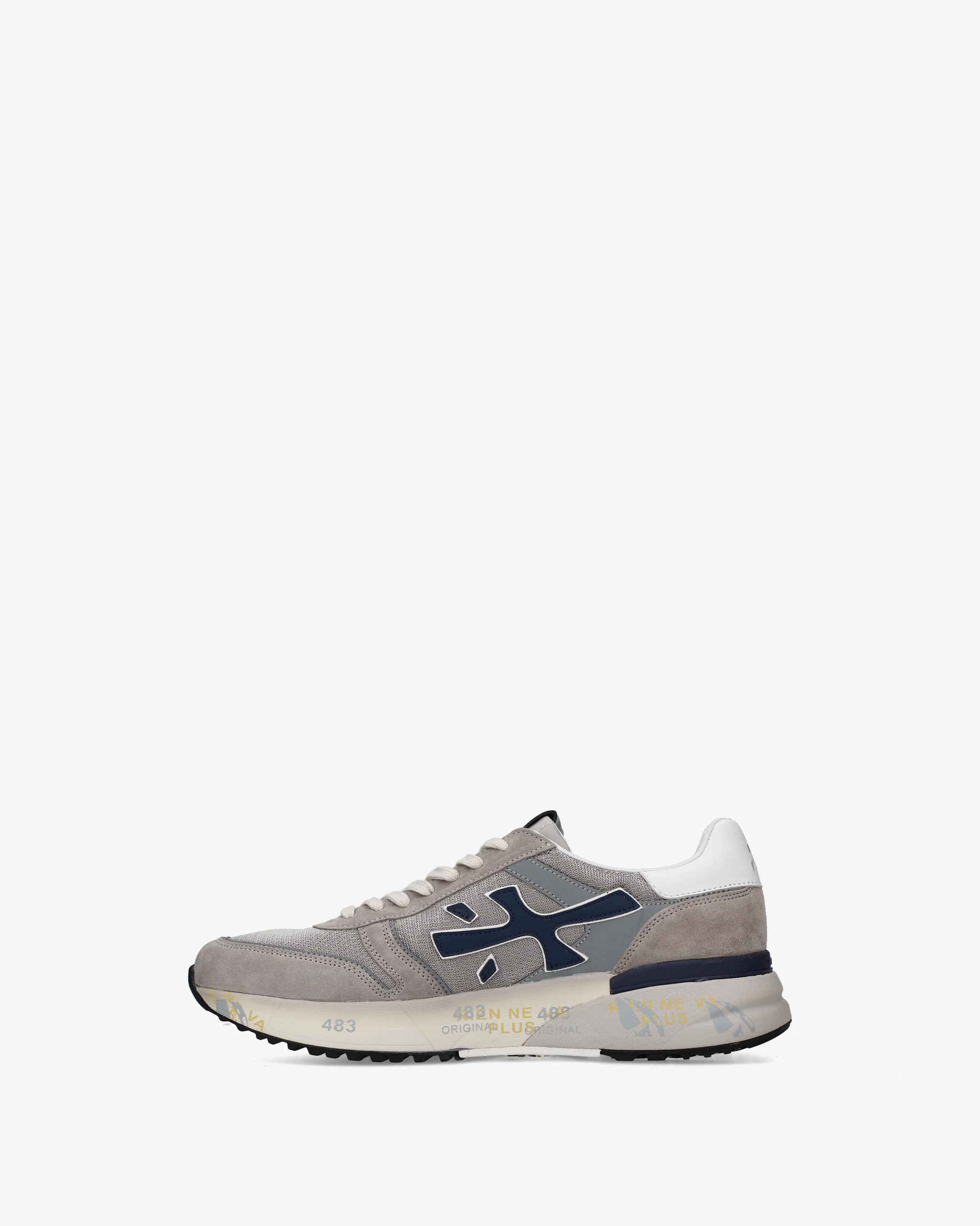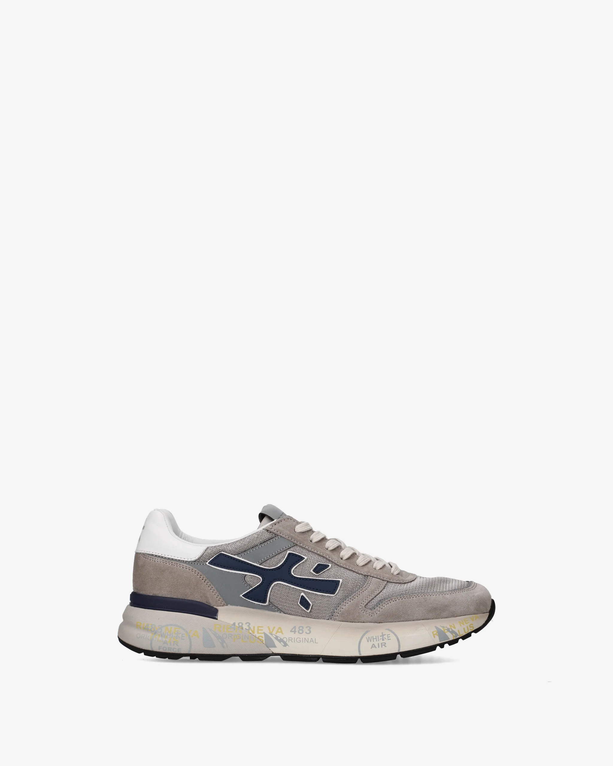 Le Mick 8001 sono sneakers da uomo firmate Premiata, realizzate in pelle scamosciata e tessuto tecnico grigio per un look pulito ma di carattere. La tomaia combina pannelli in pelle di vitello con inserti in poliammide e dettagli in PU (25% calf leather, 55% PA, 20% PU), creando un gioco di texture tipico delle running fashion.