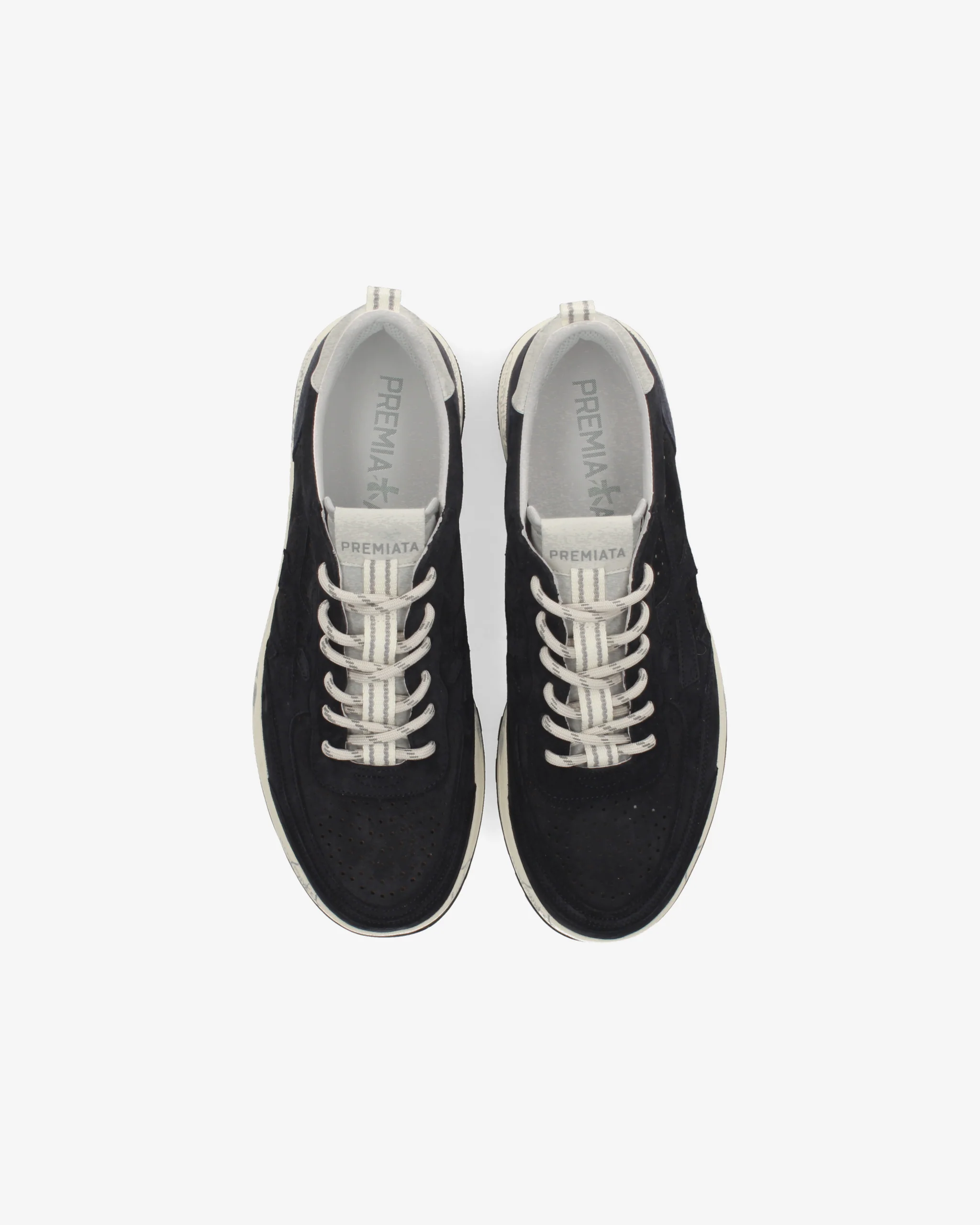 Lo stile essenziale è arricchito dai dettagli iconici Premiata: logo stampato e applicato sui lati, tallone a contrasto e finiture che ne aumentano la visibilità mantenendo una linea sobria. La suola, alta 3,5 cm, è composta per il 70% da EVA e per il 30% da gomma, garantendo leggerezza, ammortizzazione e grip su base running.