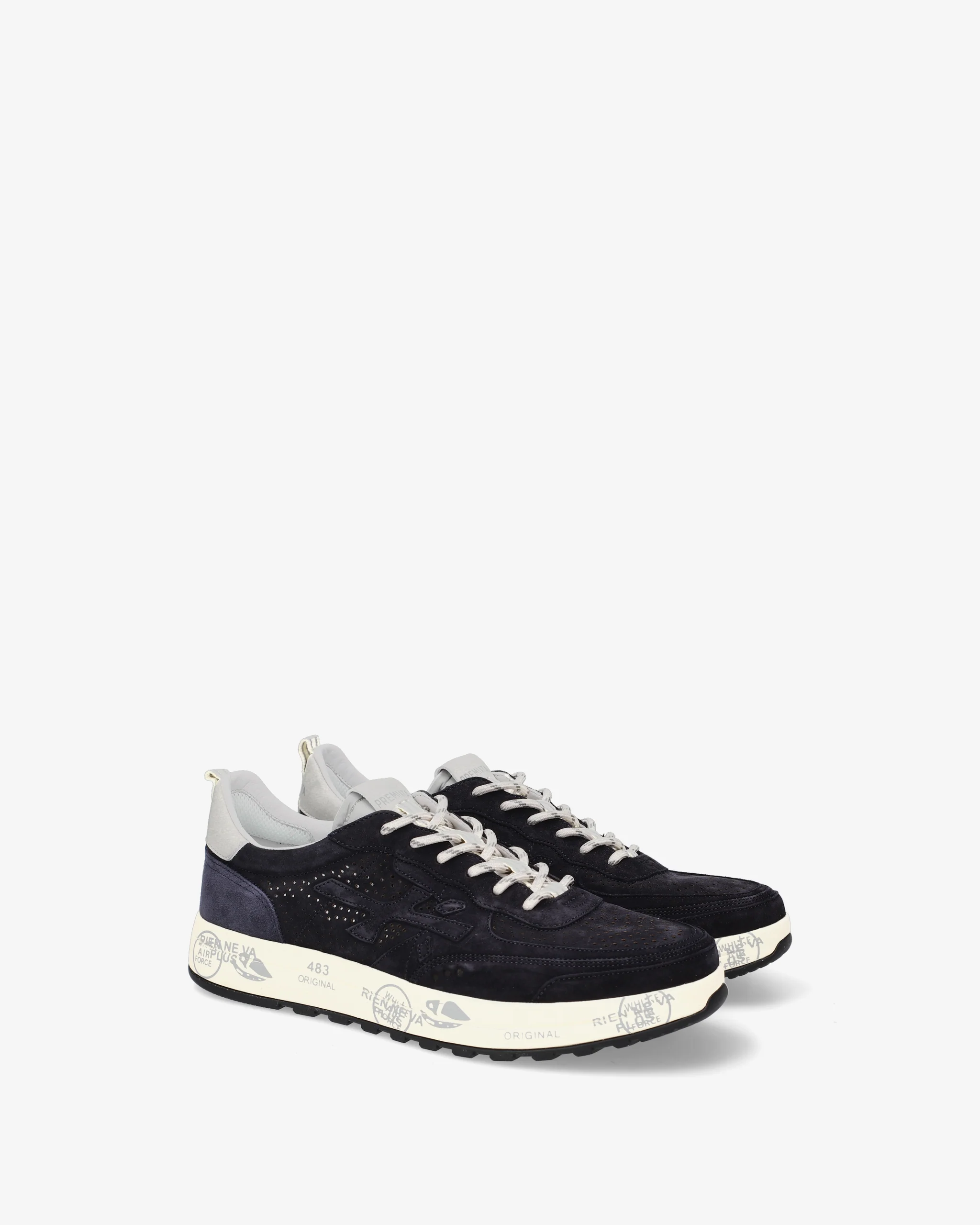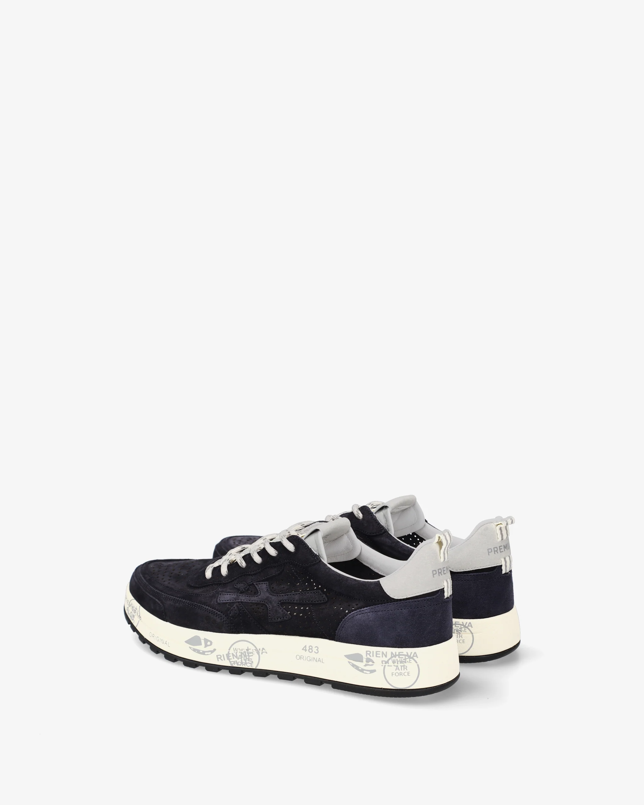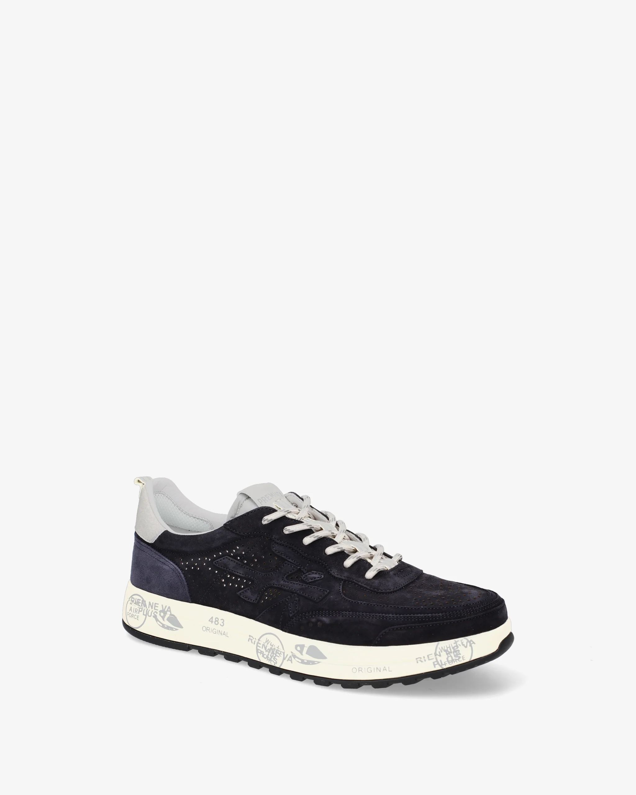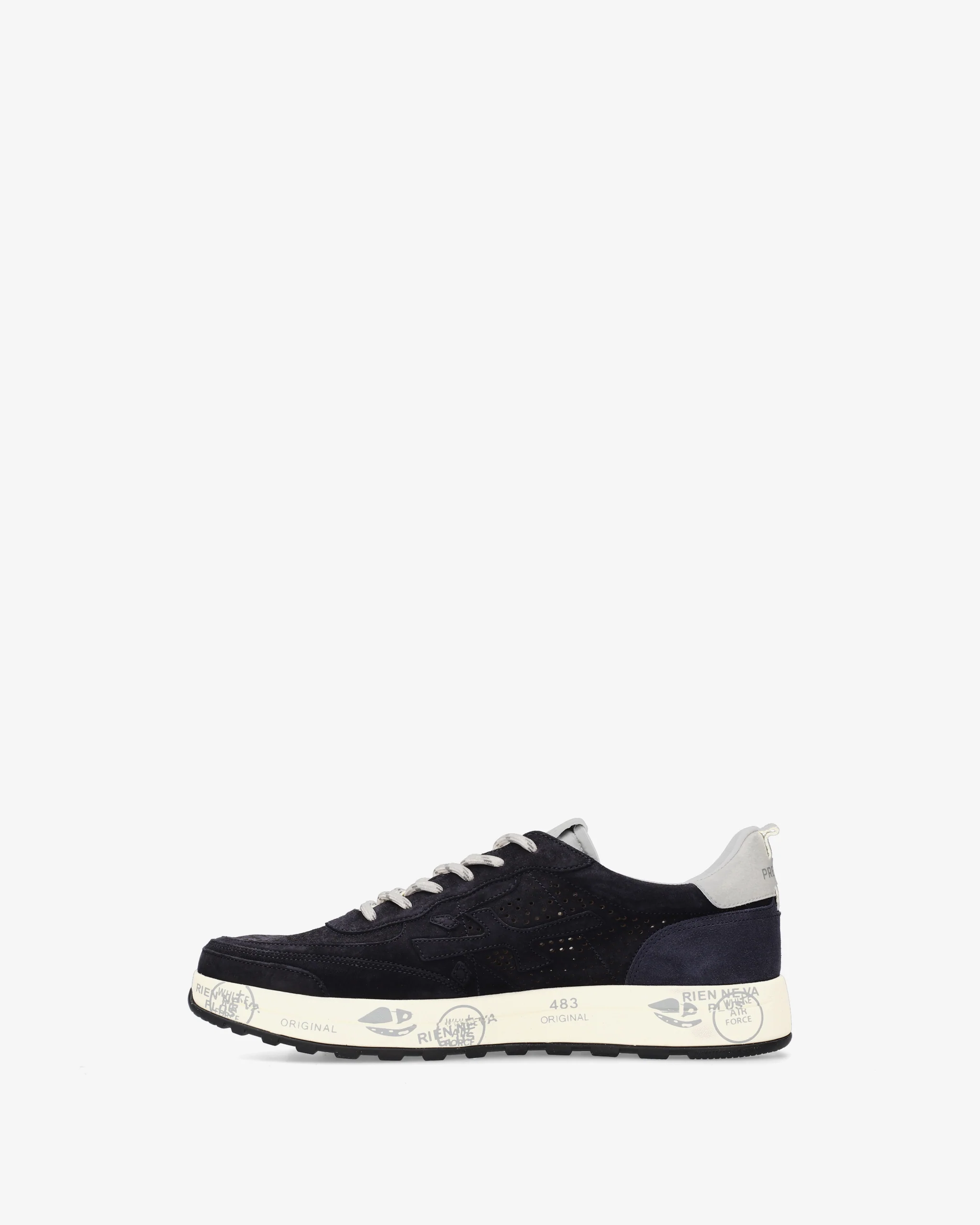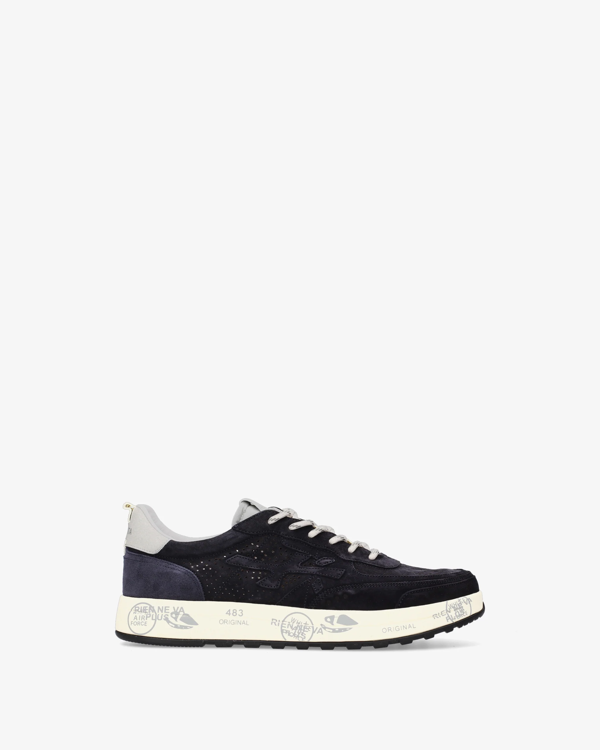 Dalla continua ricerca di raffinatezza e innovazione di Premiata nasce la Nous 8289, una cassetta-running dal profilo pulito, ordinato ed estremamente funzionale. La tomaia è realizzata in prevalenza in pelle scamosciata (pigskin) blu navy, con inserti in TPU, poliammide e pelle di vitello che aggiungono struttura e resistenza.