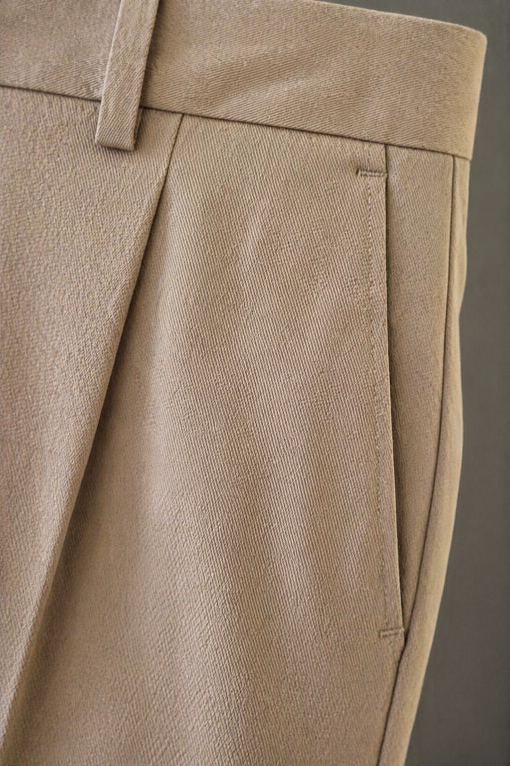 Il tessuto appare compatto e leggermente strutturato, con una finitura pulita che valorizza il colore beige chiaro. La tonalità neutra lo rende estremamente versatile, adatto sia a contesti formali che a look più rilassati ma curati.