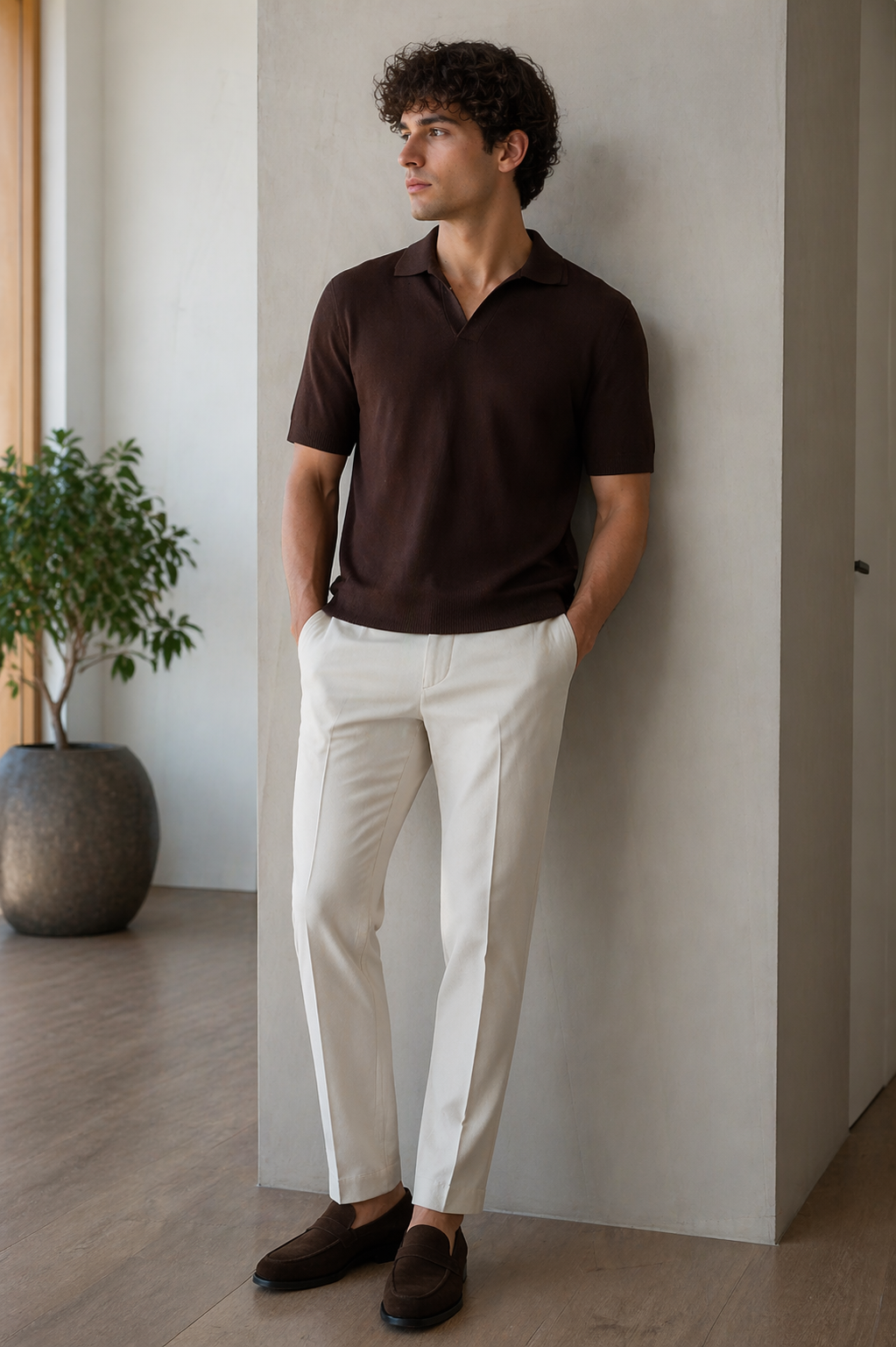 La vita strutturata con chiusura zip e bottone garantisce stabilità e vestibilità, mentre il taglio della gamba, regolare e leggermente affusolato, crea un profilo ordinato e moderno. Il tessuto in cotone stretch assicura comfort durante tutta la giornata, adattandosi ai movimenti senza perdere la forma.