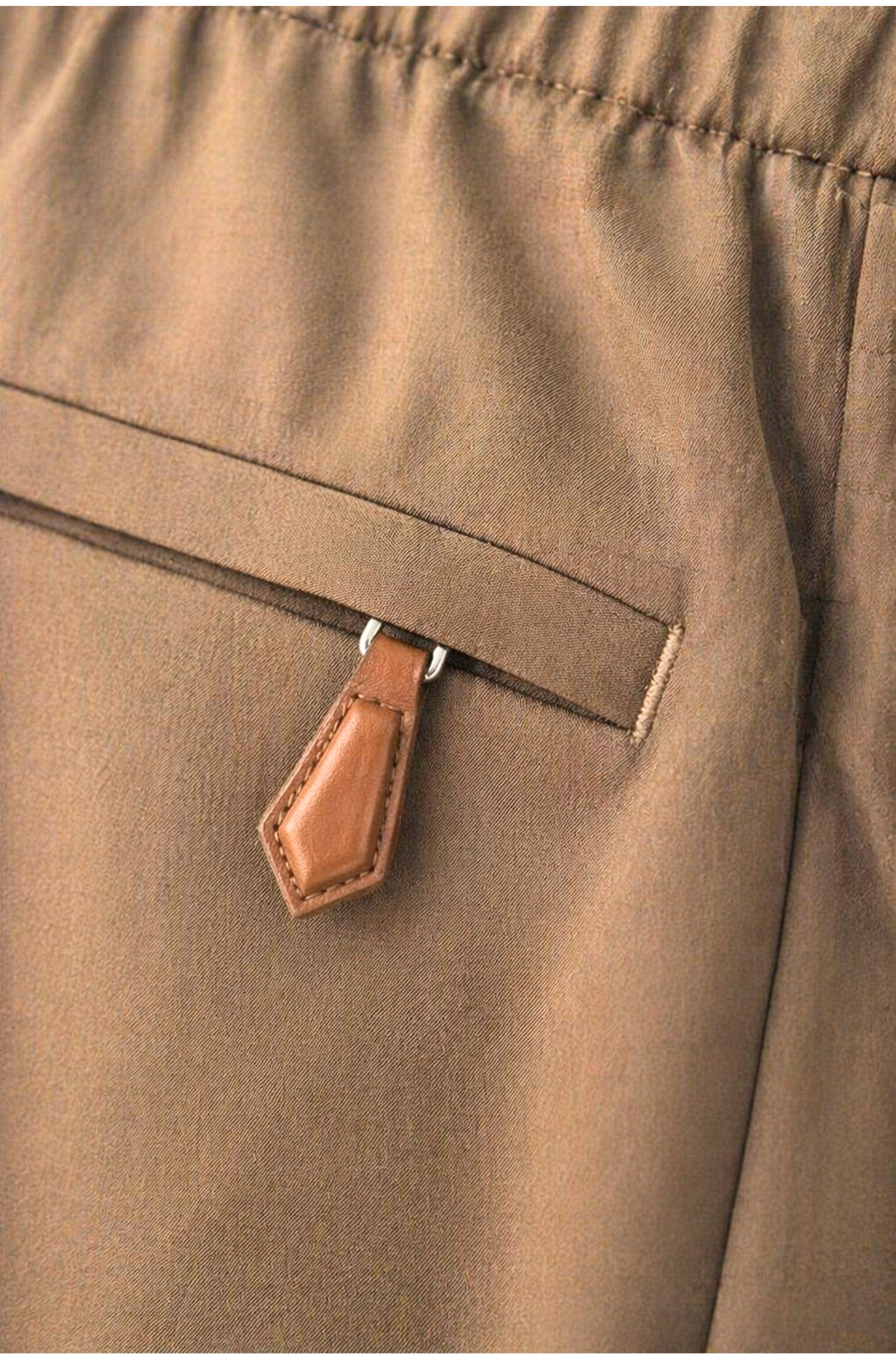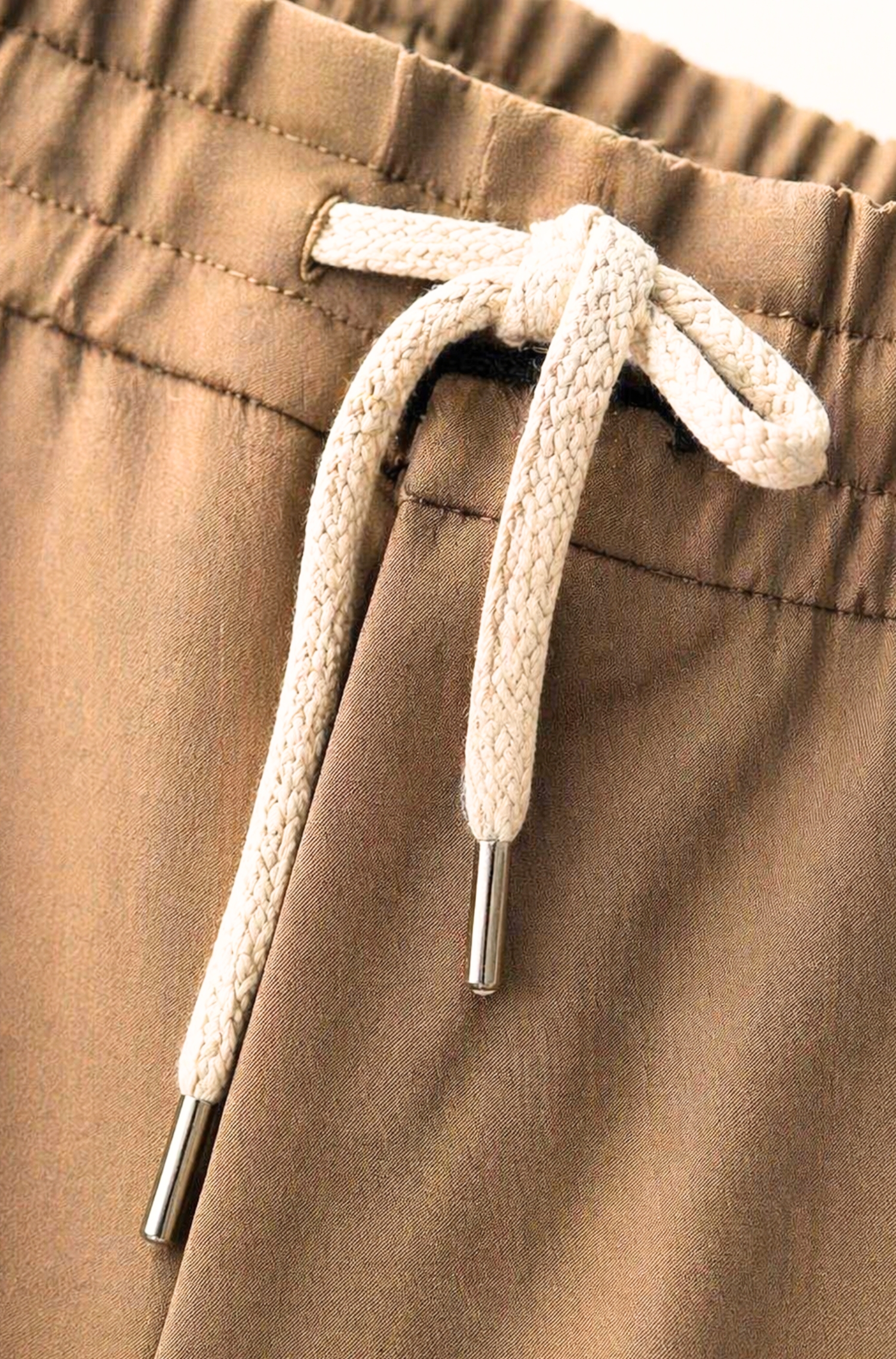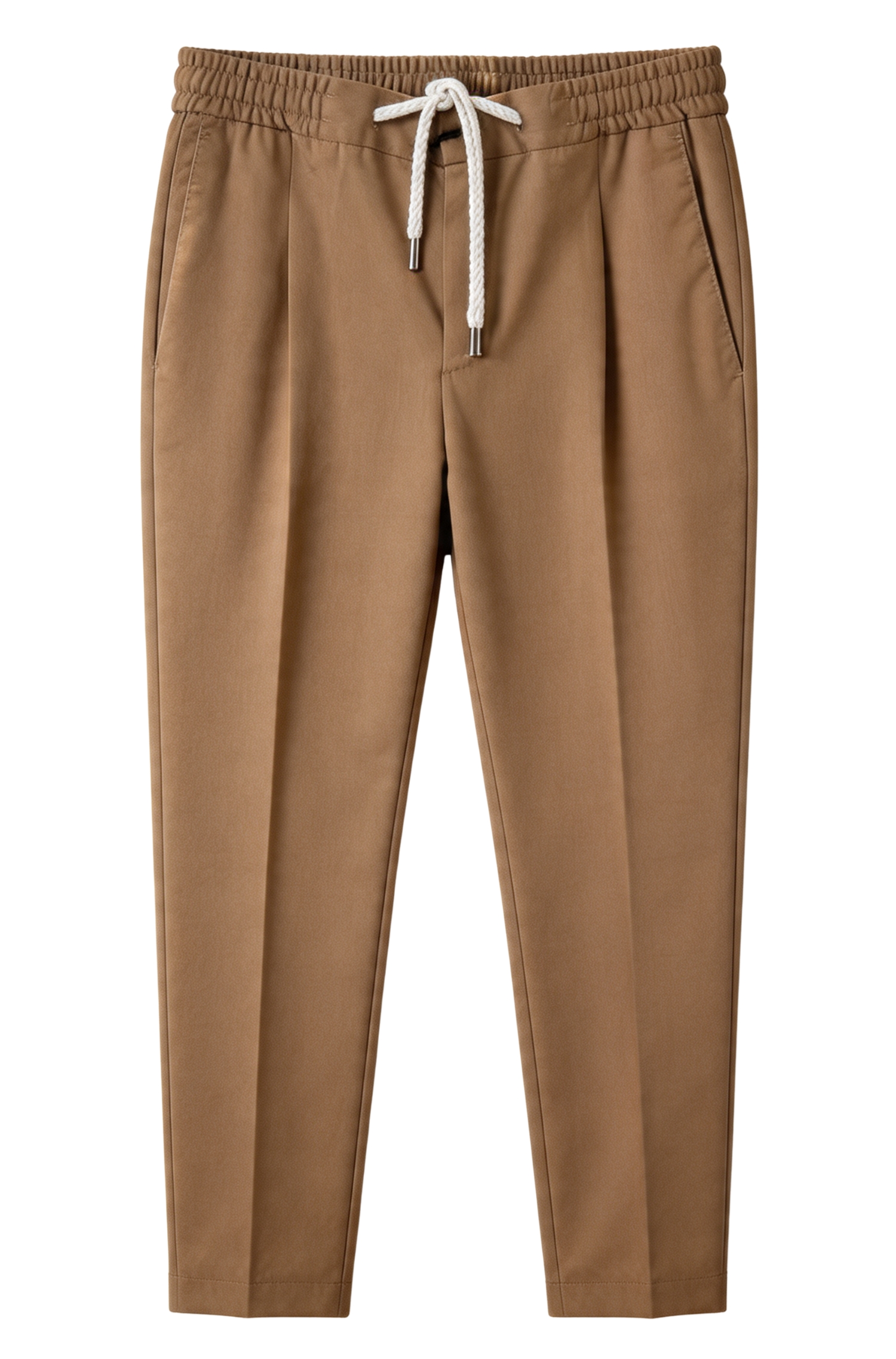 Il design presenta una vita elasticizzata con coulisse regolabile, che lo rende estremamente pratico e adattabile. Il taglio è asciutto e affusolato, pensato per mantenere una linea ordinata e moderna, perfetta sia in contesti casual che smart.