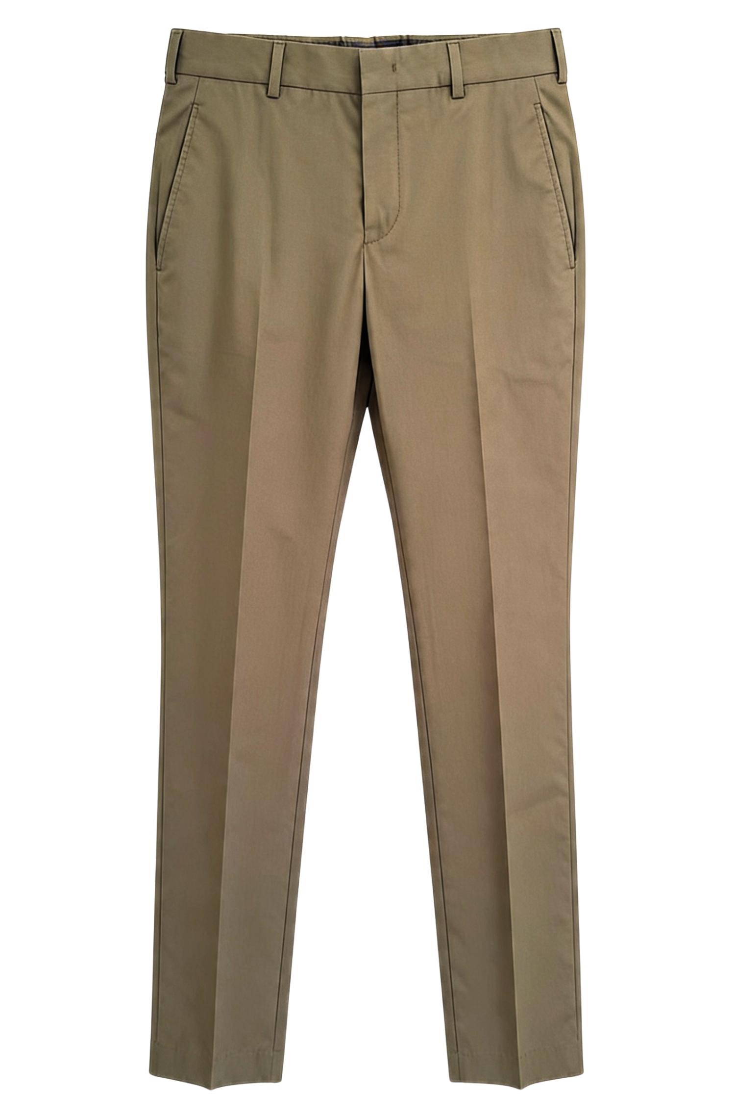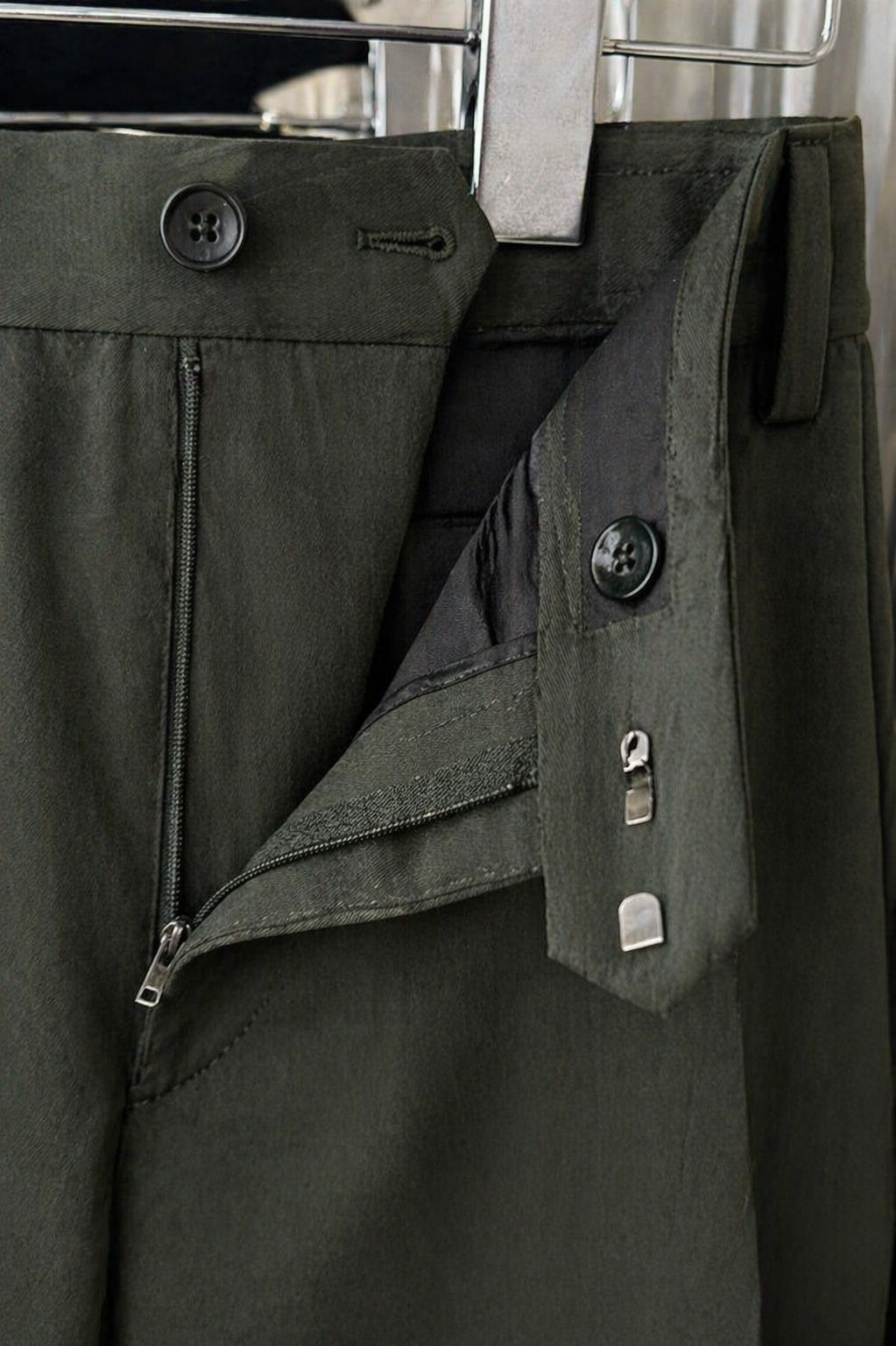 La struttura presenta una linea asciutta con gamba leggermente affusolata, ideale per accompagnare il movimento mantenendo un aspetto ordinato. La vita è dotata di passanti per cintura e chiusura con zip, bottone e controbottone interno, garantendo stabilità e precisione nella vestibilità.