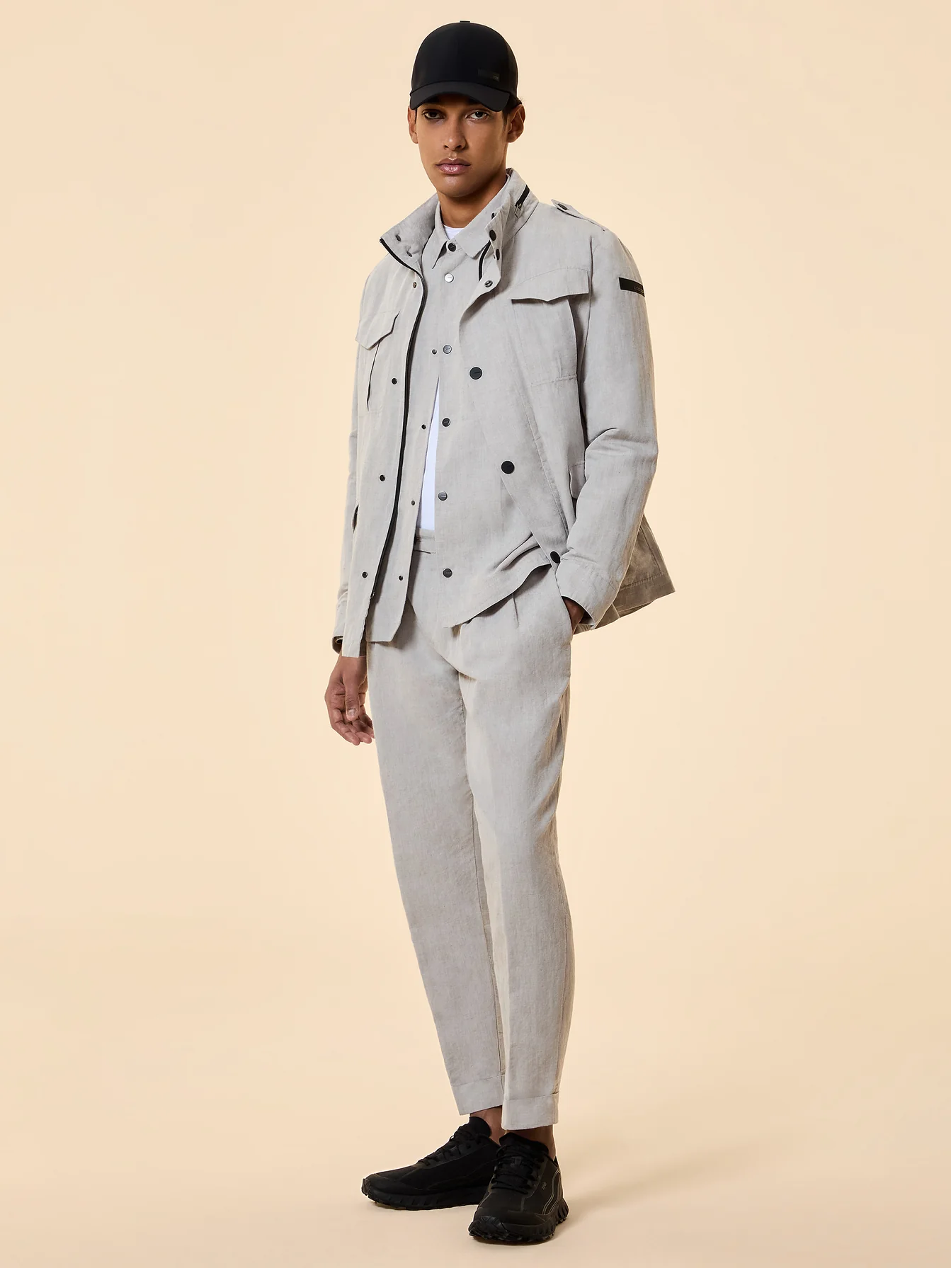 Quattro tasche a soffietto con aletta a toppa sul petto e sul fondo frontale aggiornano il design in chiave utility contemporanea, mentre le spalline sulle spalle richiamano il DNA militare della field jacket. Allinterno, nastrature selettive e inserti in tessuti tecnici elasticizzati conferiscono struttura e libertà di movimento, con fodera in poliammide ed elastan studiata per seguire il corpo.
