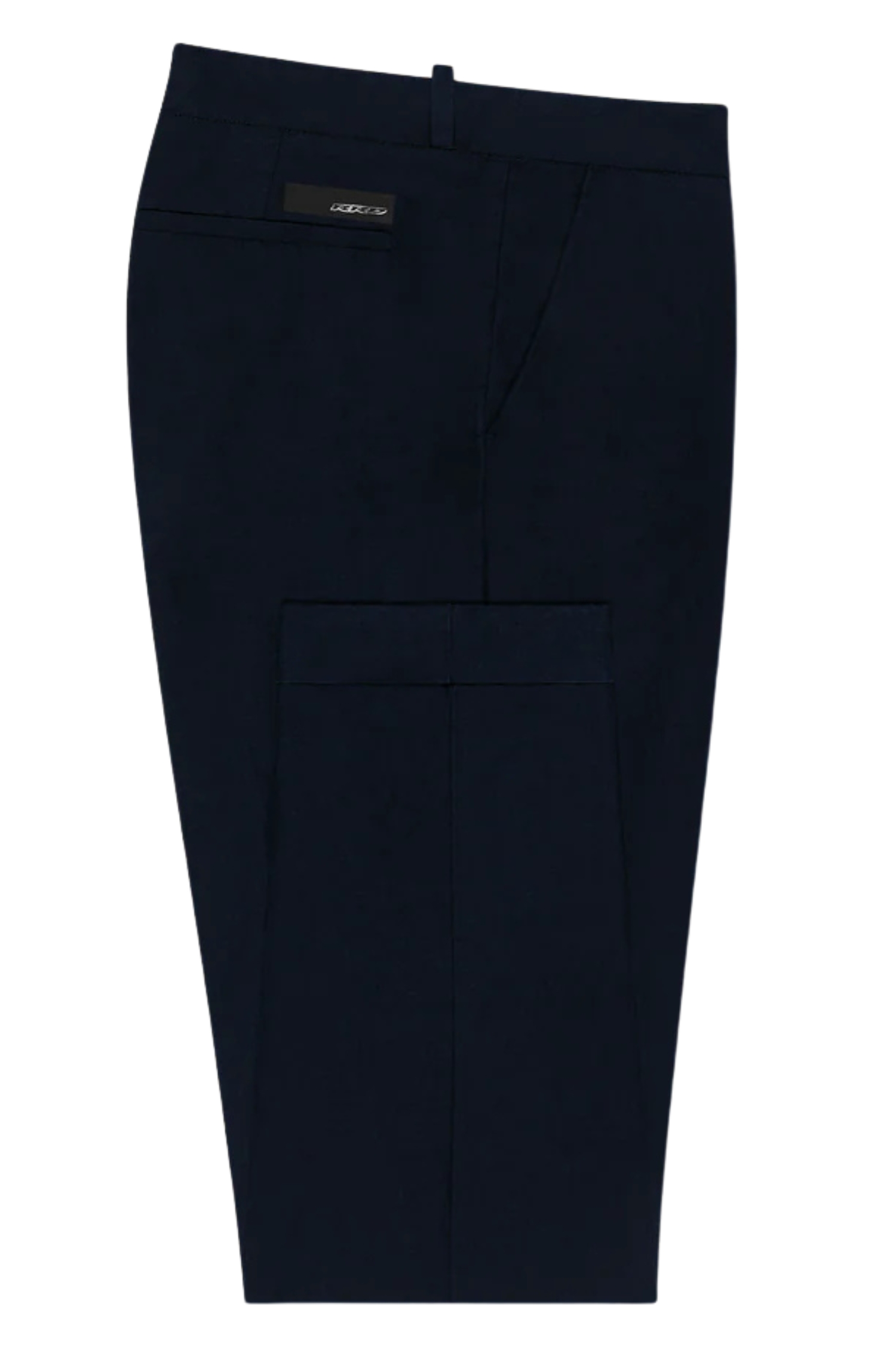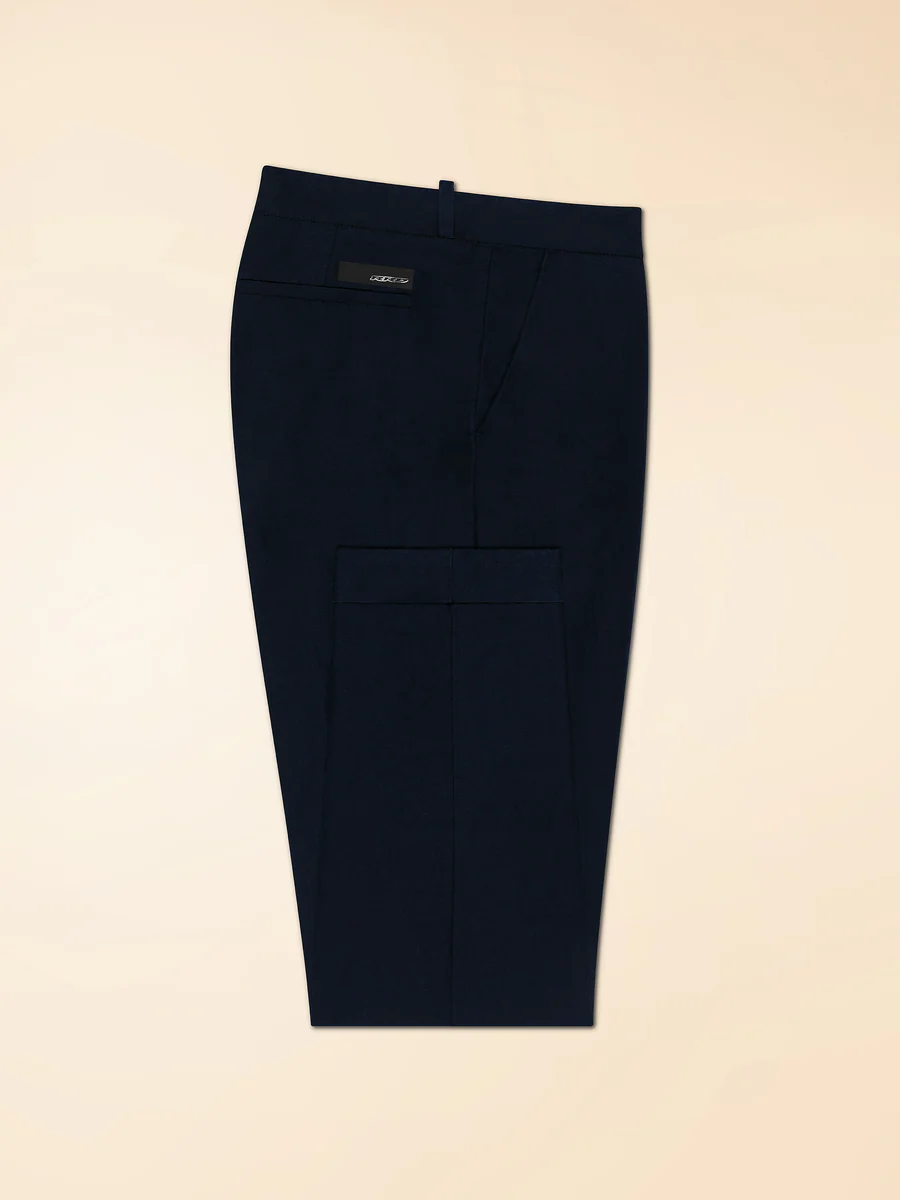 La cintura con passanti chiusa da bottoni in corno e la chiusura frontale con zip nascosta dalla pattina esprimono essenzialità e cura sartoriale. Sul davanti, le tasche laterali alla francese mantengono un profilo pulito, mentre sul retro le tasche a filetto sono impreziosite dallemblematico logo a microiniezione nero sulla destra, che firma il capo con discrezione.