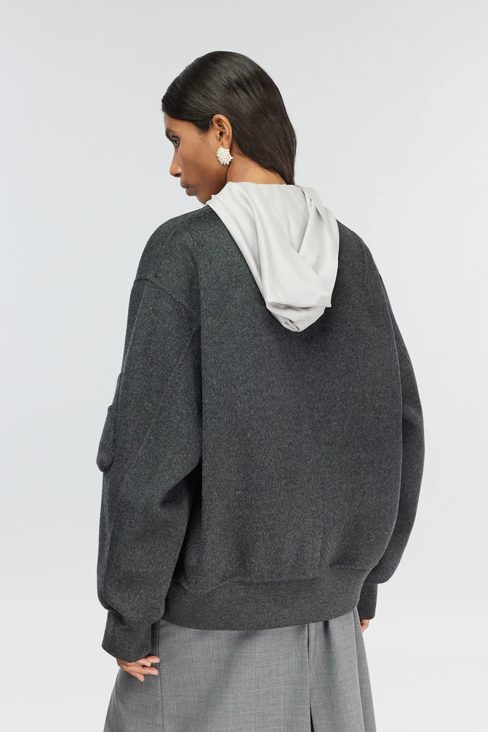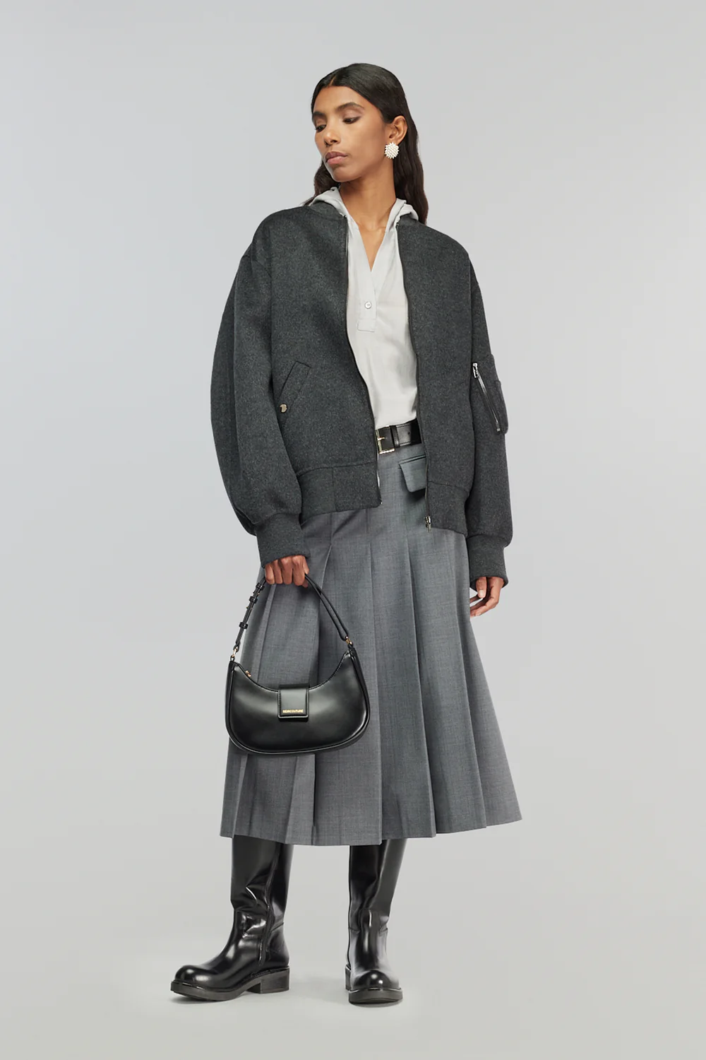 Il Bomber Azalea reinterpreta un classico dello stile sportivo in chiave sofisticata. Realizzato in 100% lana con fodera in poliestere, offre calore, struttura e morbidezza senza rinunciare alla leggerezza tipica del panno doppio. Il taglio over e la lunghezza al bacino donano unaria rilassata e moderna, mentre i dettagli sartoriali come le tasche a filetto e la zip frontale esaltano la pulizia delle linee. Un capo Made in Italy pensato per accompagnare con stile i look di tutti i giorni, perfetto da abbinare a pantaloni ampi o gonne midi per uneleganza casual dal fascino contemporaneo.