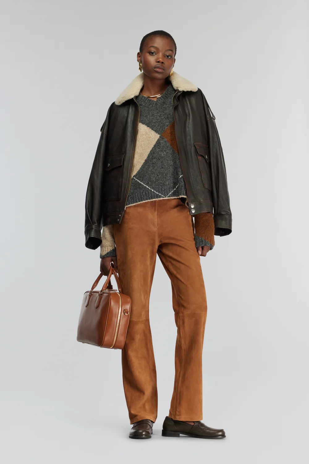 La Maglia Gaston di Semicoture è un perfetto equilibrio tra tradizione e modernità. Realizzata in filato misto alpaca, lana e poliammide, offre una texture morbida, calda e piacevolmente soffice, ideale per la stagione fredda. Il motivo jacquard a rombi dona profondità e carattere, mentre il taglio boxy fit e la lunghezza al bacino creano una silhouette rilassata e moderna. Lo scollo a V e le maniche lunghe completano il design, rendendo questo maglione versatile e sofisticato, perfetto da indossare con pantaloni sartoriali o denim per uneleganza casual dal gusto contemporaneo.