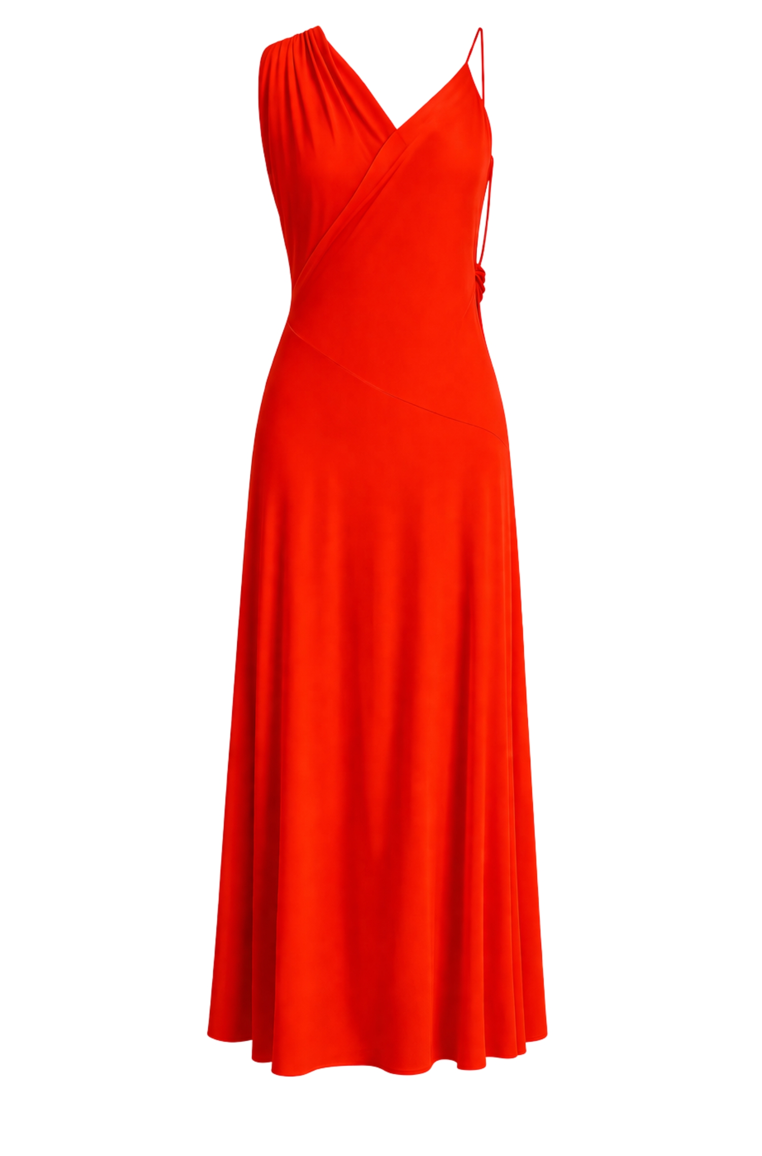 La scollatura con dettaglio particolare sul davanti è il punto focale del modello: disegna il décolleté con un taglio profondo ma studiato, ideale per occasioni speciali e look da invitata. Il modello svasato al fondo crea volume controllato sulla parte inferiore, bilanciando la parte alta più strutturata e slanciando visivamente la silhouette.