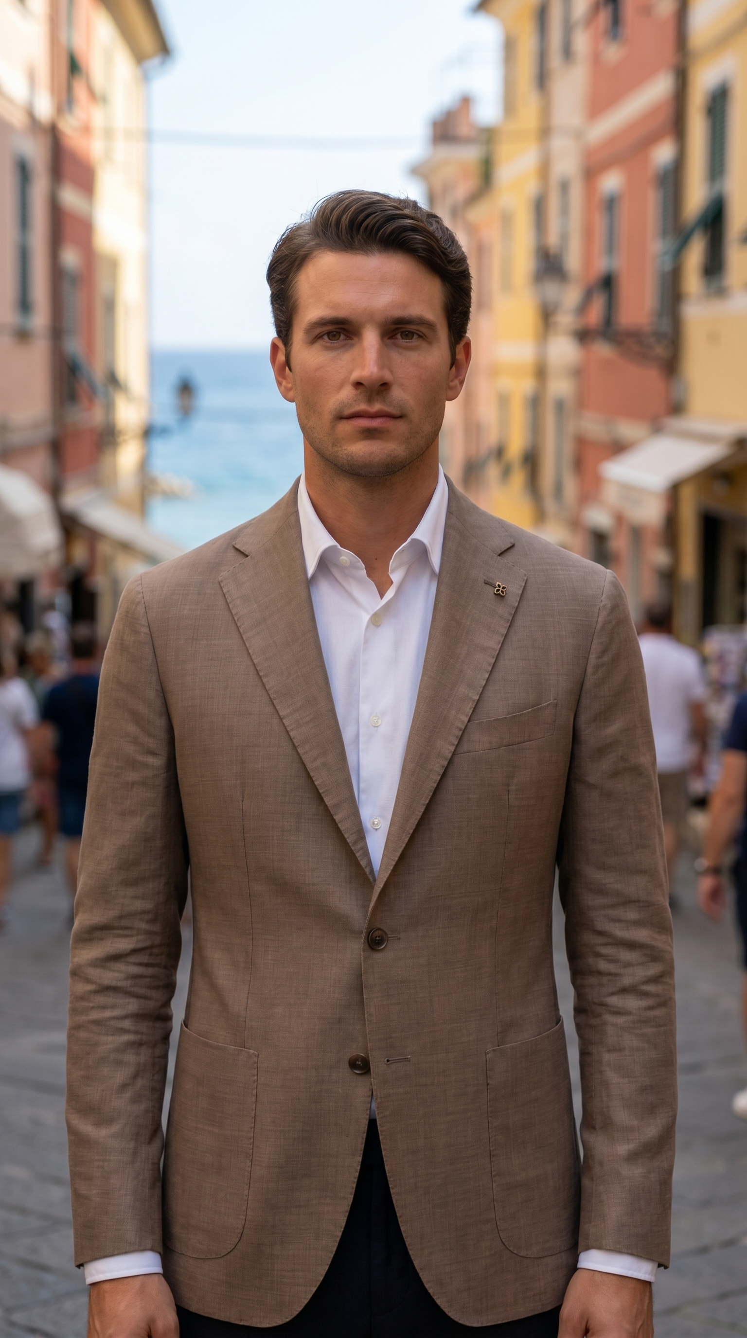 La costruzione segue i canoni delleccellenza italiana: rever classico, chiusura a due bottoni e vestibilità slim che valorizza la figura con naturalezza. Le tasche applicate aggiungono un tocco moderno, rendendo il capo versatile e adatto sia a contesti formali che casual.