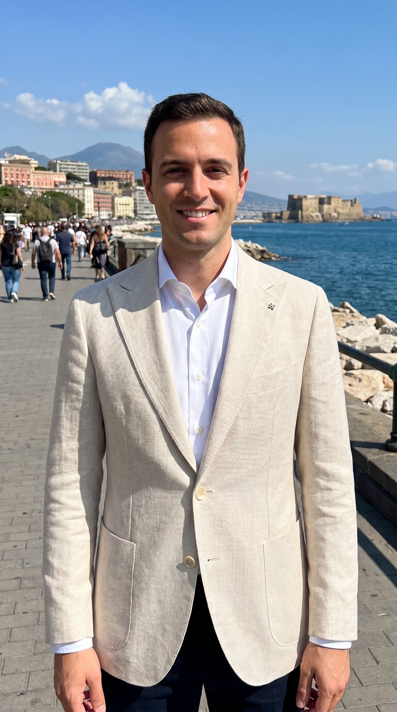 Il design segue la tradizione sartoriale italiana: rever classico, chiusura a due bottoni e una vestibilità slim che accompagna la figura in modo naturale. Le tasche applicate aggiungono un tocco contemporaneo, rendendo il capo adatto anche a contesti meno formali.