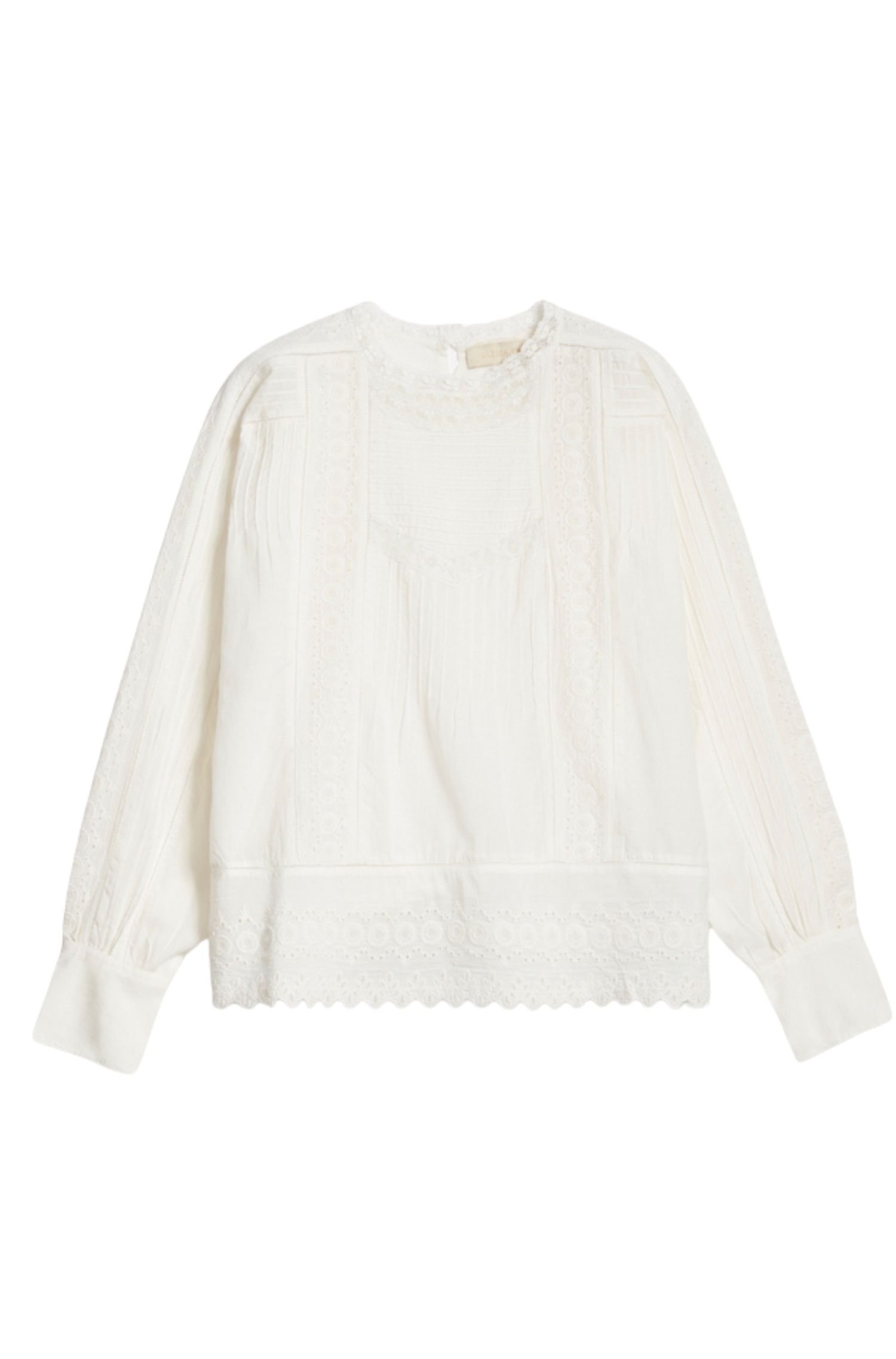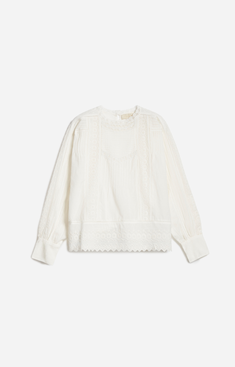 Dettagli plissettati e ricami su busto, braccia e fondo della blusa